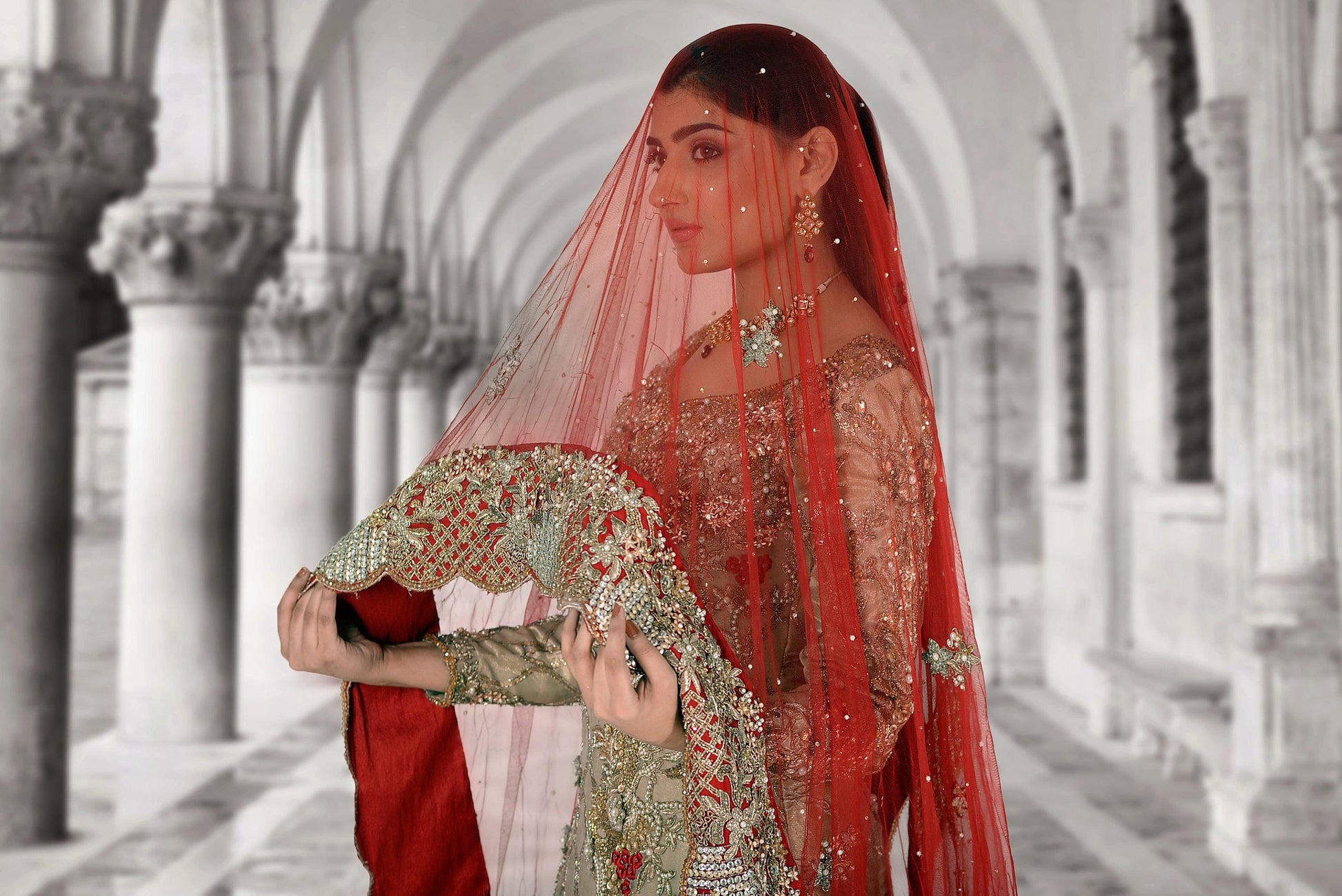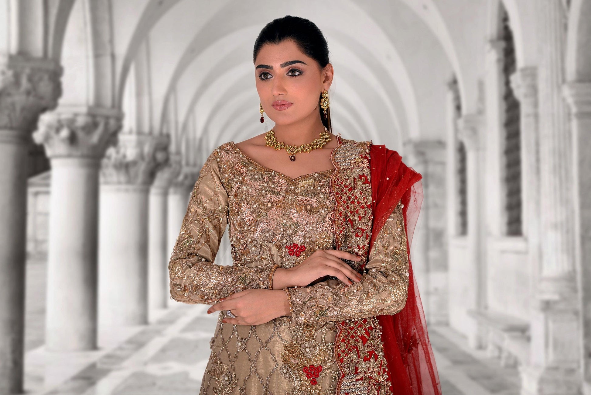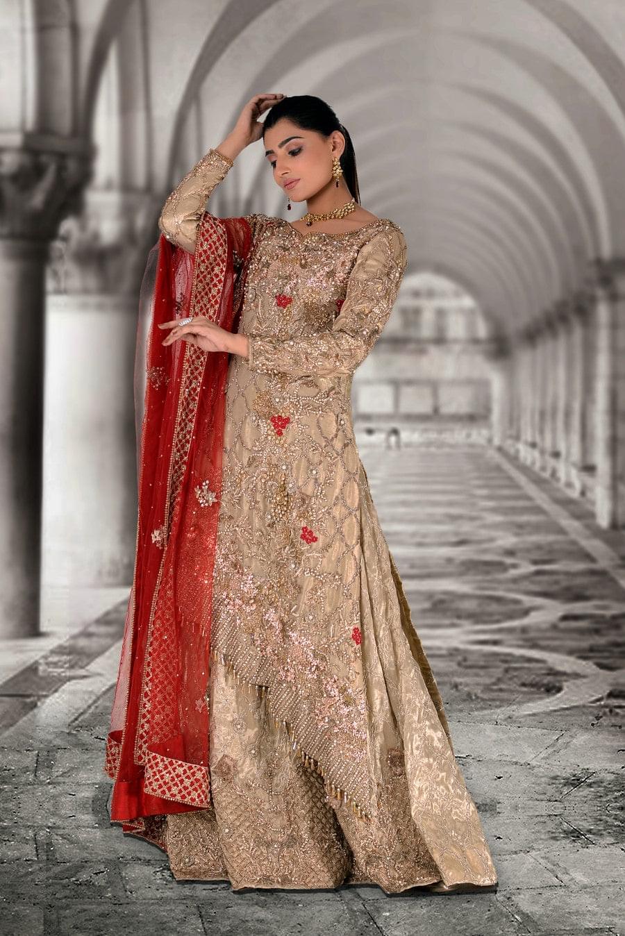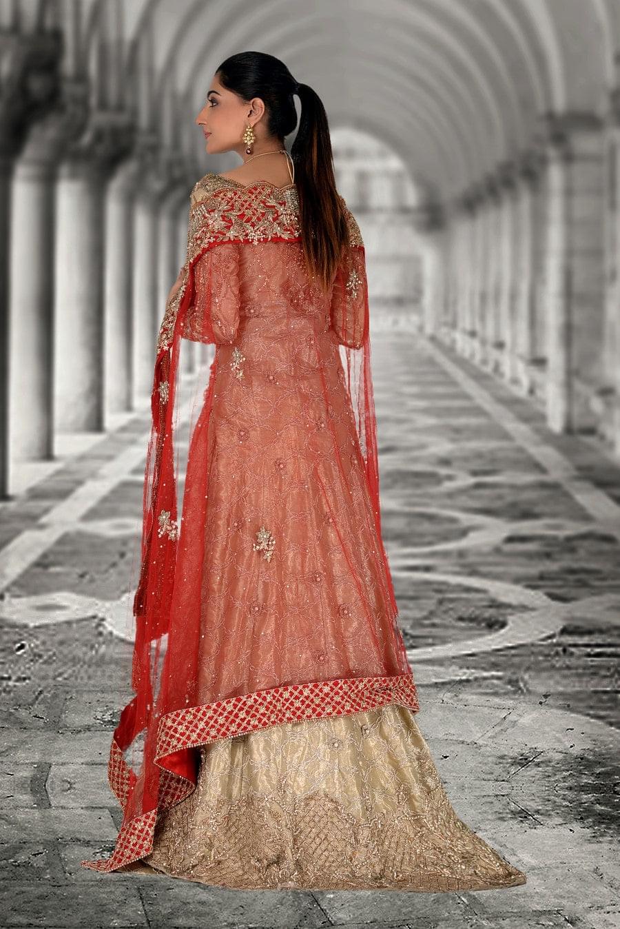 A classic combination of dull gold and red. Heavily hand-worked on the front and back, this bridal features a long shirt and a floor length lehnga. Curated from tissue and net, the front pallu of the dupatta is heavily decorated with sequins and hand work.