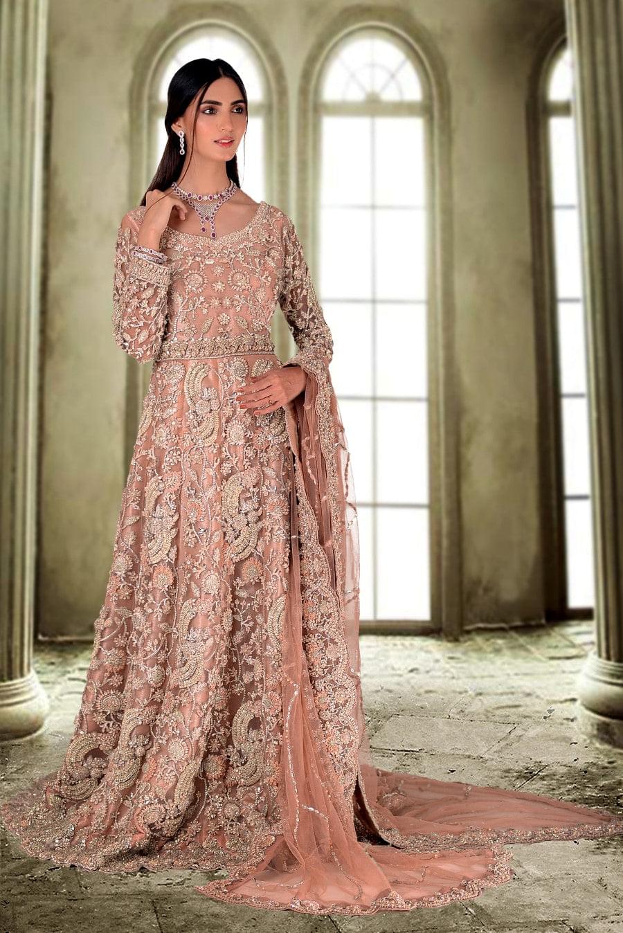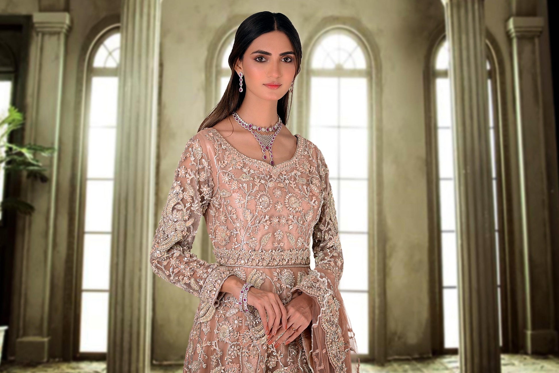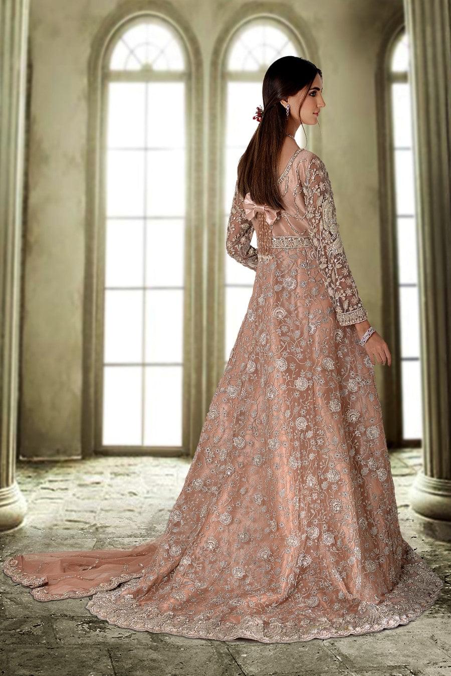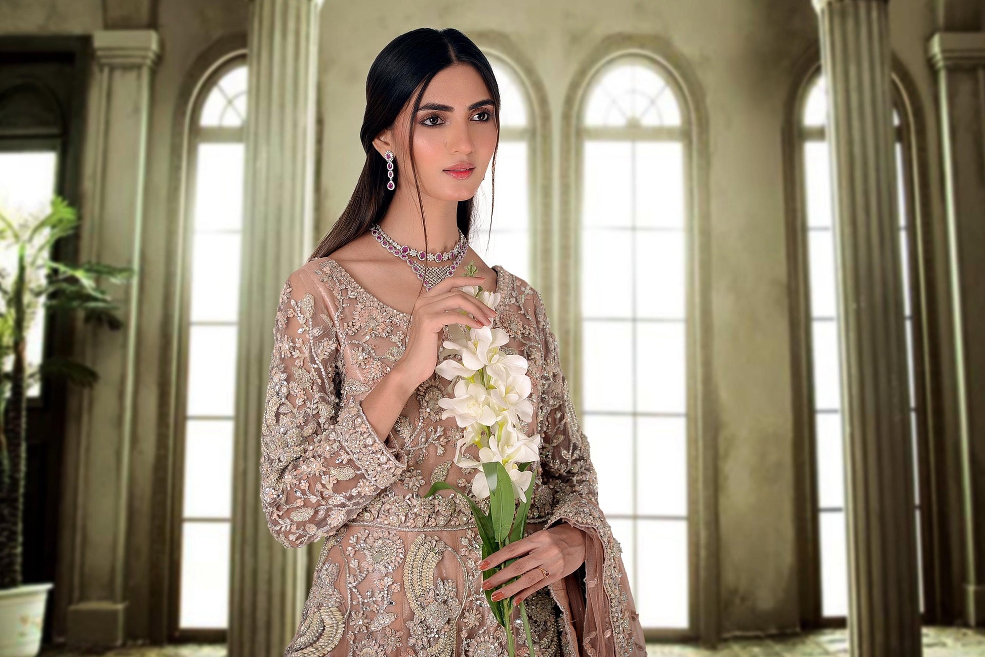 A perfect bridal for a day wedding or valima, this baby pink and silver bridal is sure to make heads turn! Curated from the finest net and tissue, and fully handworked from head to toe. The Dupatta is made from net and has a heavy border, and sequin lines all over.