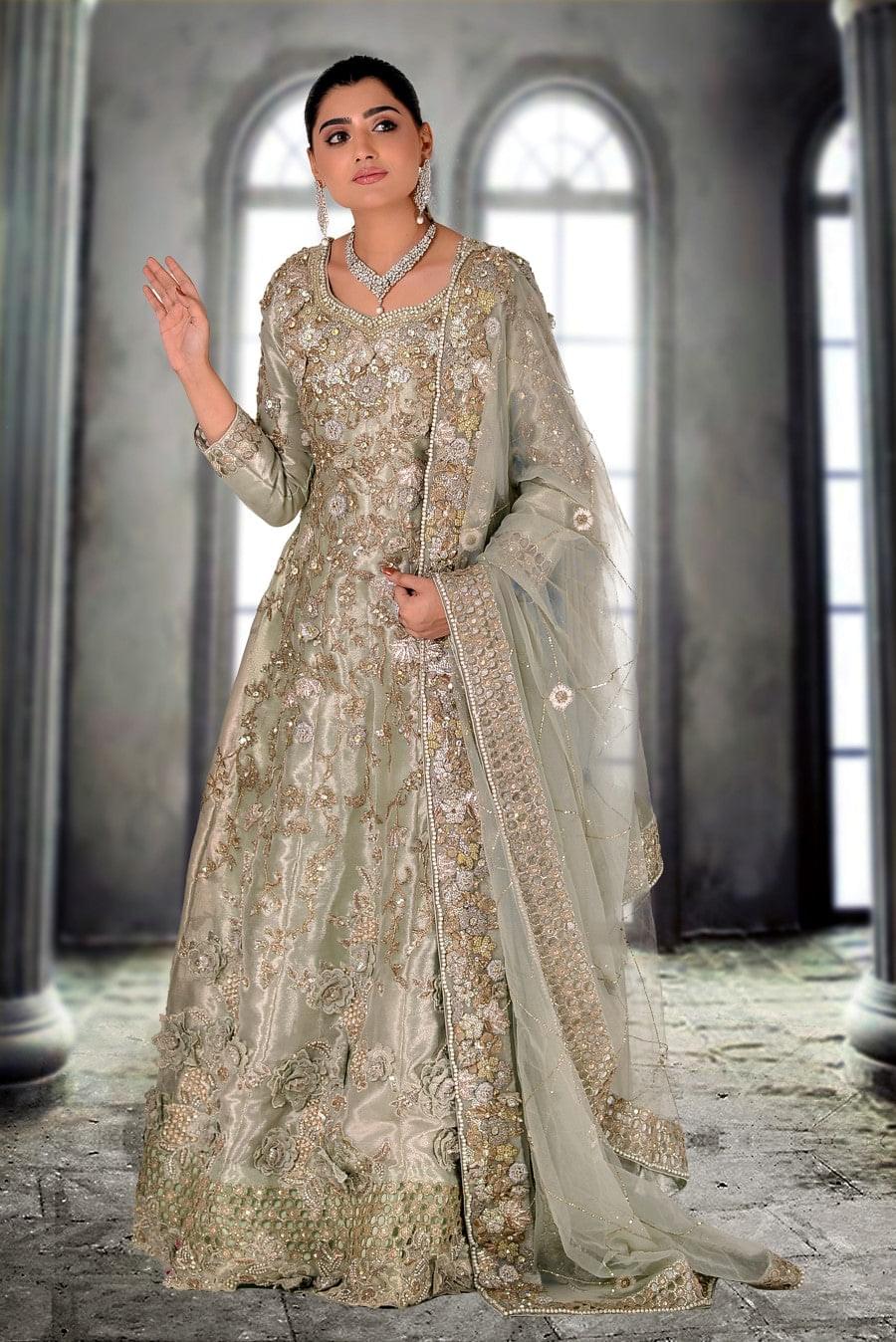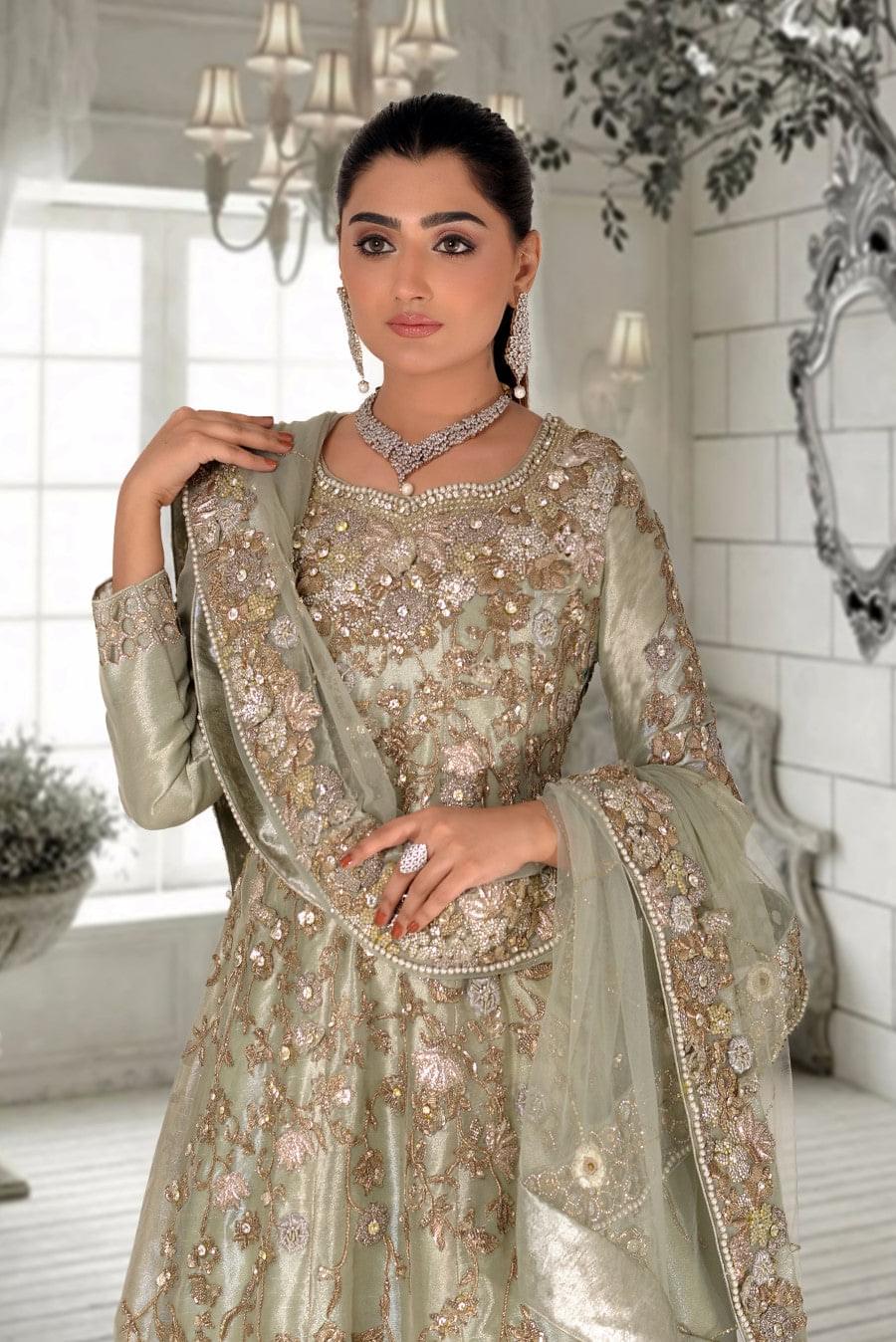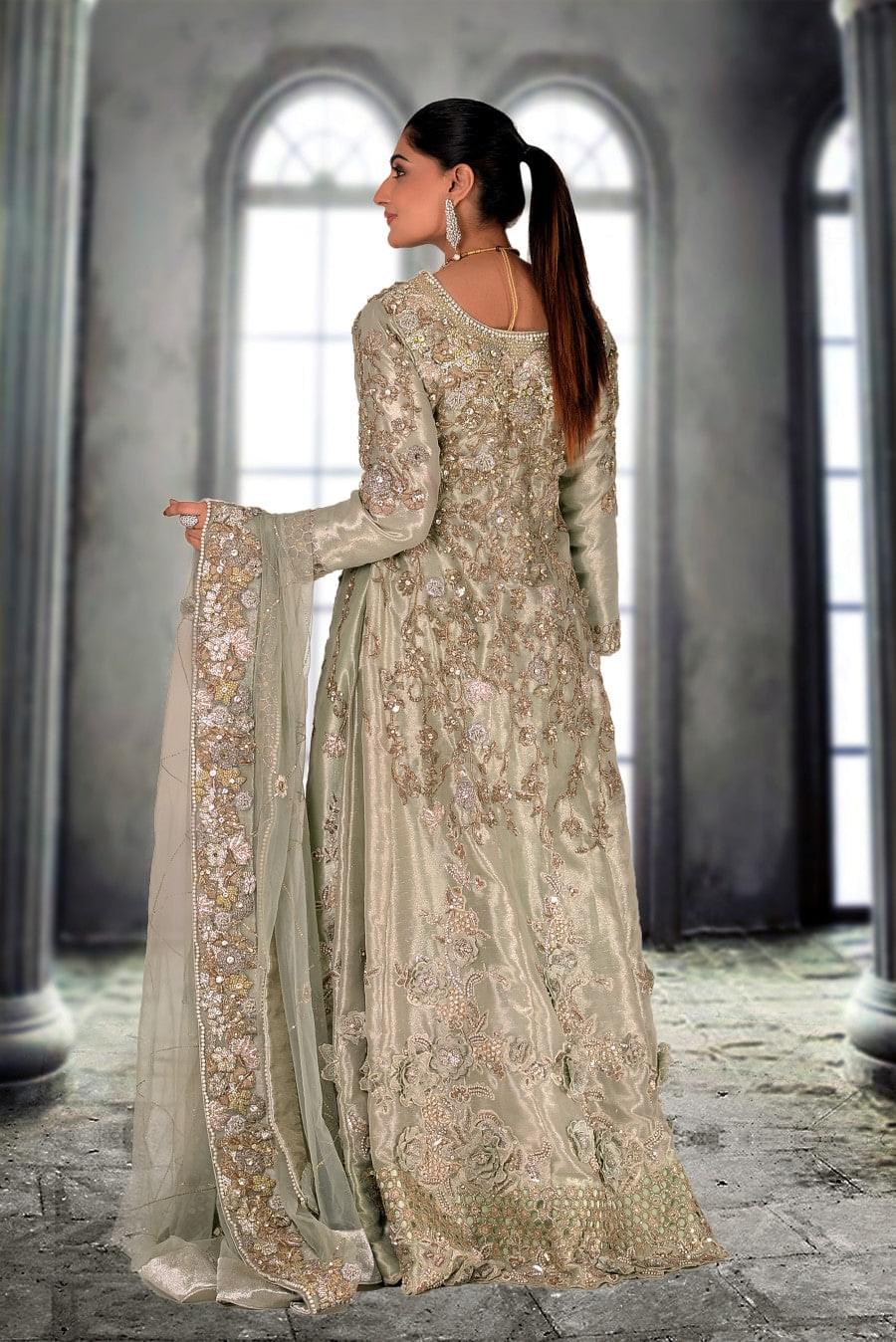 An elegant shade of mint green, made from tissue and net. This bridal is adorned with sequin and dabka hand work all over the front and the back. The dupatta has a heavy border and flowers motifs all over.