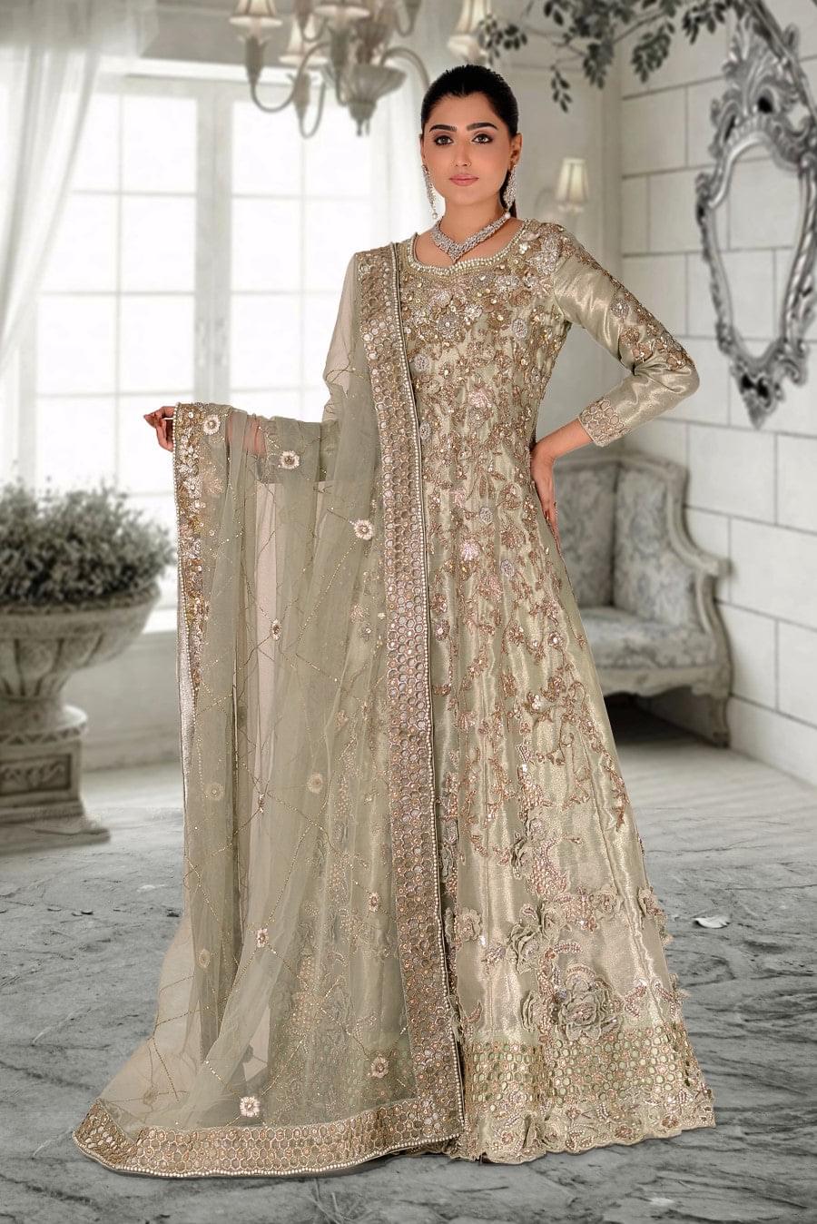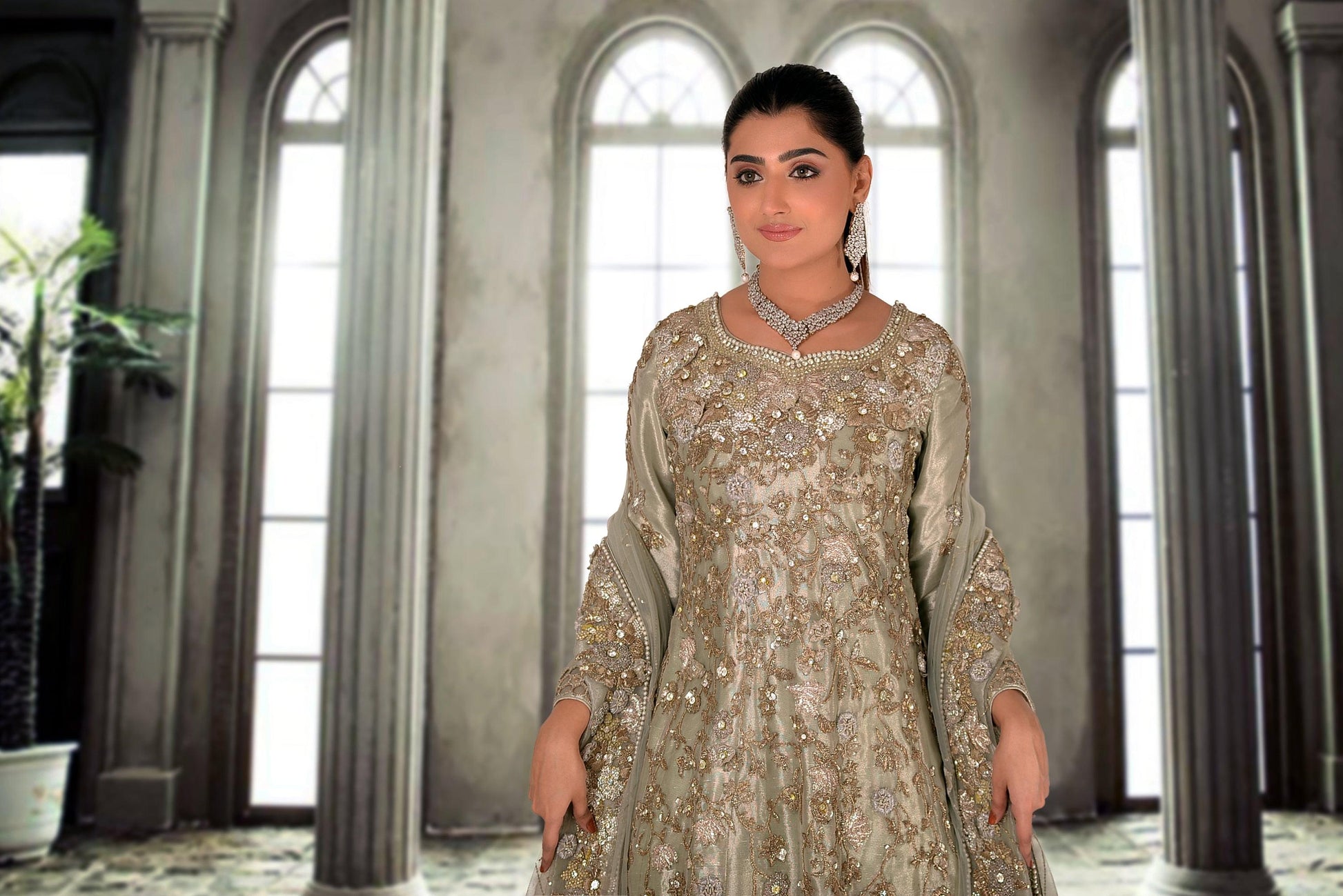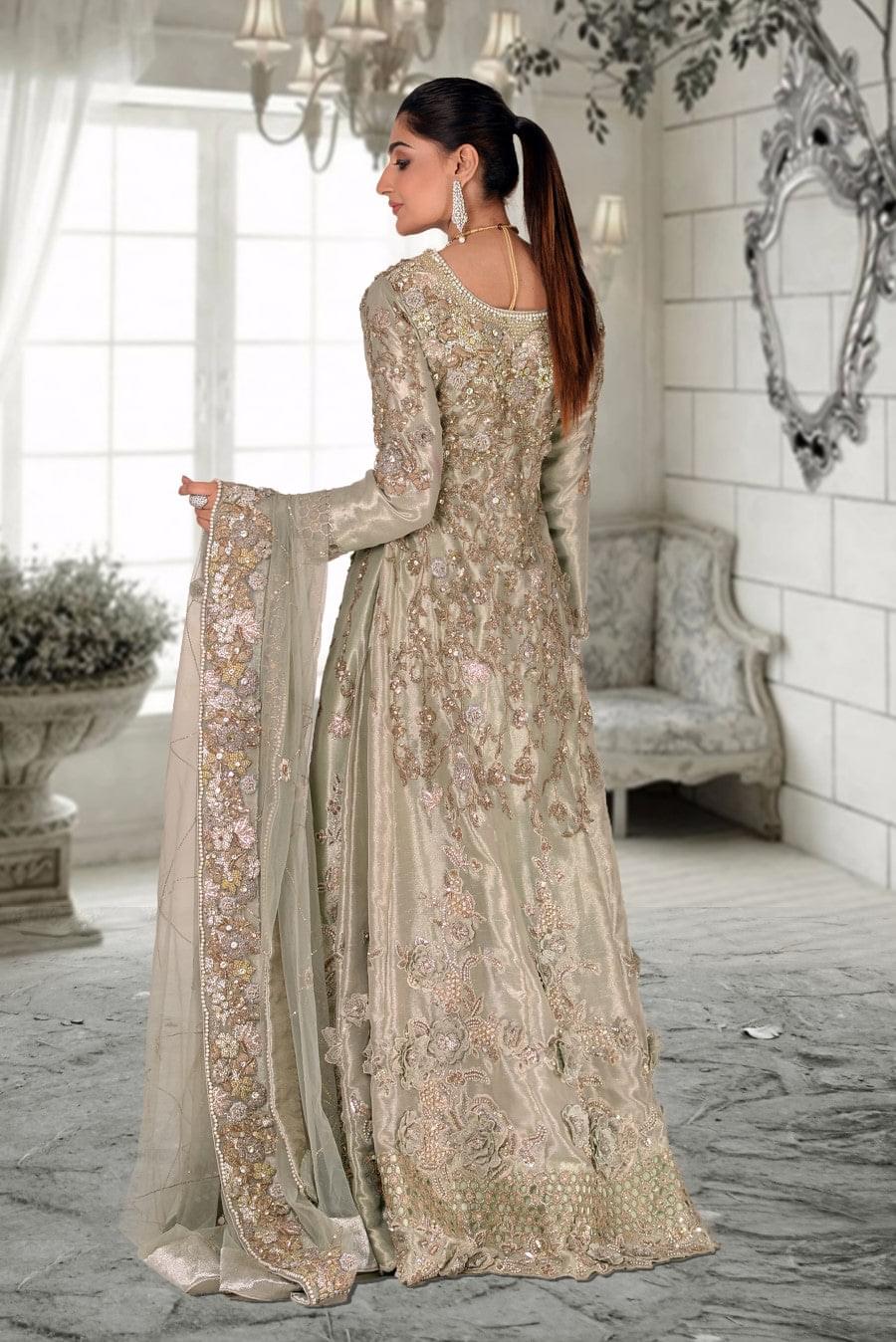 An elegant shade of mint green, made from tissue and net. This bridal is adorned with sequin and dabka hand work all over the front and the back. The dupatta has a heavy border and flowers motifs all over.