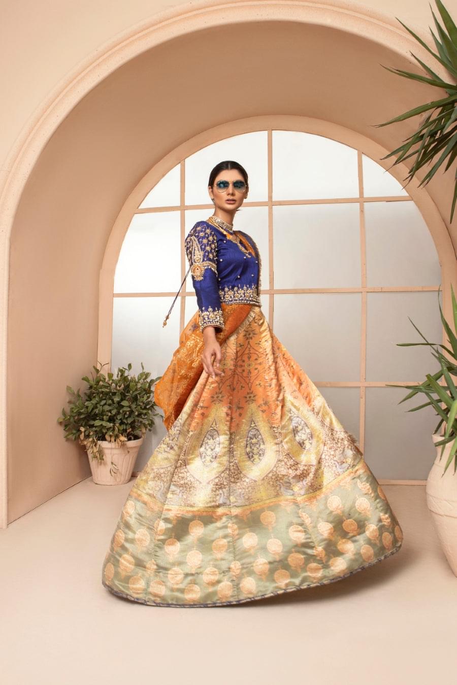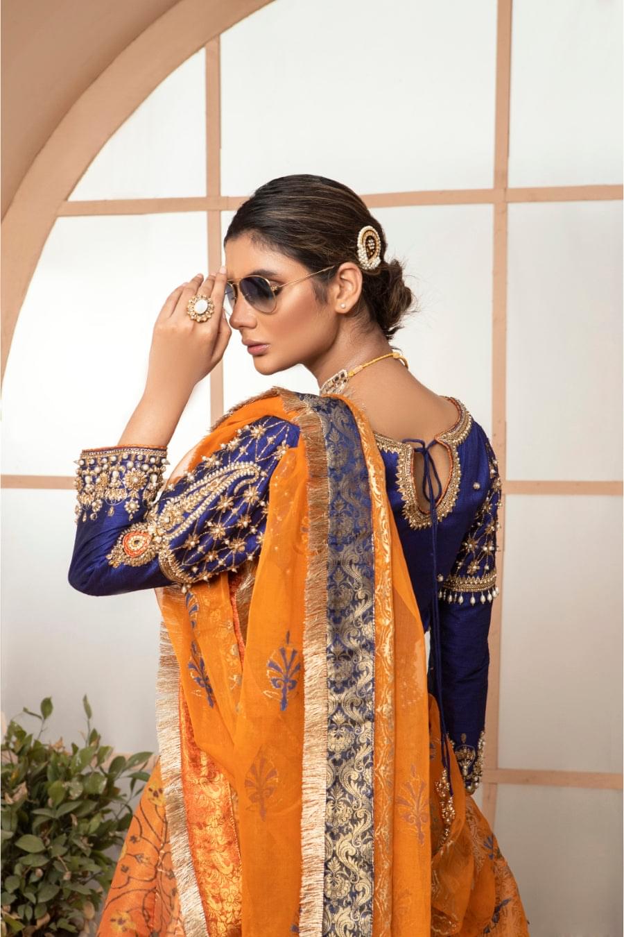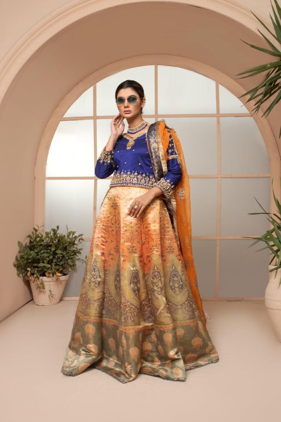 Add some flair to your wedding ensembles this season! A gorgeous blue raw silk choli with intricately done dabka and pearl work along the neckline, back and sleeves. The lehnga is digitally printed raw silk and the outfit is paired with a stunning orange organza dupatta with jamawar and kiran on the borders.