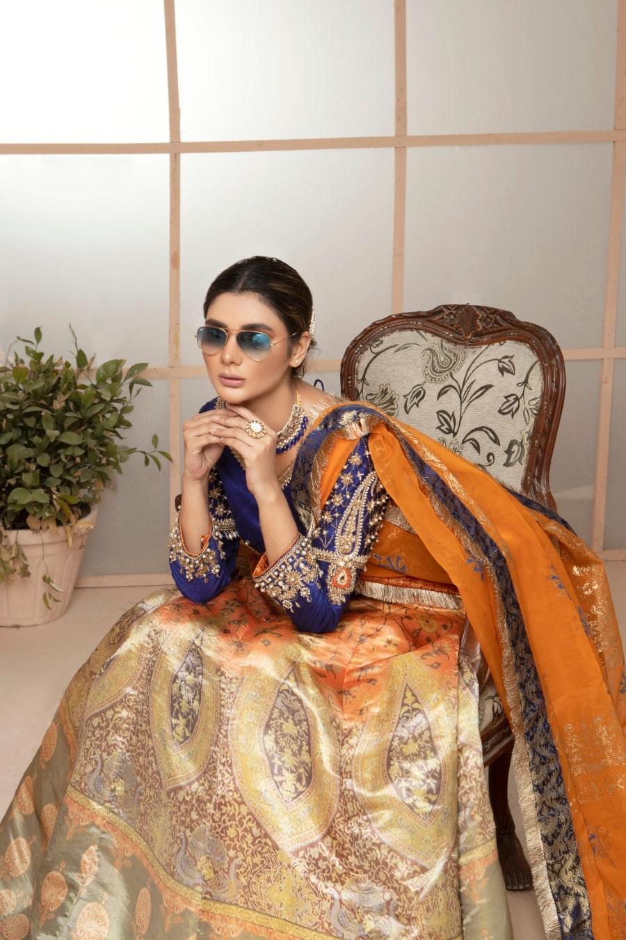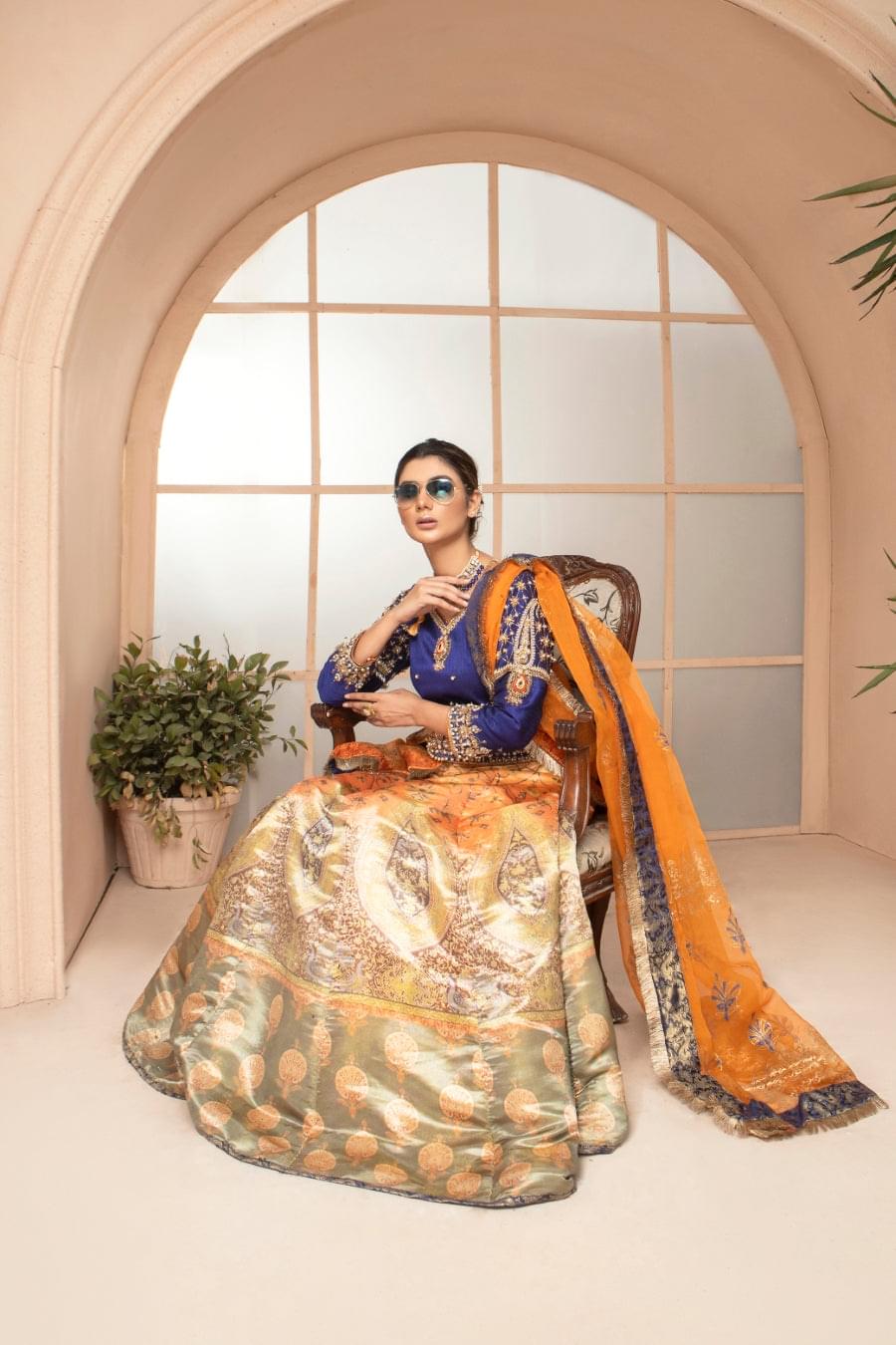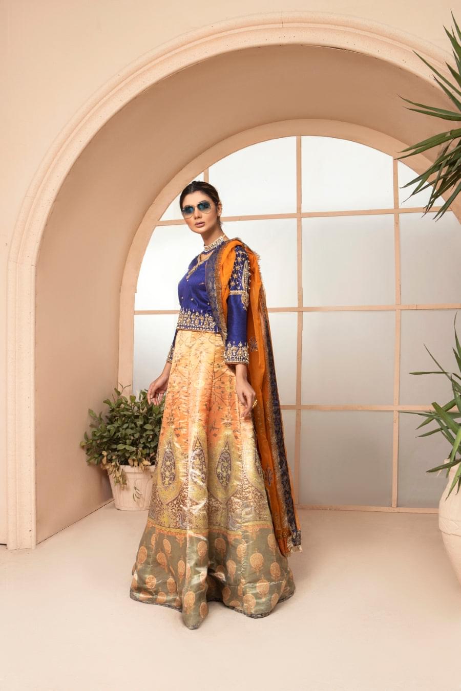 Add some flair to your wedding ensembles this season! A gorgeous blue raw silk choli with intricately done dabka and pearl work along the neckline, back and sleeves. The lehnga is digitally printed raw silk and the outfit is paired with a stunning orange organza dupatta with jamawar and kiran on the borders.