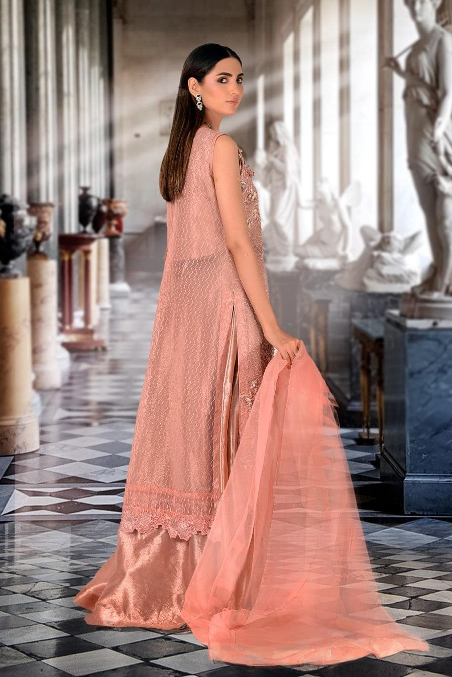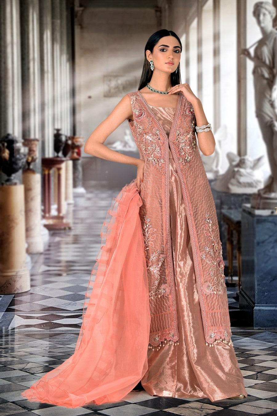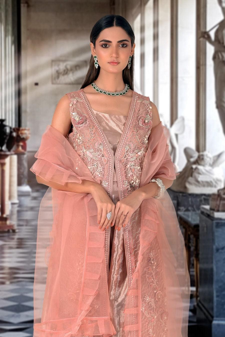 This beautiful blush pink formal is a must have this wedding season! Made from the finest tissue and organza, it is a front open long shirt with heavy work on the front of the shirt.