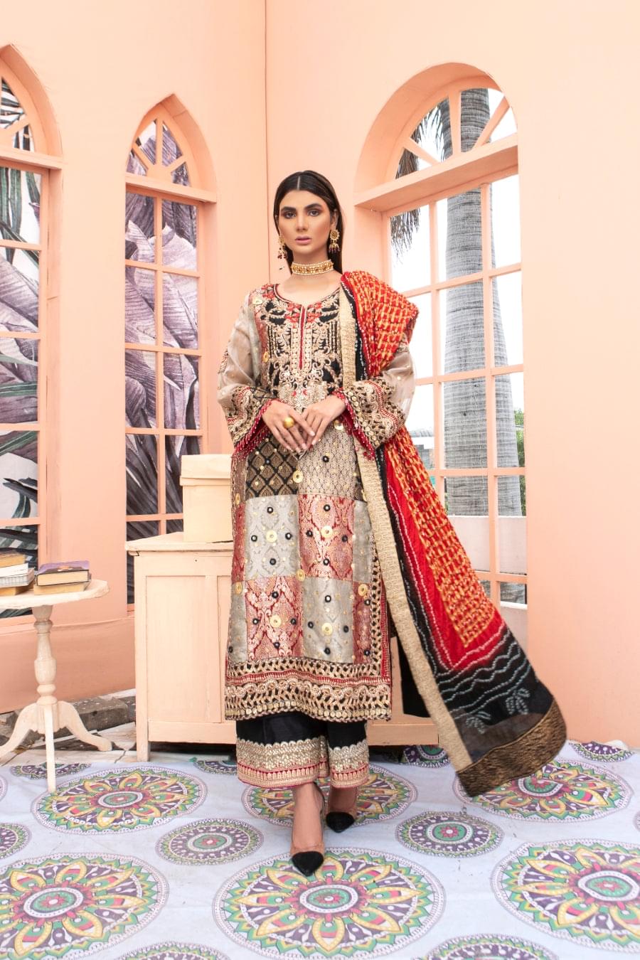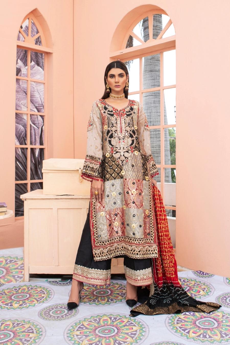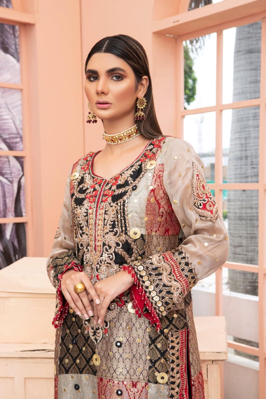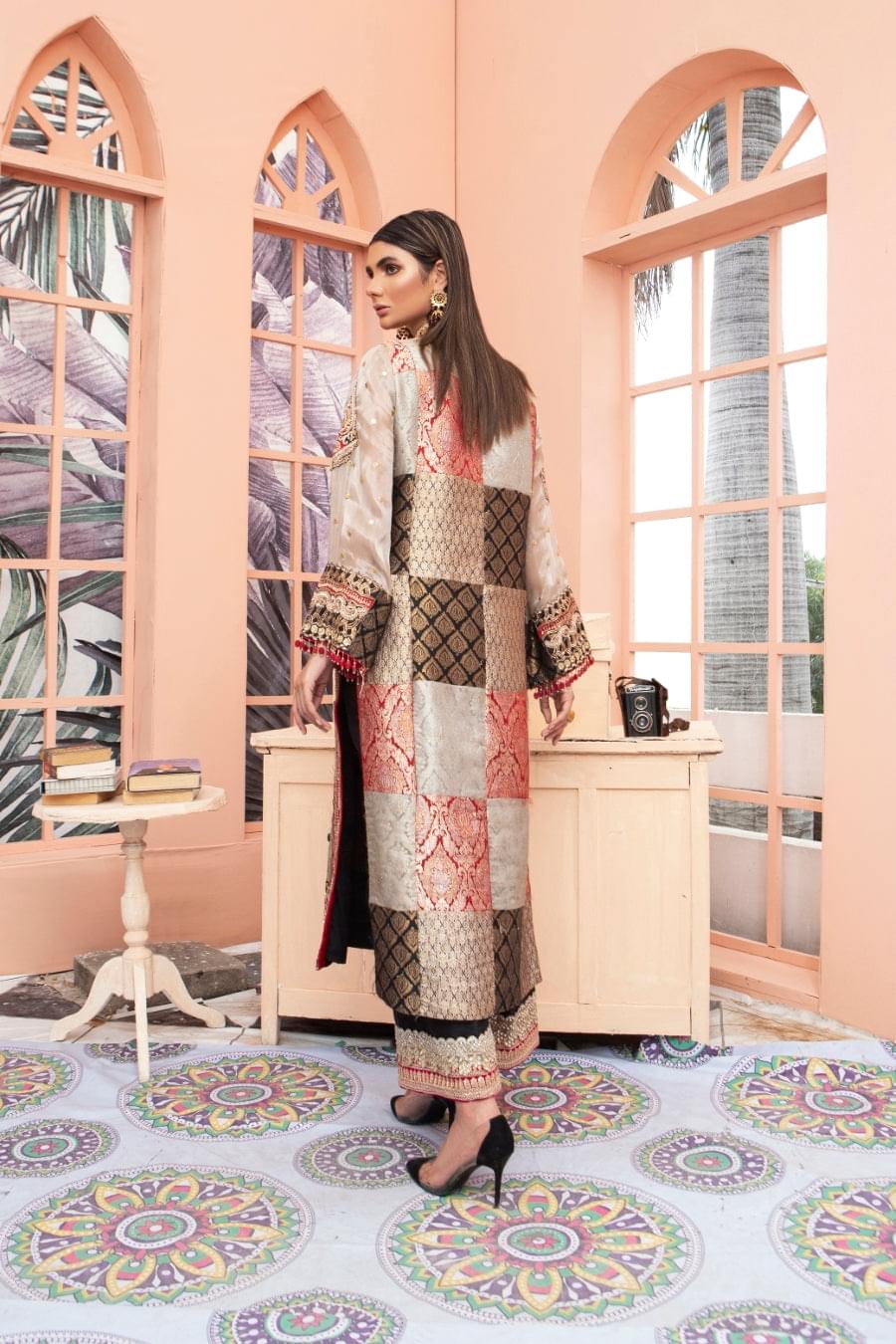 Breeze features a jamawar and raw silk shirt, that is embellished with heavy mokash and sheesha work on the neckline and sleeves. Paired with raw silk pants with heavy detailed work on the ends and a stunning chunri dupatta with stylized borders to bring this look together.