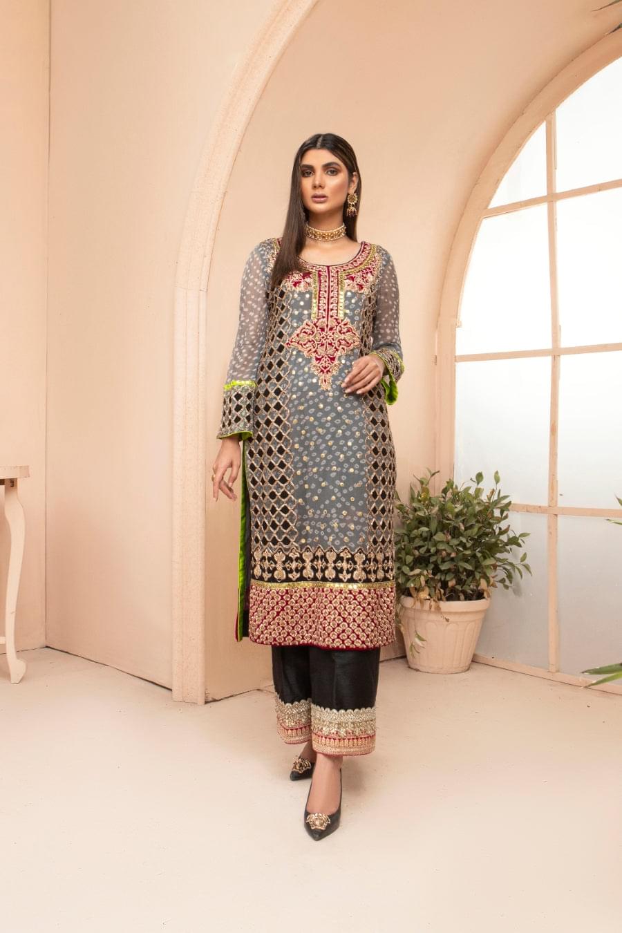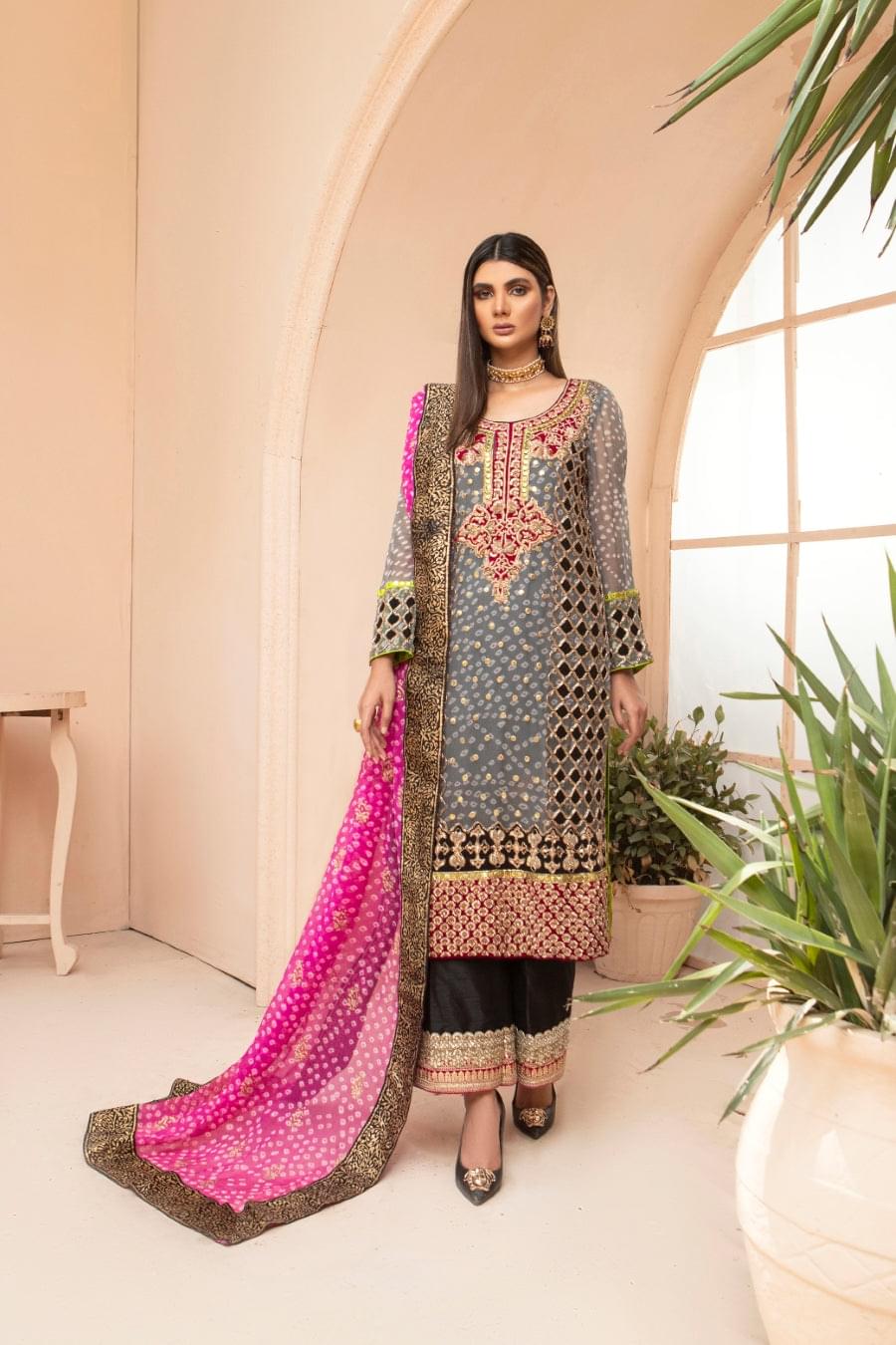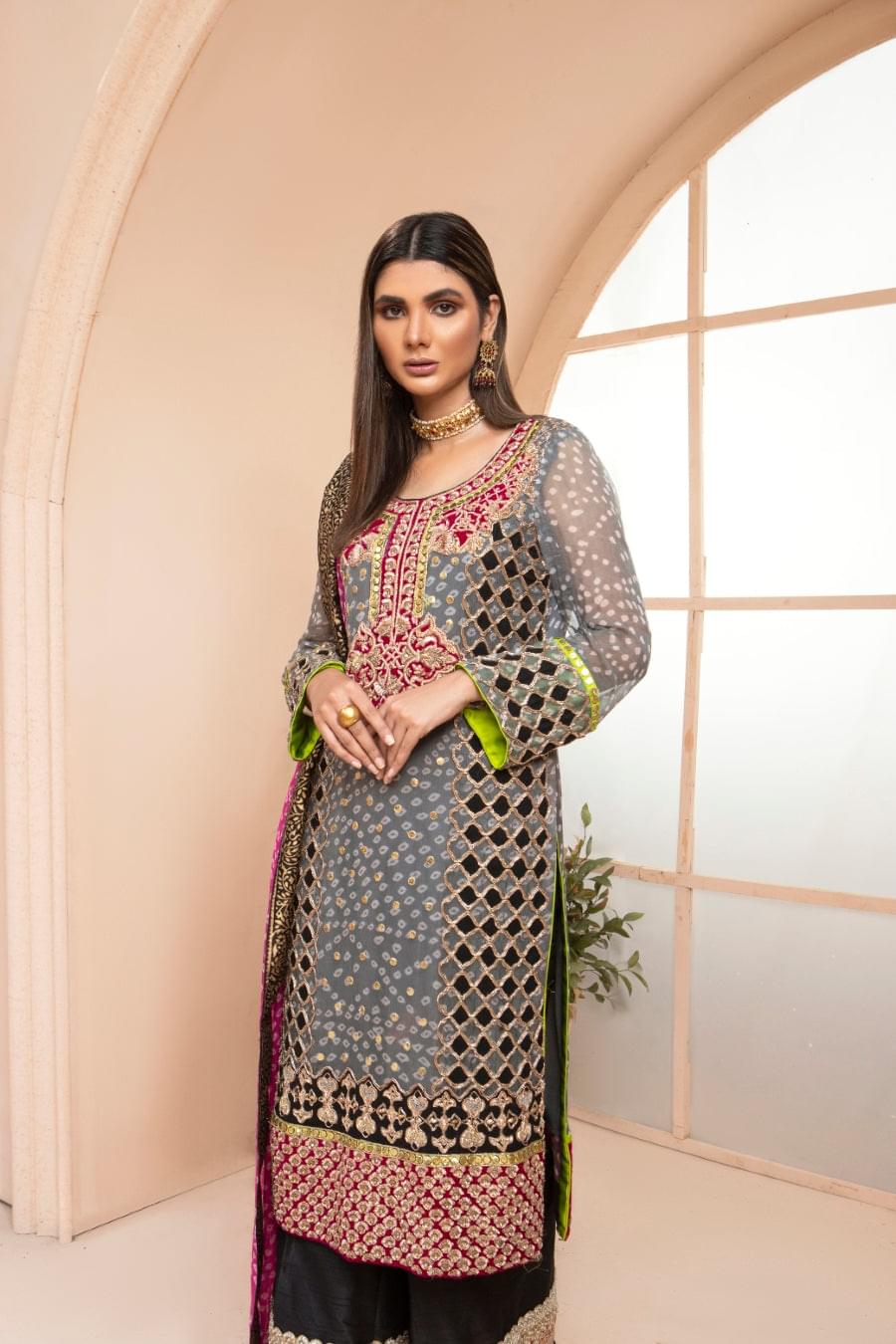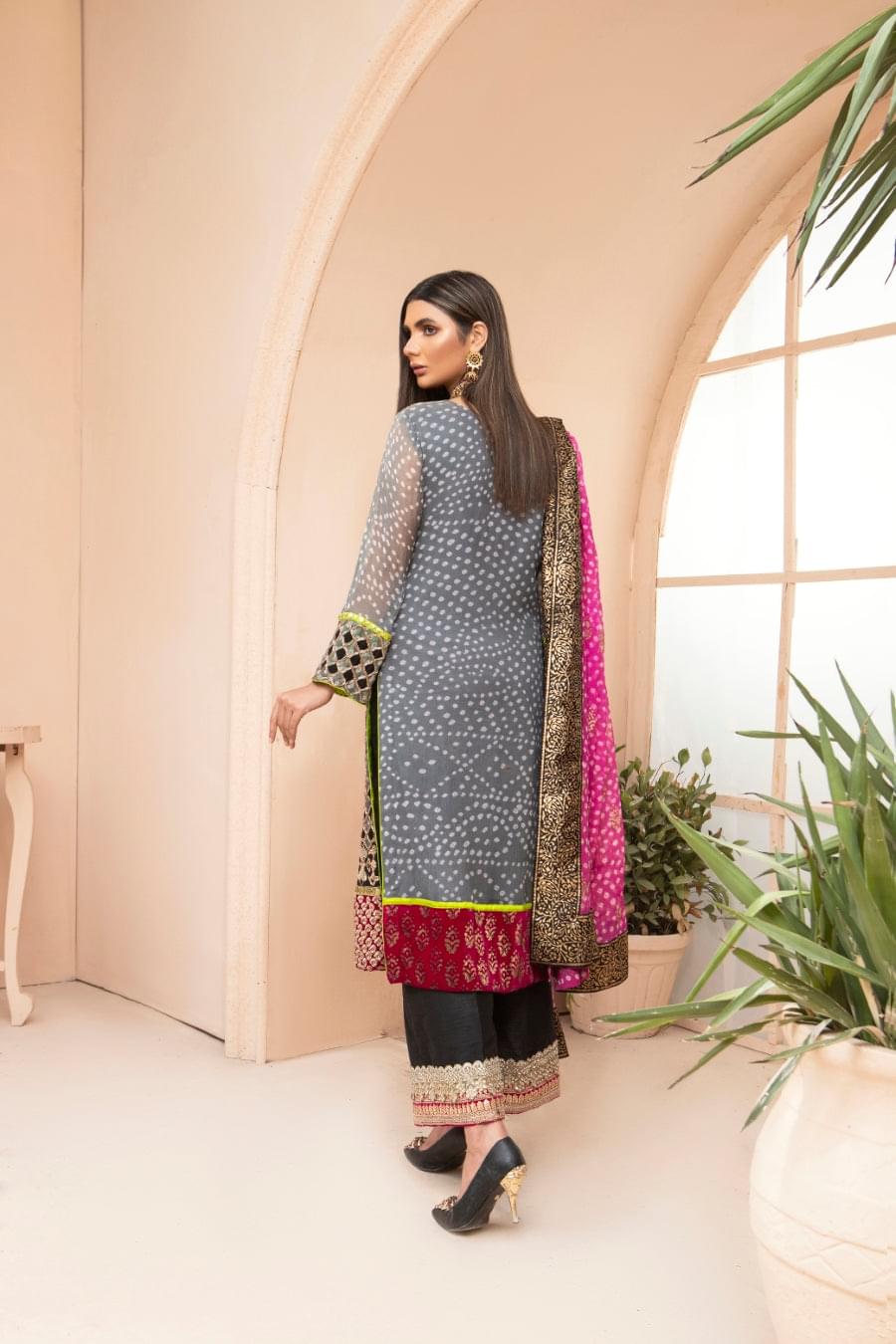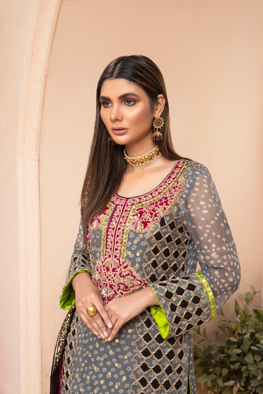 Chunri, as the name suggests, is made from a gorgeous grey toned chunri printed chiffon. The front of the shirt is adorned with a block print and heavy dabka and mokash work. Paired with raw silk pants that feature embellishment on the ends of the loose trousers and a pink chunri printed dupatta with a block printed border.