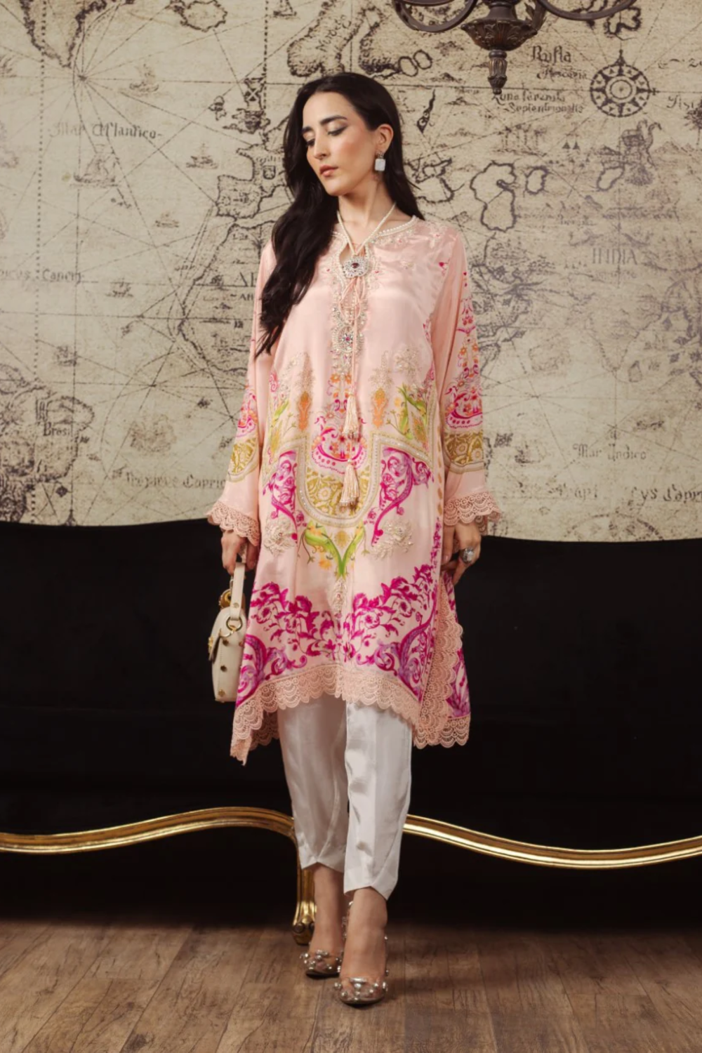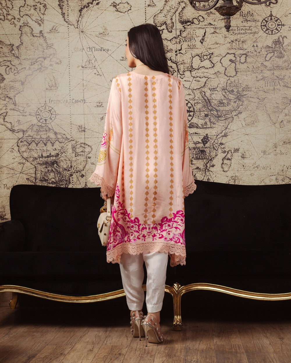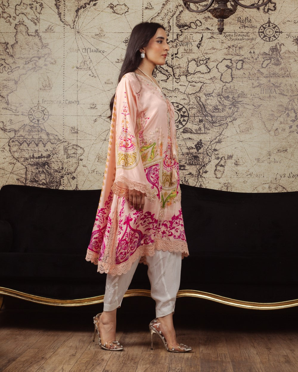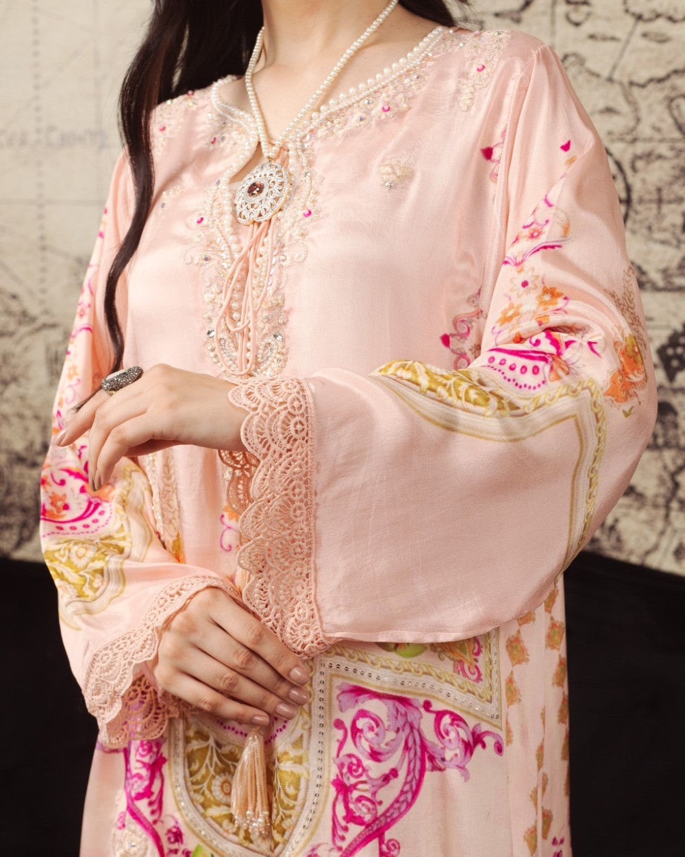 Grip Silk Digital Print embelished with pearl work & lace trims.