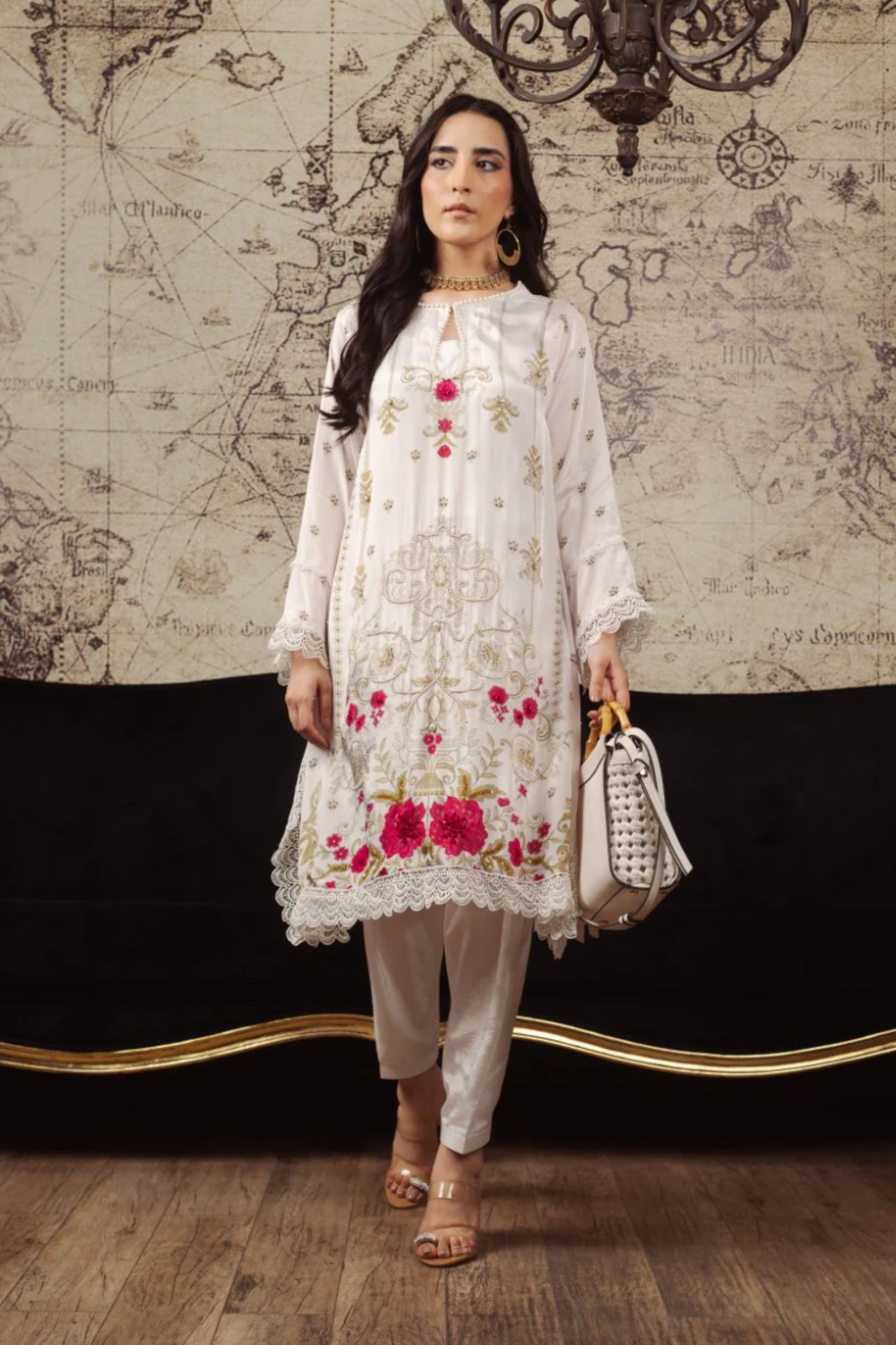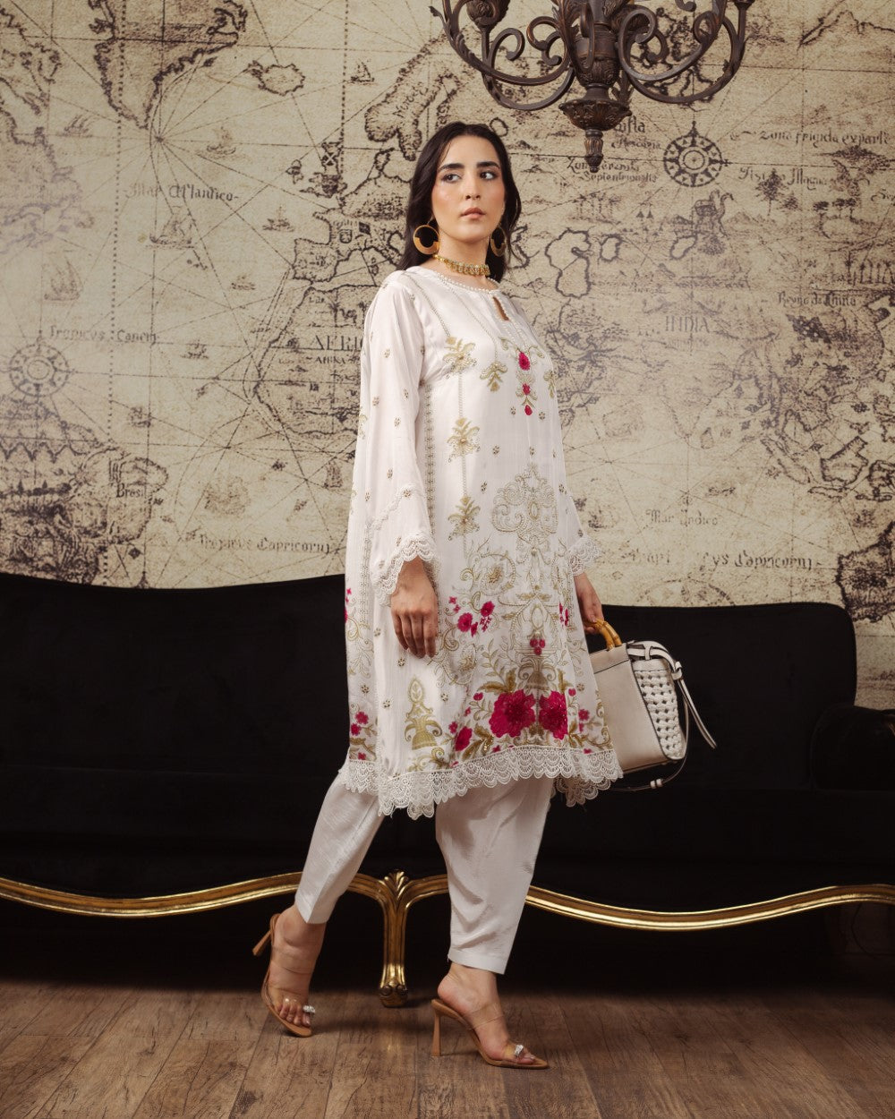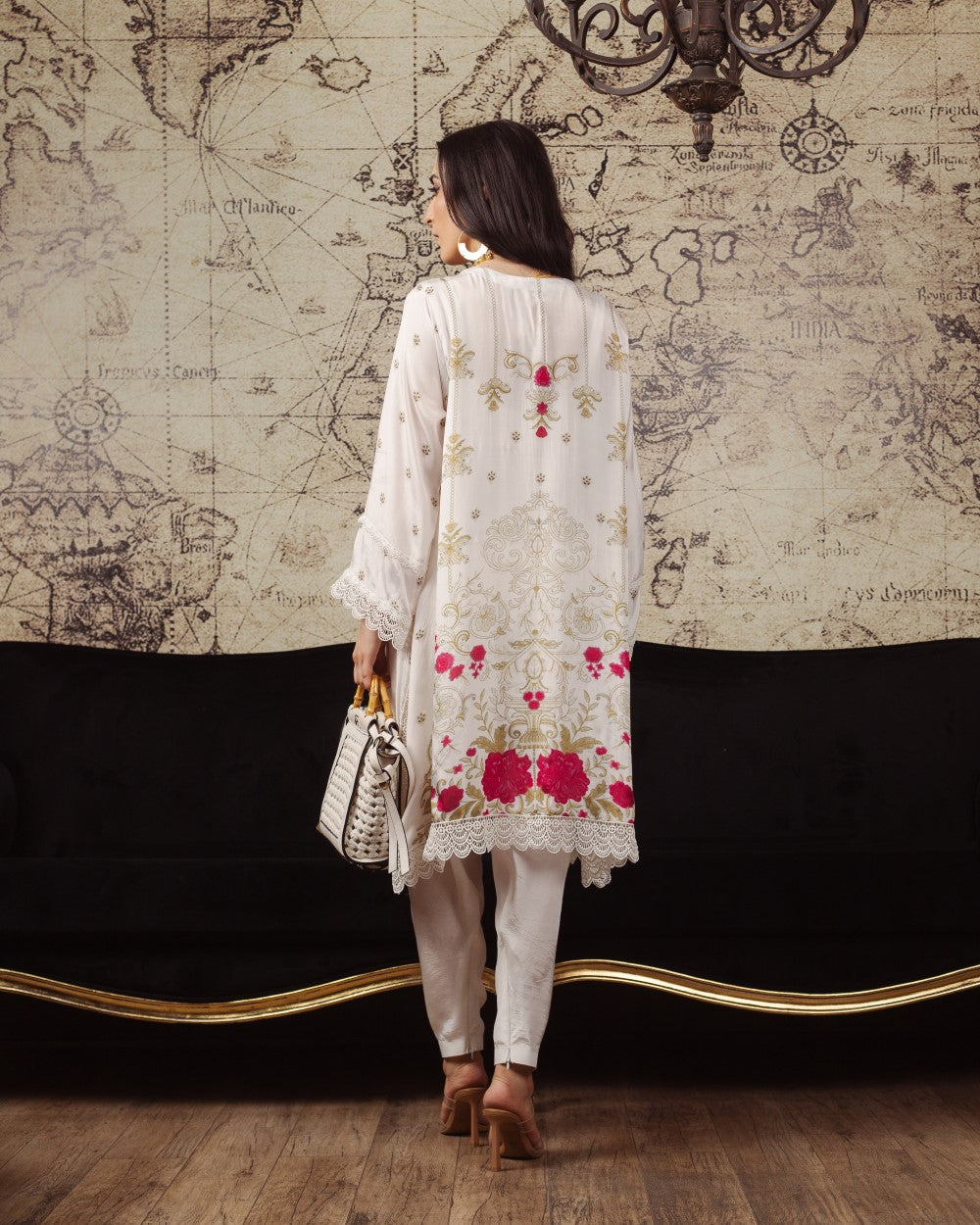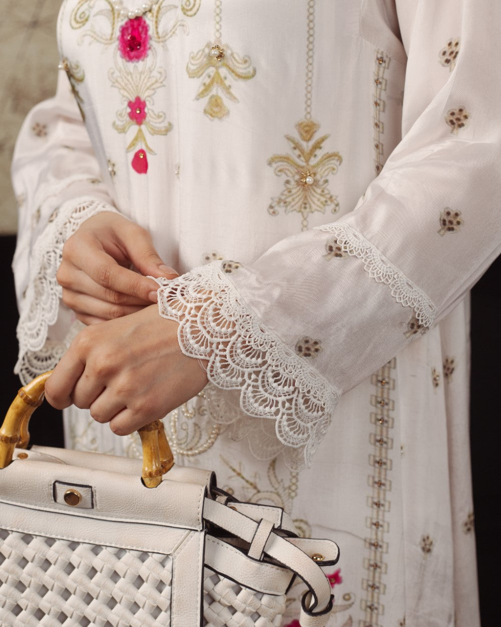 Grip Silk Digital Print embelished with pearl work & lace trims.