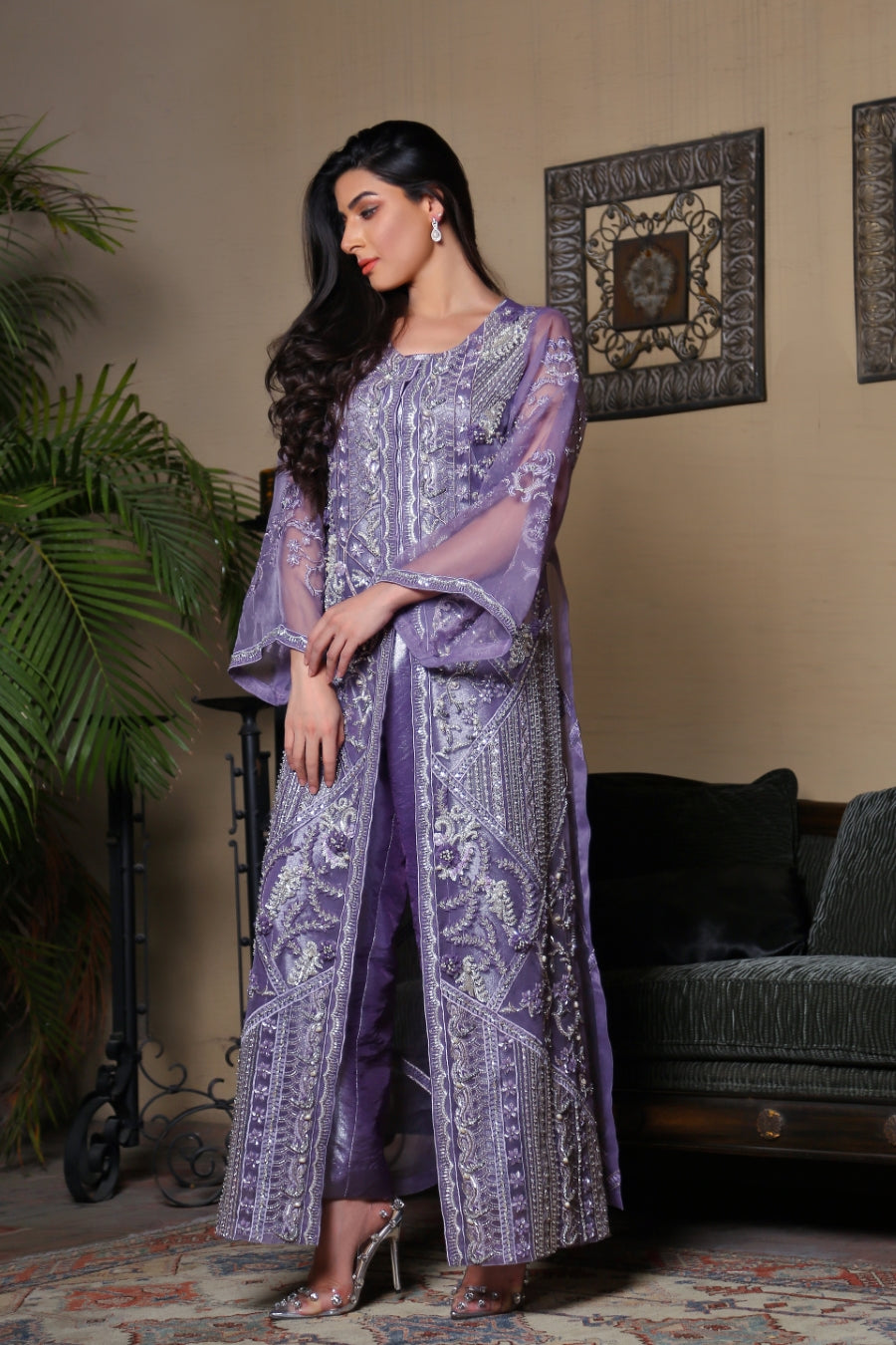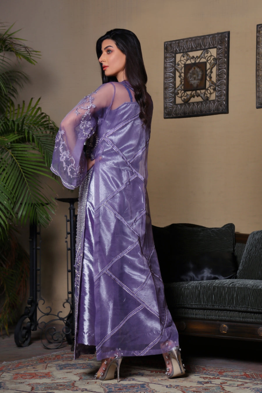 Product description: Sarah Salman luxury wedding formals offer and elegant mix of silhouettes with a modern twist. Meticulously crafted to make you look like the star of the evening, this shimmering purple organza and tissue ensemble is heavily embellished with silver thread and sequins.