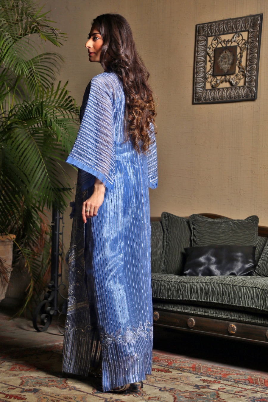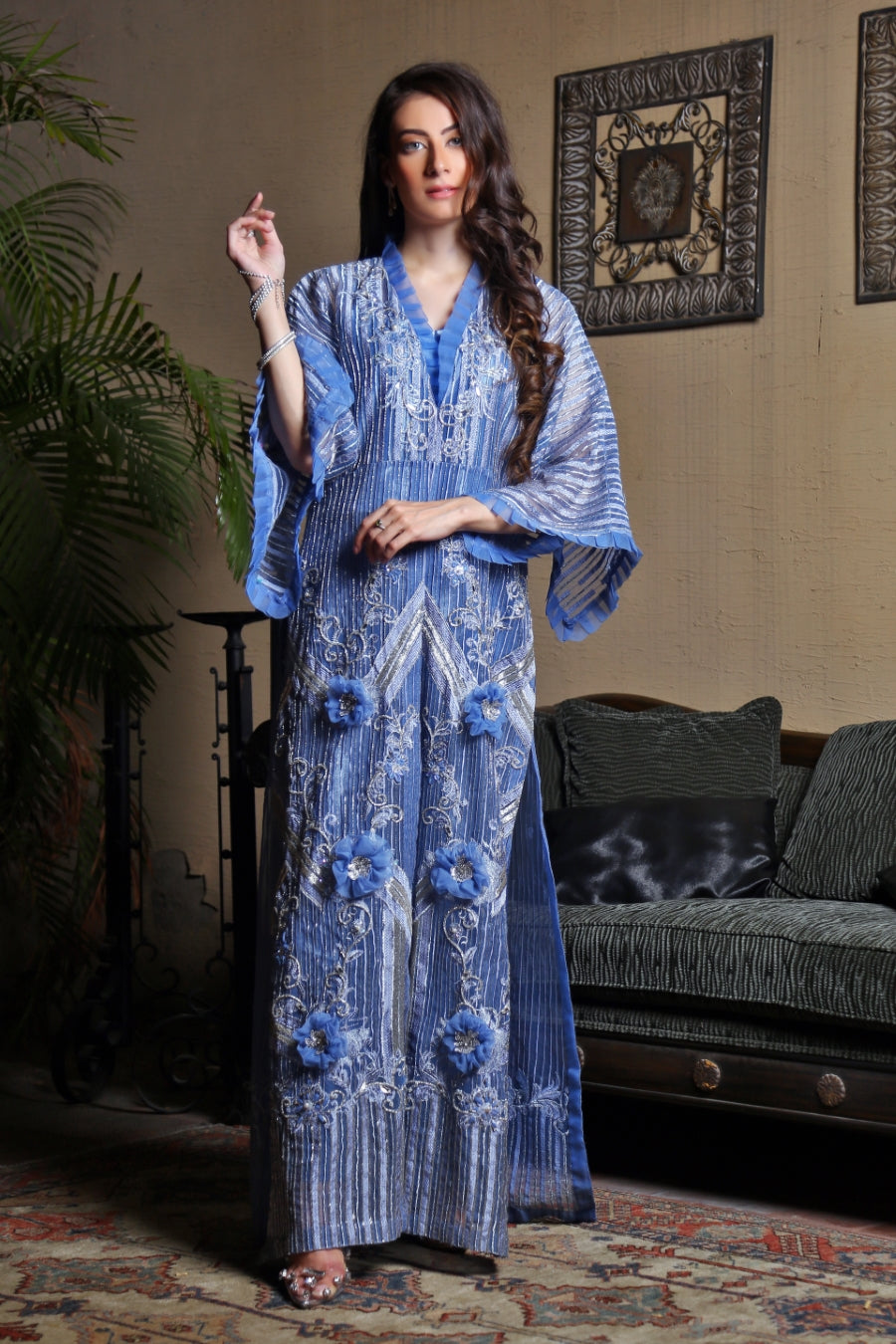 Product description: Sarah Salman luxury wedding formals offer and elegant mix of silhouettes with a modern twist. Meticulously crafted to make you look like the star of the evening, this shimmering blue organza and tissue ensemble is heavily embellished with silver thread and sequins.