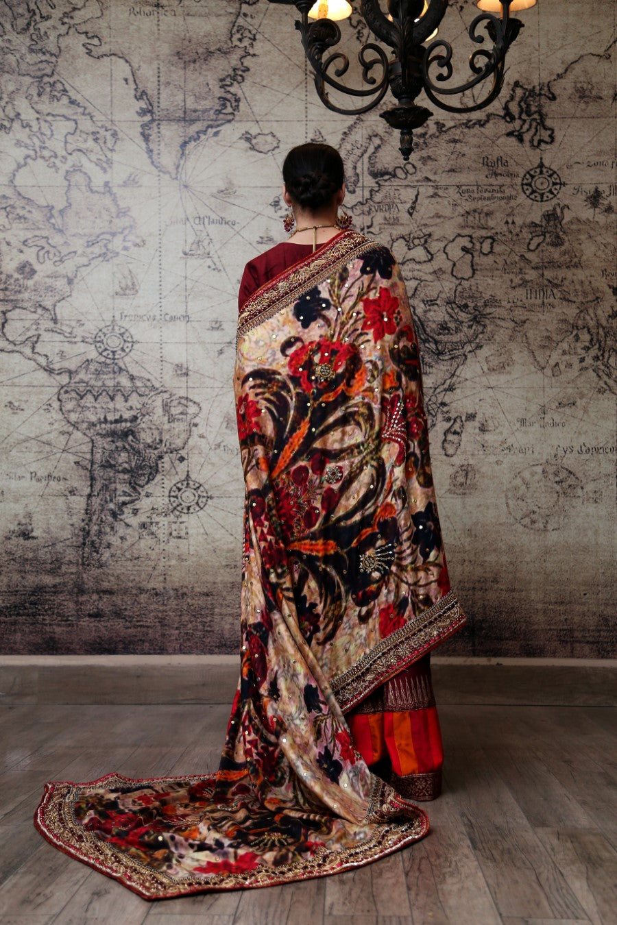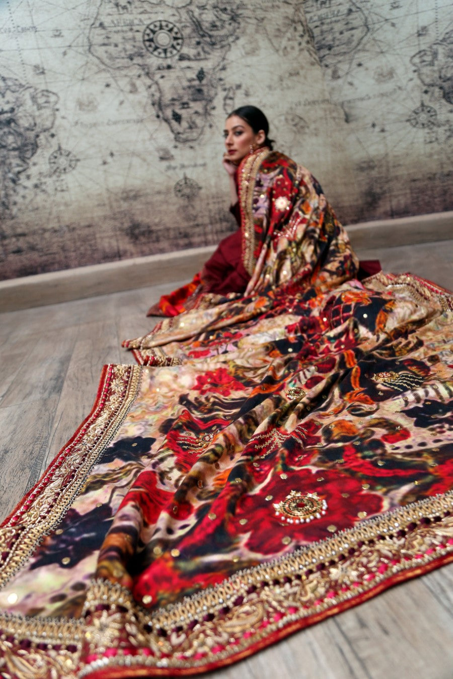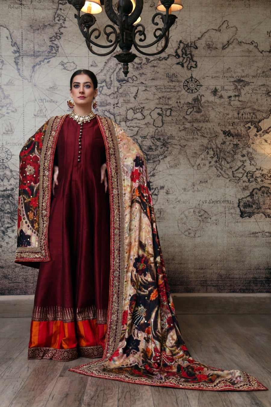 Product Description: "Mushk" brings to you a sense of royalty and grandour with it's pure Indian raw silk and single resham wool. A rich deep red silk pishwas paired with an absolutely regal digitally printed shawl that exudes elegance.