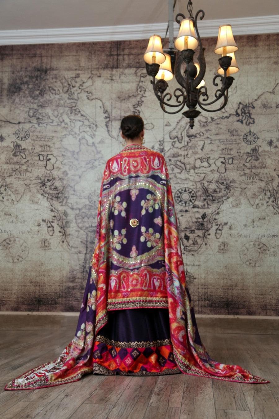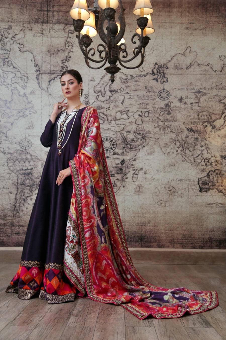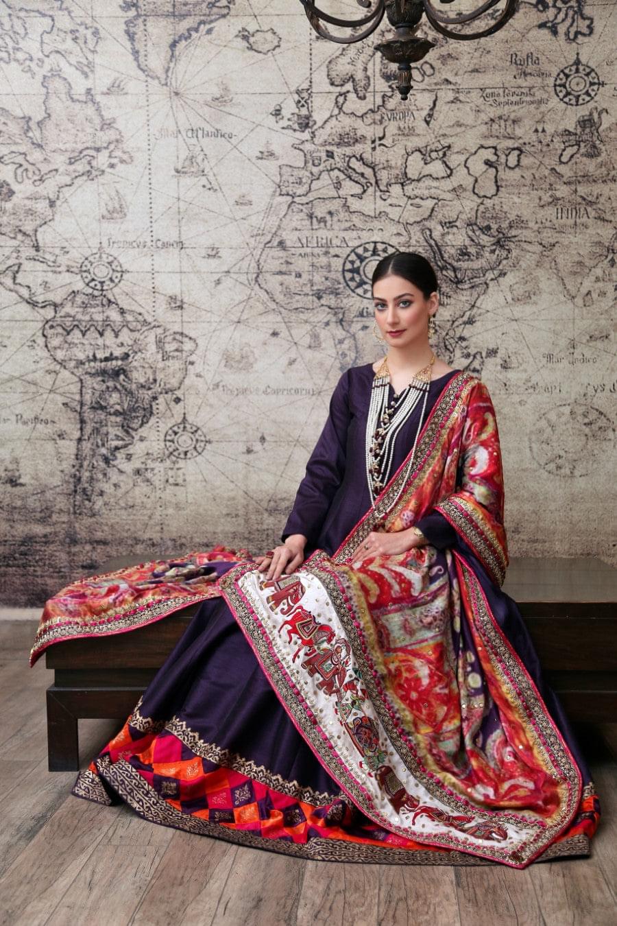 Fabric: Pure Indian Raw Silk, Wool Pieces: 3 piece; Pishwas, Trouser, Shawl Work Technique: Digital Print. Heavy hand embroidery and embellishment