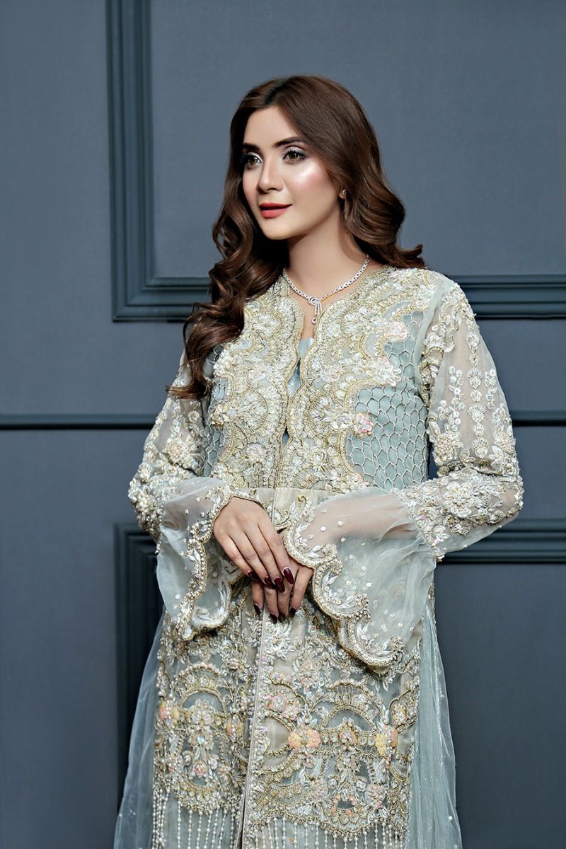 Product description: A soft blend of shimmery pastel blue that is enriched with delicate floral hand work along the shirt and paired with a stunning floor length matching lehnga and net dupatta.