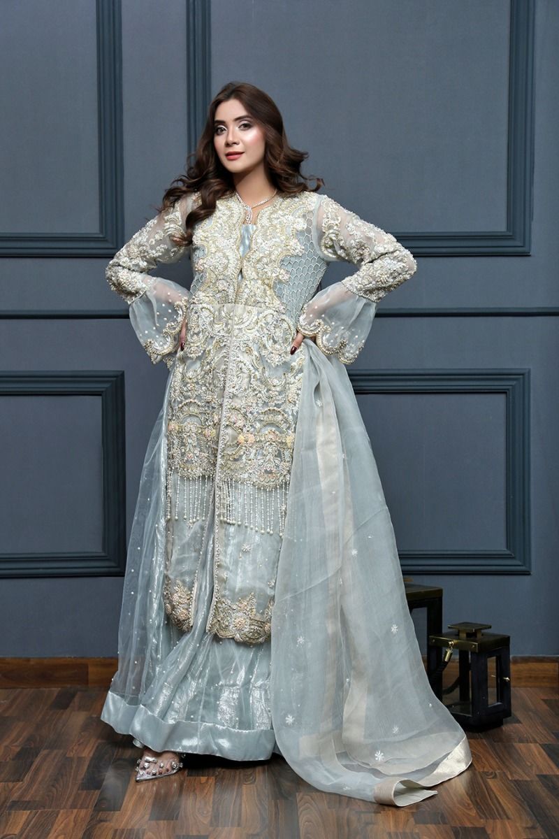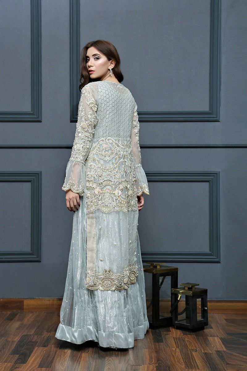 Fabric: Organza, net, tissue Pieces: 3 piece; shirt, lehnga, dupatta Work technique: Heavy hand work and hand embellishment