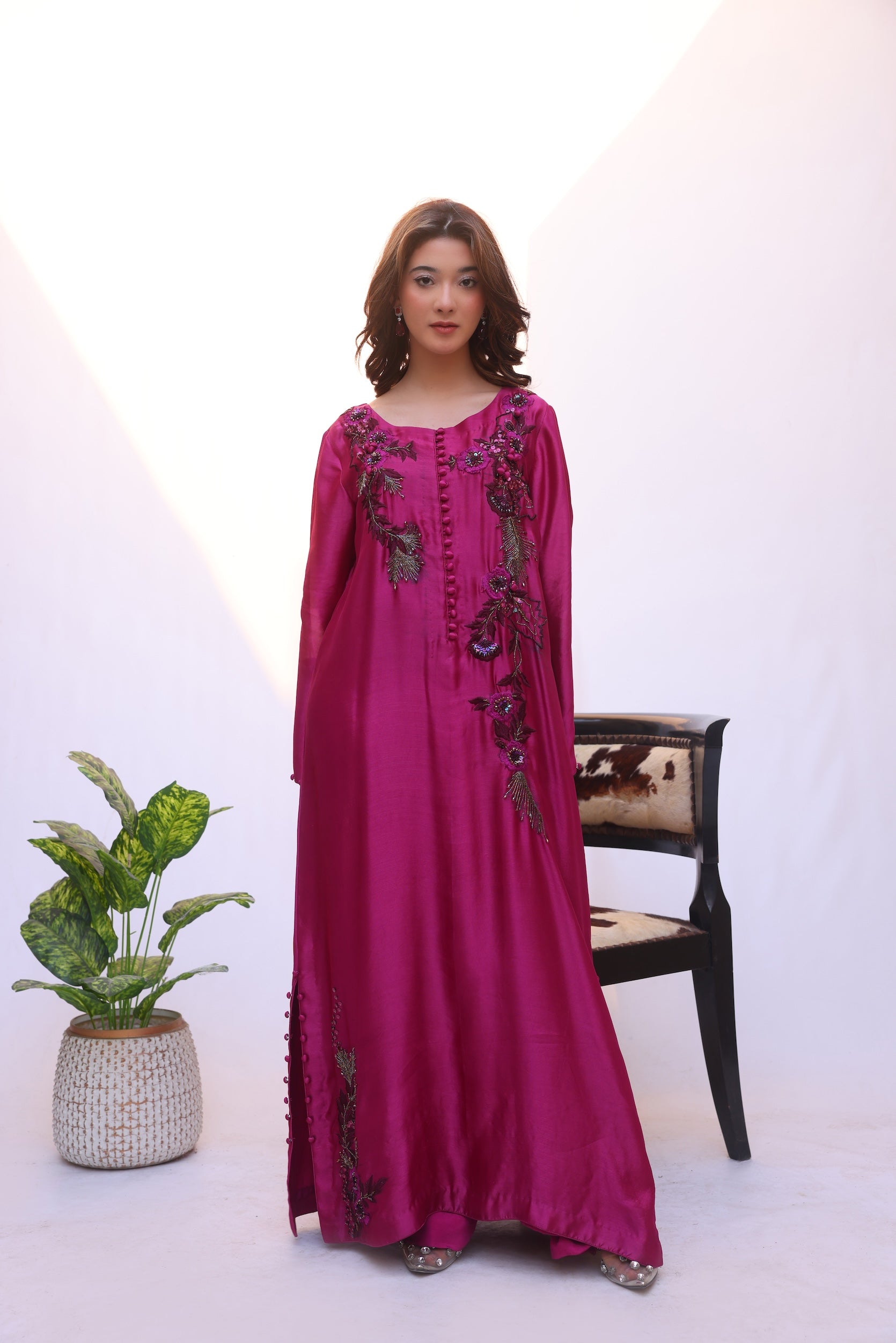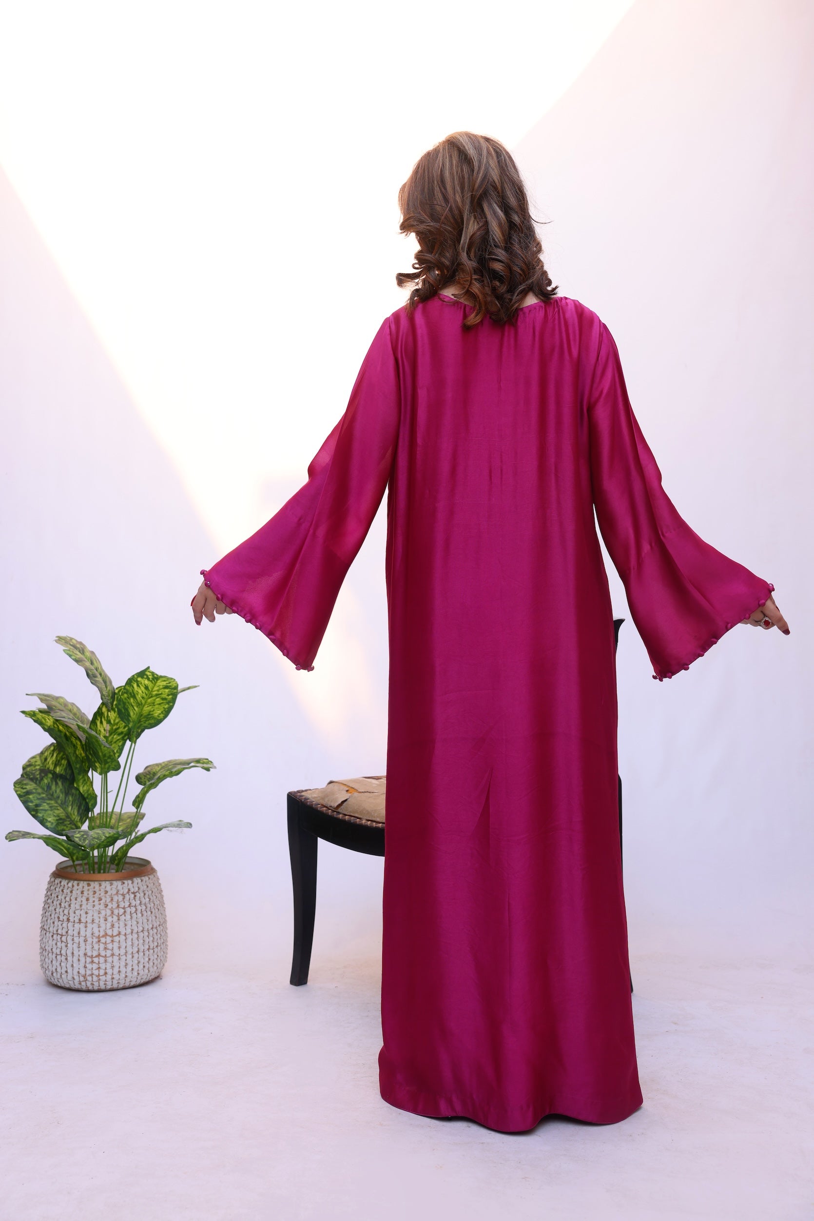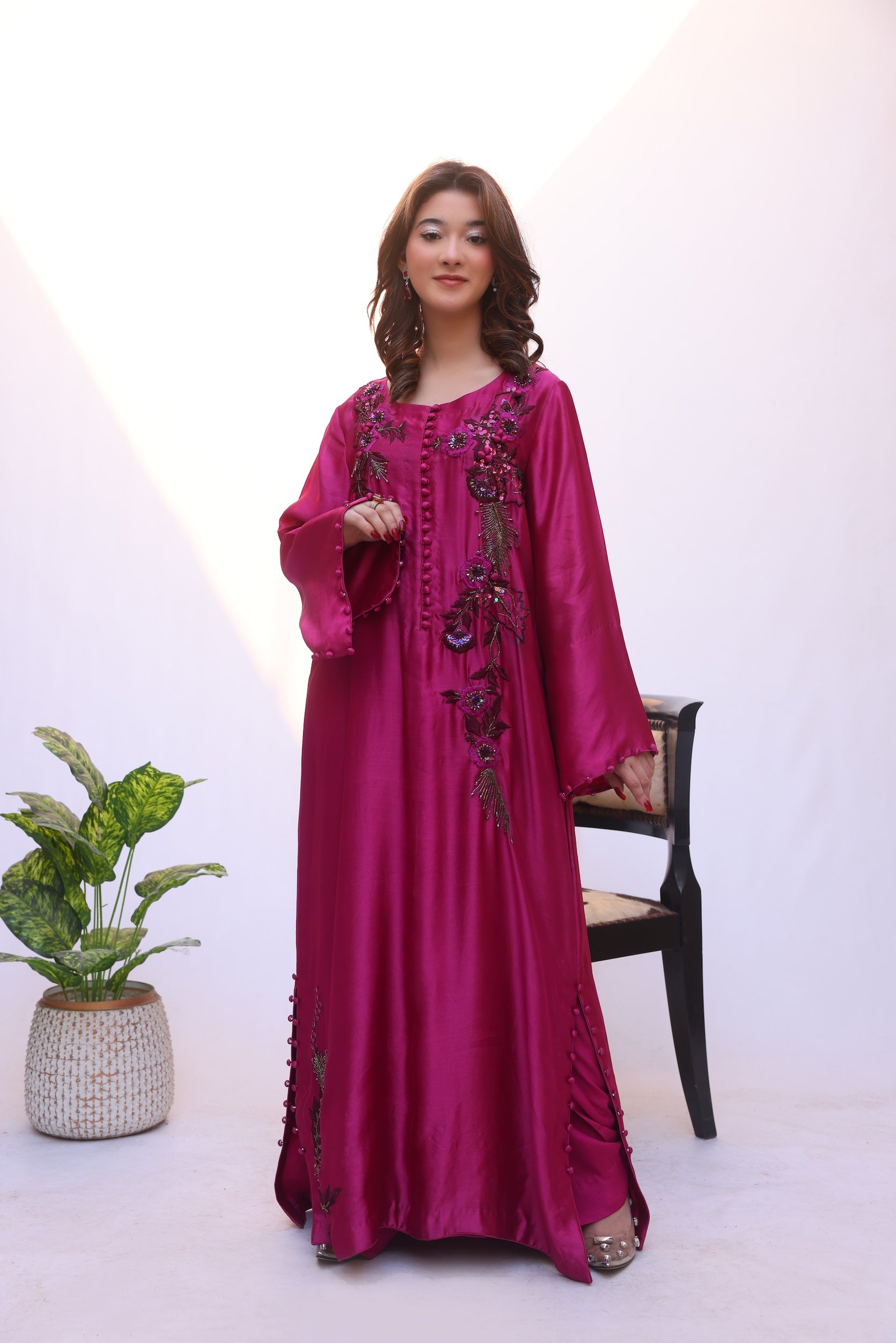 Crafted from luxurious shisha silk, this kaftan features intricate, statement embroidery with fine detailing that flows gracefully across the silhouette. The design is elevated with delicate accents and a soft, fluid drape, creating an effortlessly elegant and refined look.