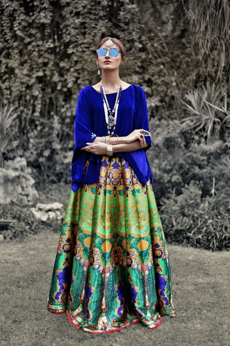 Exude elegant femininity in our contemporary digital printed silk lehnga's paired with a meticulously hand embellished draped velvet shirt. Sarah Salman brings to you ensemble's that work for both day and night occassions in our latest collection "Jewels".