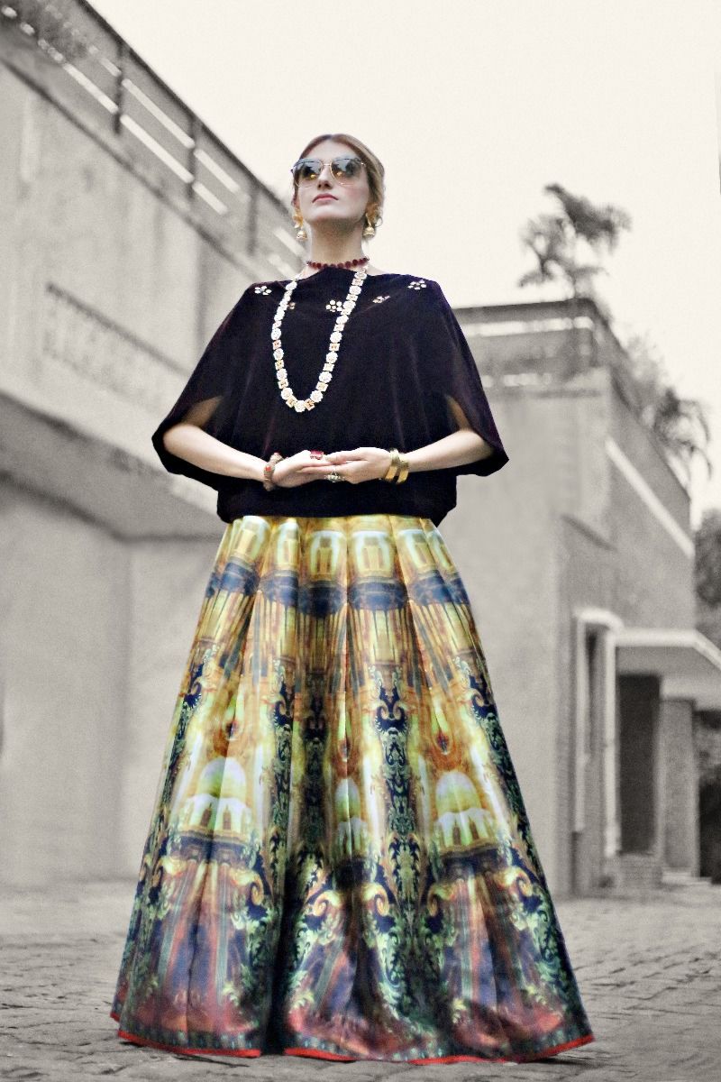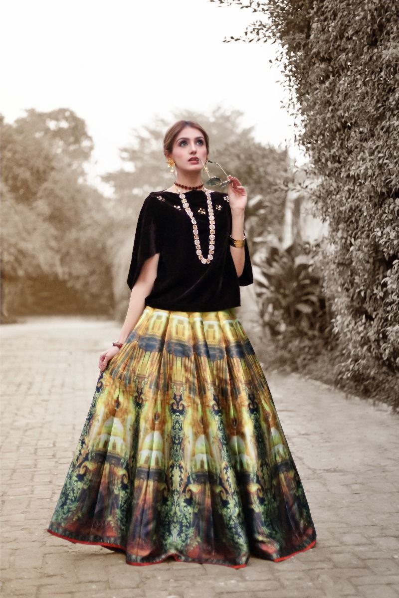 Exude elegant femininity in our contemporary digital printed silk lehnga's paired with a meticulously hand embellished and embroided draped velvet shirt. Sarah Salman brings to you ensemble's that work for both day and night occassions in our latest collection "Jewels".