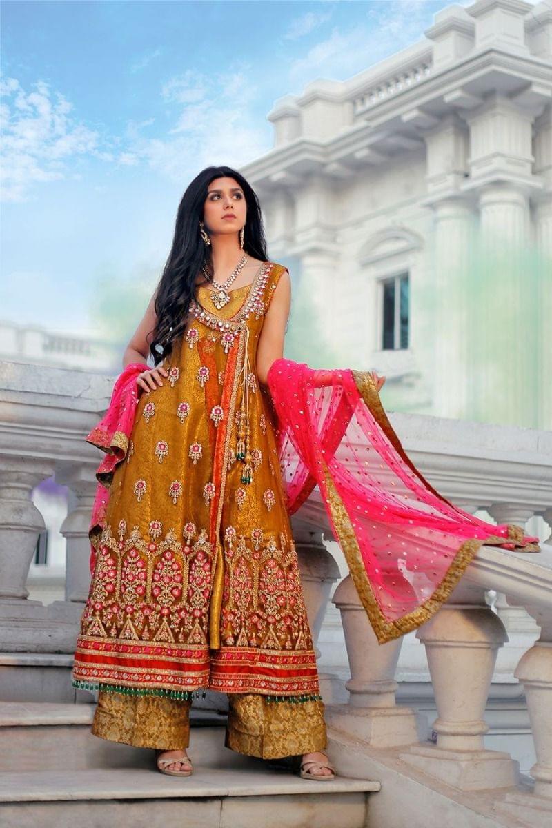This net layed rustic copper gold pishwas is meticulosly embellished using fine materials such as cut glass, sequins and stones. Paired with stunning pure jamawar pants and an iconic pink net dupatta with a jamawar finish on the borders and edges. Parts: Shirt, Pants, Dupatta