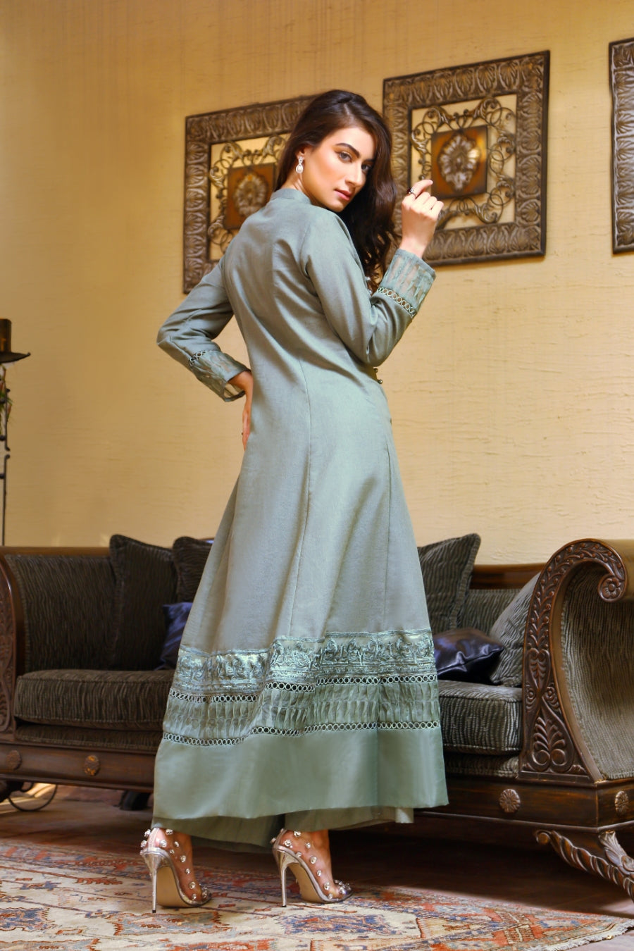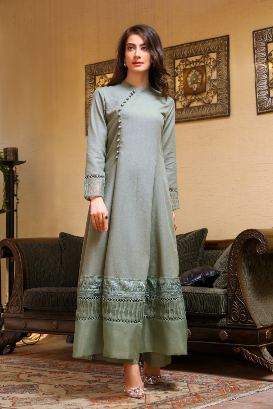 Product description: Ame brings to you an effortless blend of simplistic elegance and modernity this season. This two piece ensemble is curated from the finest winter karandi and adorned with heavy embroidery, pearls and organza.