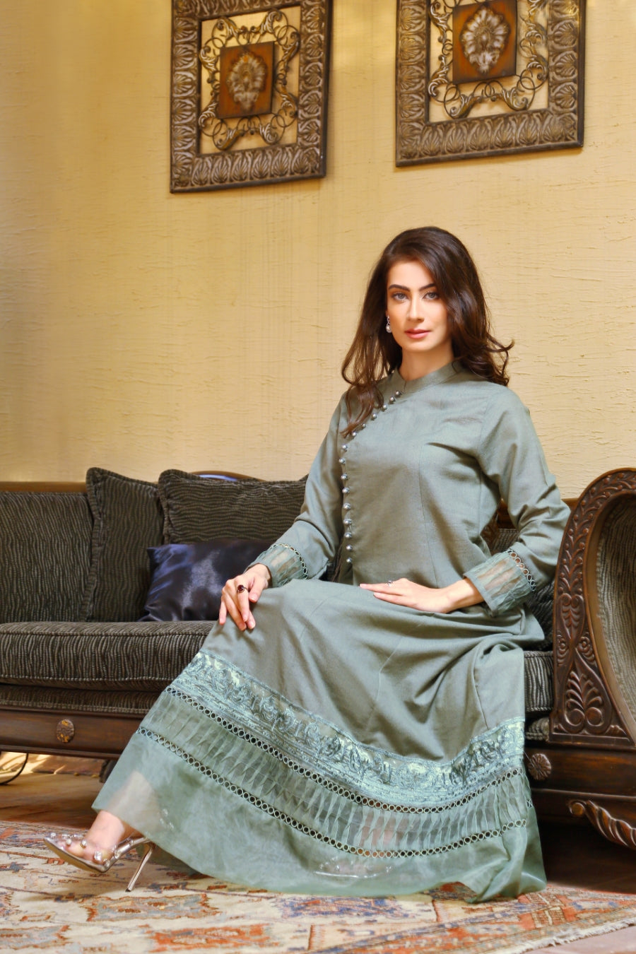 Fabric: Organza and Grip Pieces: 2 piece; shirt and trouser Work Technique: Machine embroidery
