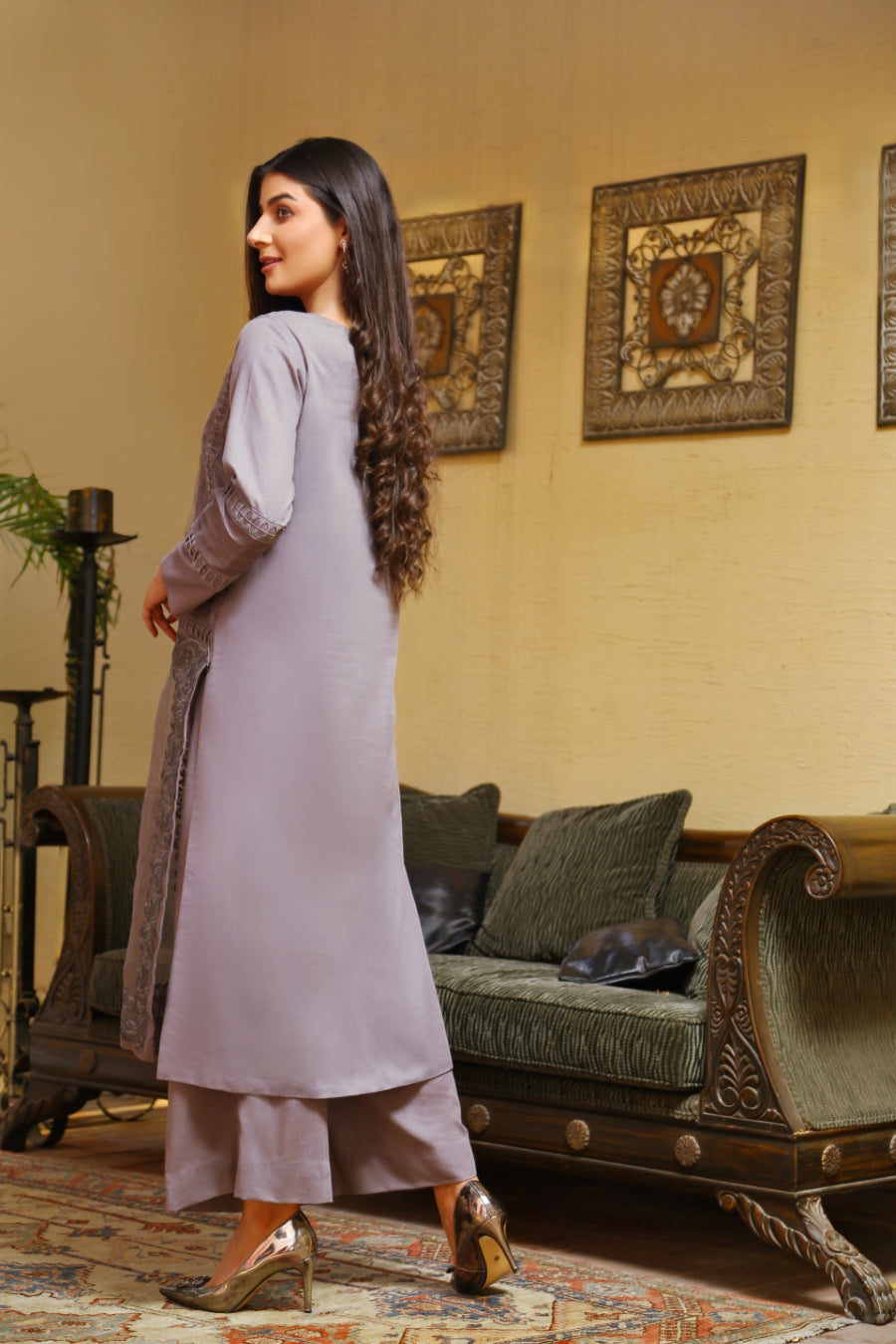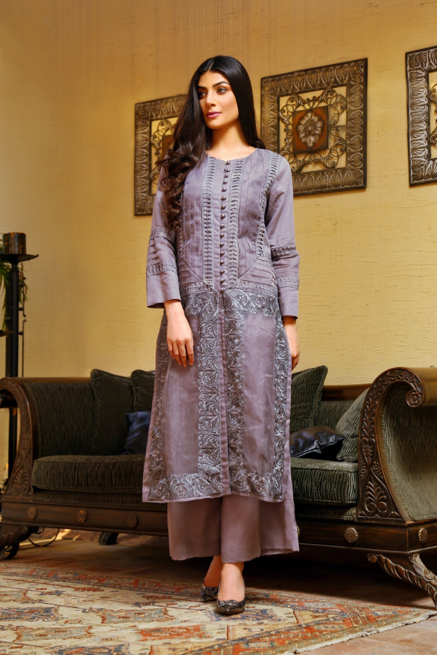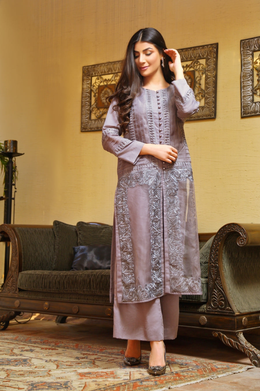 Product description: Ame brings to you an effortless blend of simplistic elegance and modernity this season. This two piece ensemble is curated from the finest winter karandi and adorned with heavy embroidery, pearls and organza.