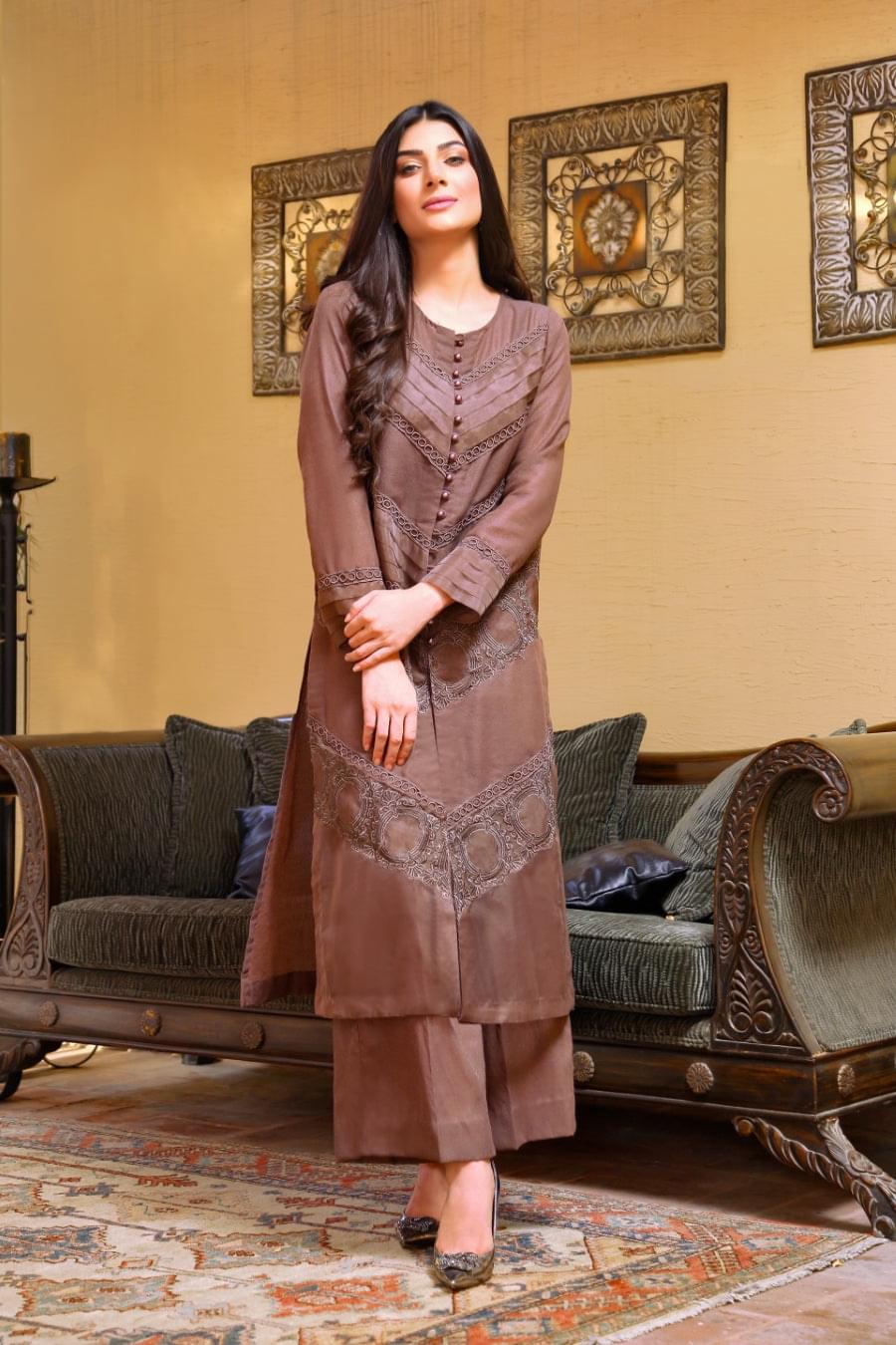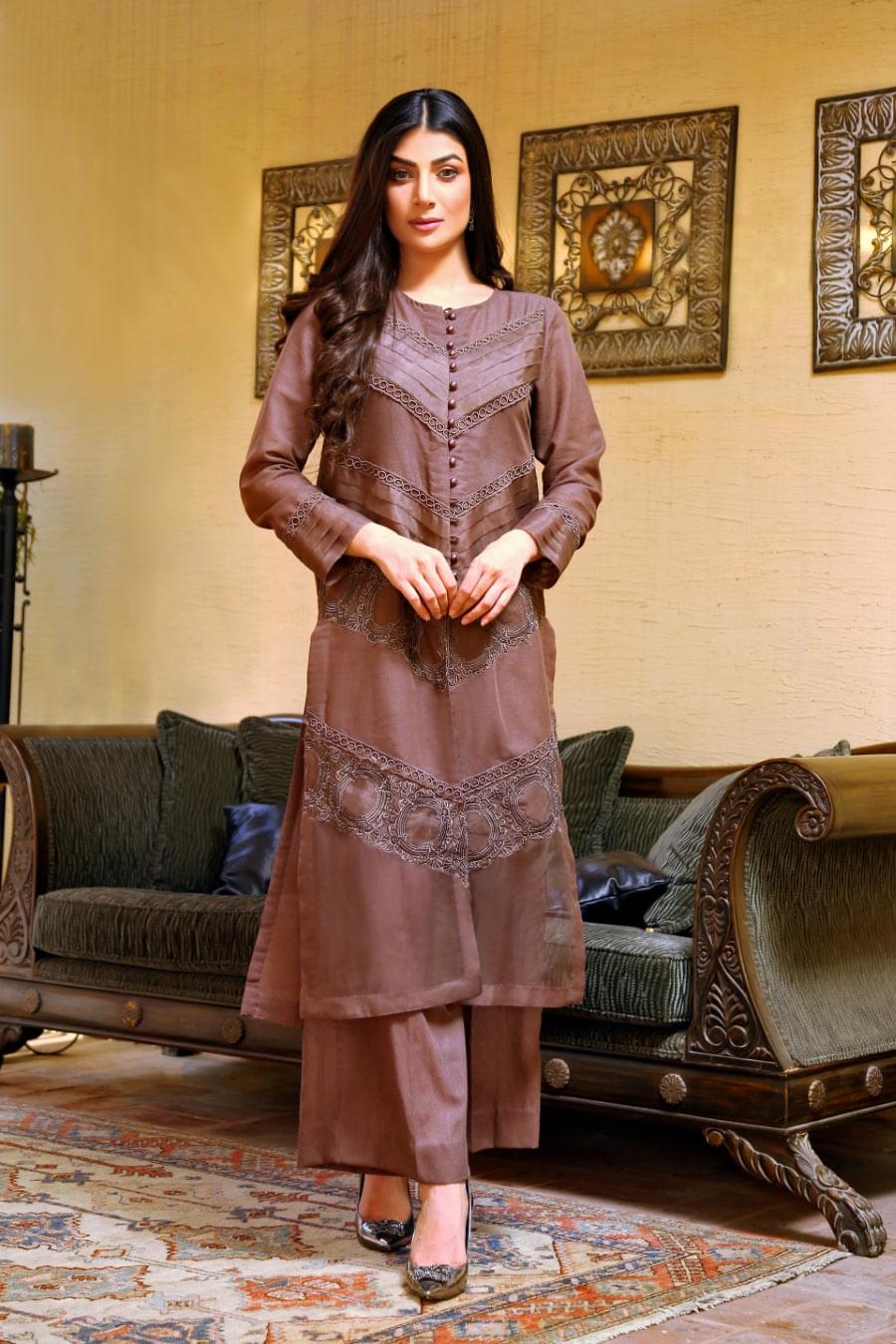 Product description: Ame brings to you an effortless blend of simplistic elegance and modernity this season. This two piece ensemble is curated from the finest winter karandi and adorned with heavy embroidery, pearls and organza.