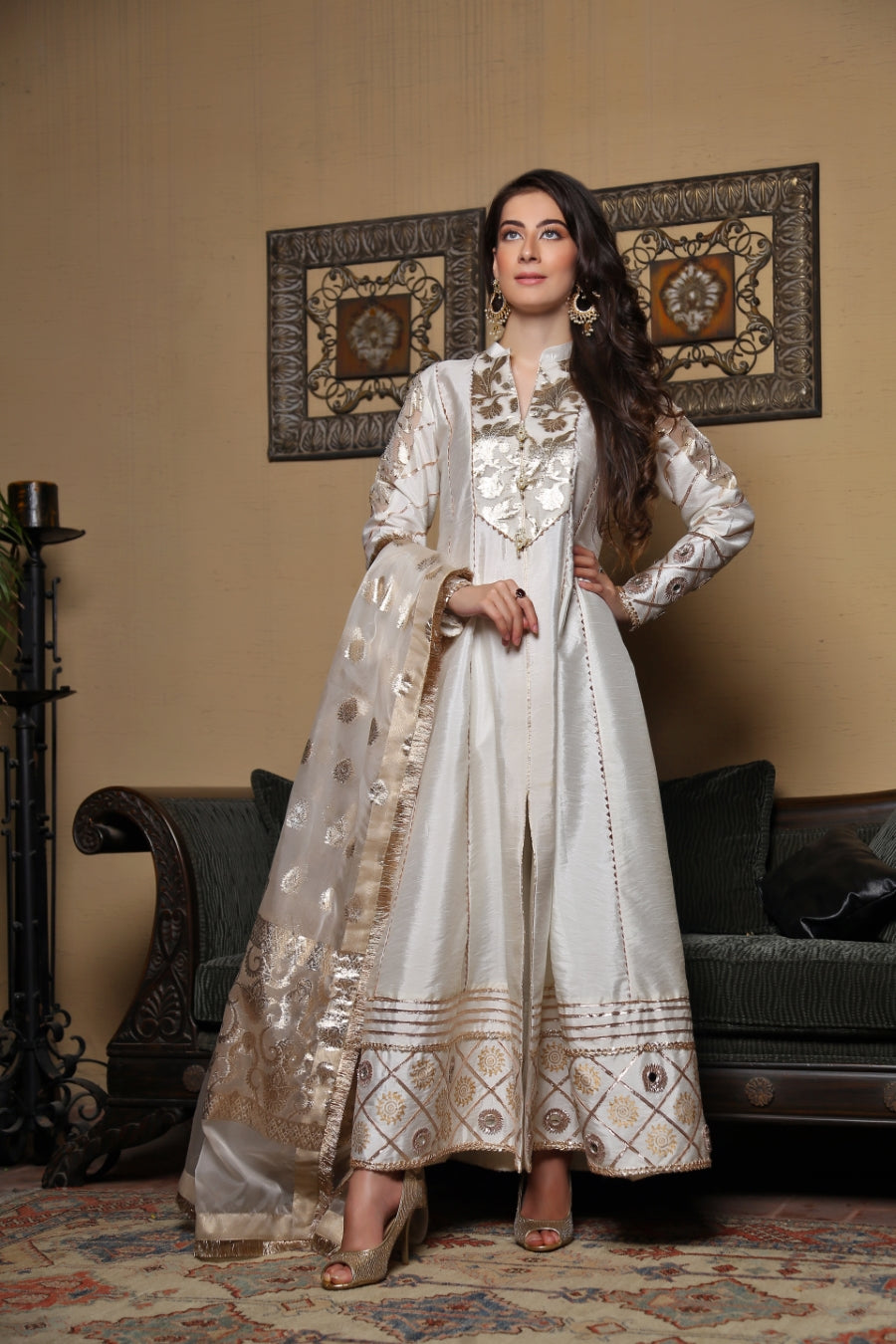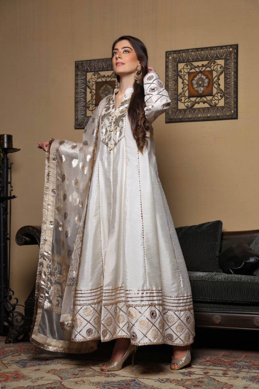 This stunning pearl white pishwas is sure to make heads turn this wedding season. Decadently decorated with floral gold prints and paired with a printed organza dupatta to elegantly tie the look together.