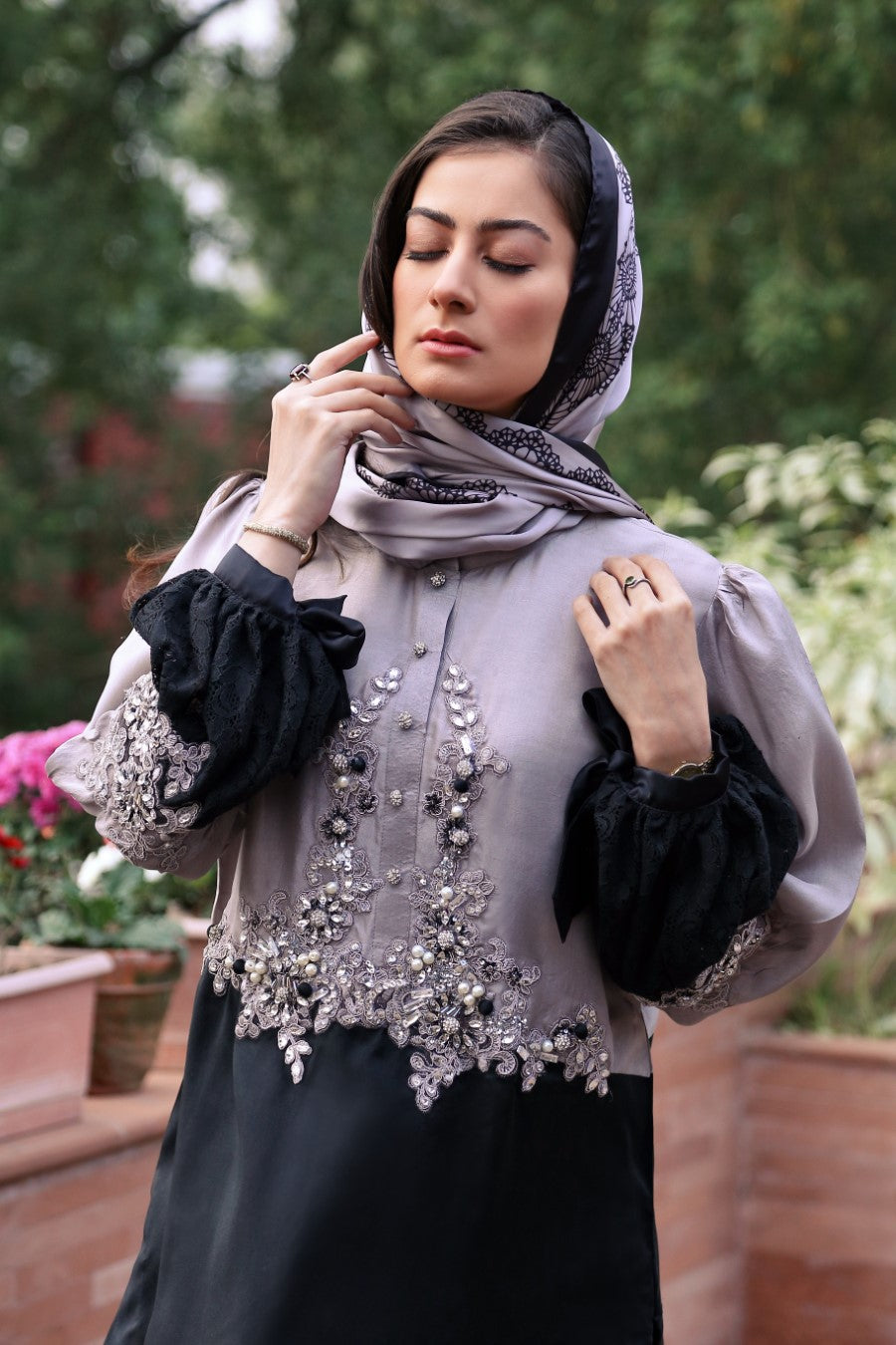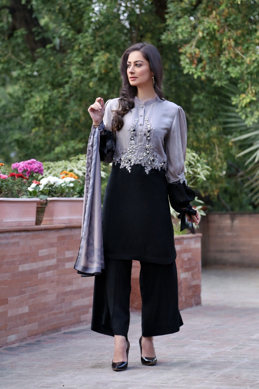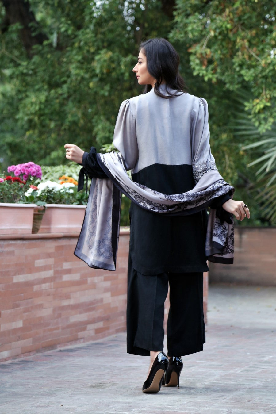 Crafted from rich luxurious pure raw silk, this three piece ensemble is sure to make the perfect style statement for you this winter season. Styled effortlessly with modern cuts and silhouettes and paired with a rich pure silk scarf to neatly tie the look together.