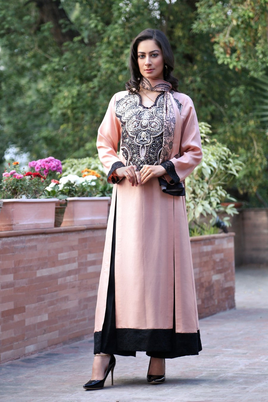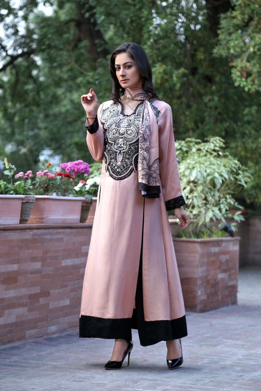 Crafted from rich luxurious pure raw silk, this three piece ensemble is sure to make the perfect style statement for you this winter season. Styled effortlessly with modern cuts and silhouettes and paired with a rich pure silk scarf to neatly tie the look together.