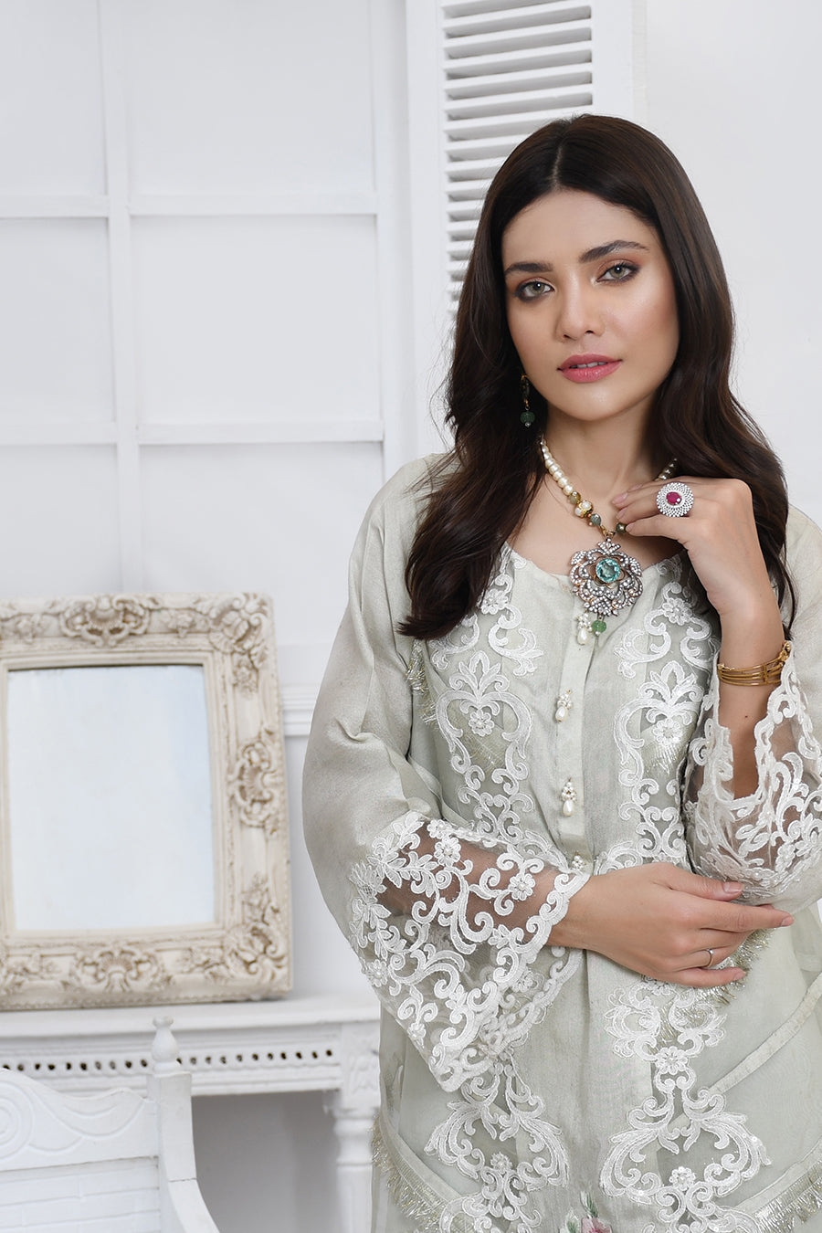 This Eid adorn yourself with our gorgeous pastel luxury collection! This elegant pastel green ensemble is crafted from the best summer cotton net and further decorated with detailed and heavy lace and embroidery work all across the shirt, hem and sleeves. The neckline and hem are embellished with pearls and the outfit is paired with matching pastel green cigarette pants.