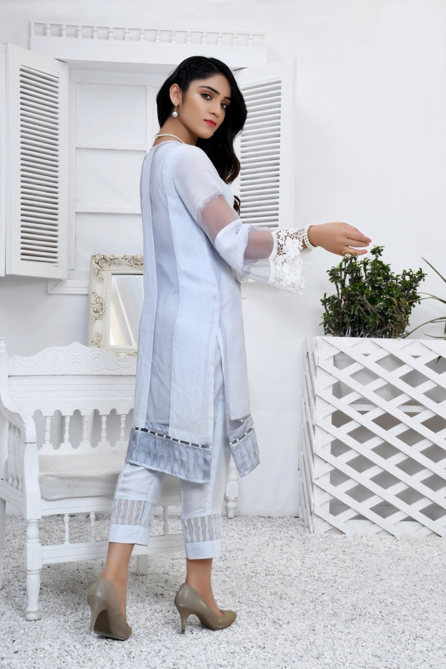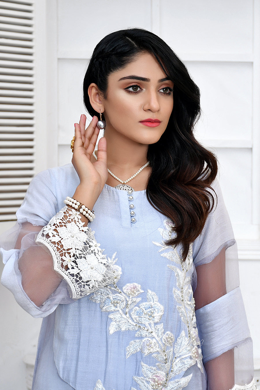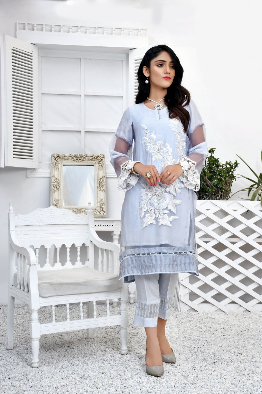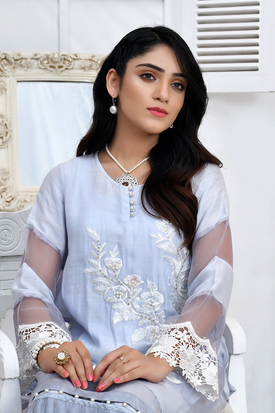 This Eid adorn yourself wih our gorgeous pastel luxury collection! This pastel blue ensemble is crafted from the finest cotton net and decorates with organza, lace and embroidery. The front of the shirt is embroidered and further embellished with pearls to add more grace to it. The look is completed with matching pants that are adorned with an organza patch at the end.