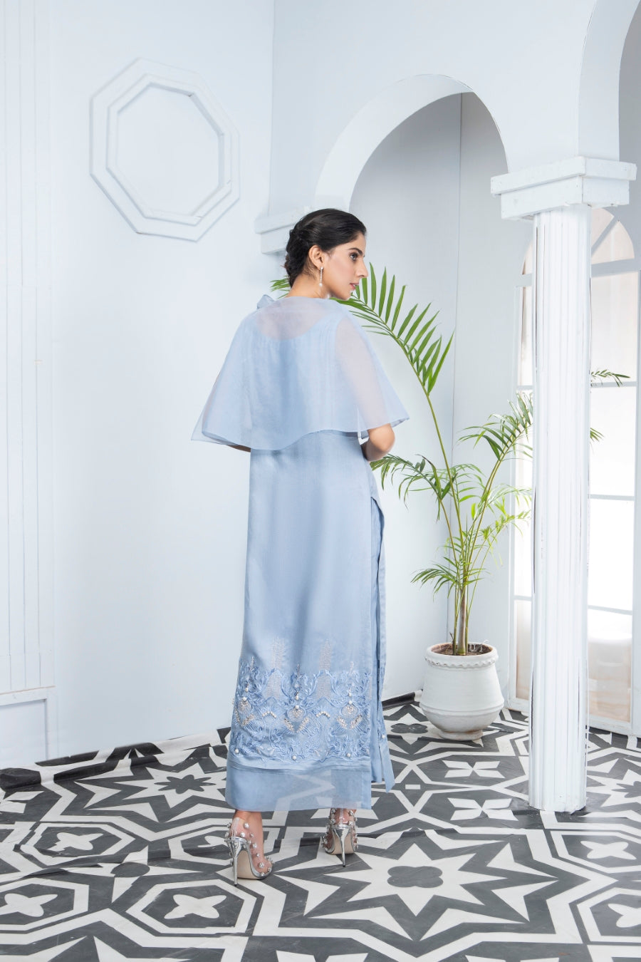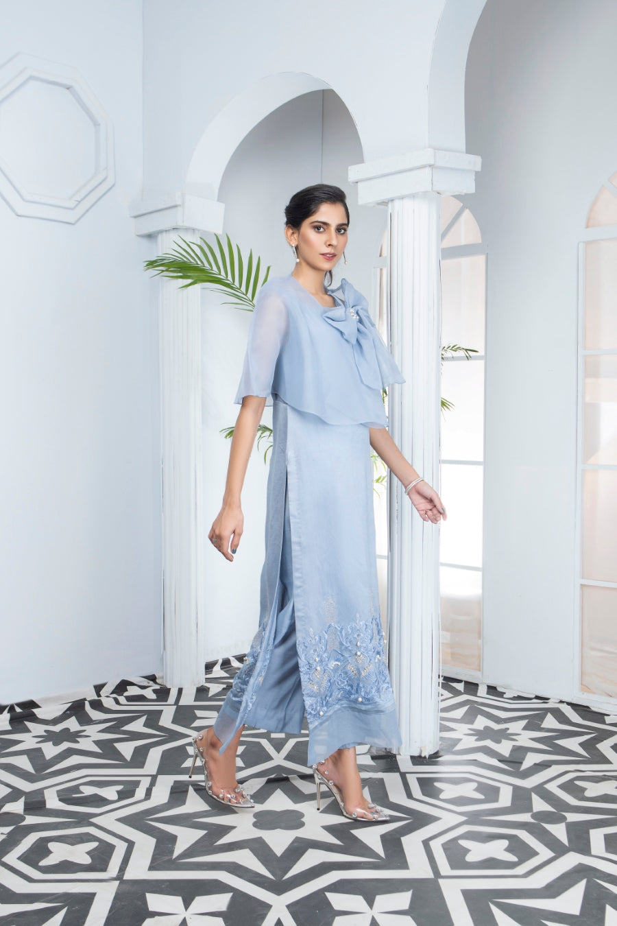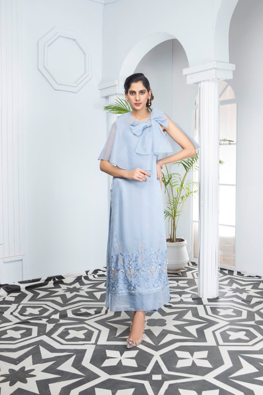 We've got the perfect head turner ensembles ready for you this season! Beautiful light blue pastel hues made from khaadi net and organza. The neckline is styled with a statement making organza bow that is further decorated with swaroski stones. The shirt is styled as a long shirt and the hem is heavily embroidered and lightly embellished with pearls. The outfit is two-piece.