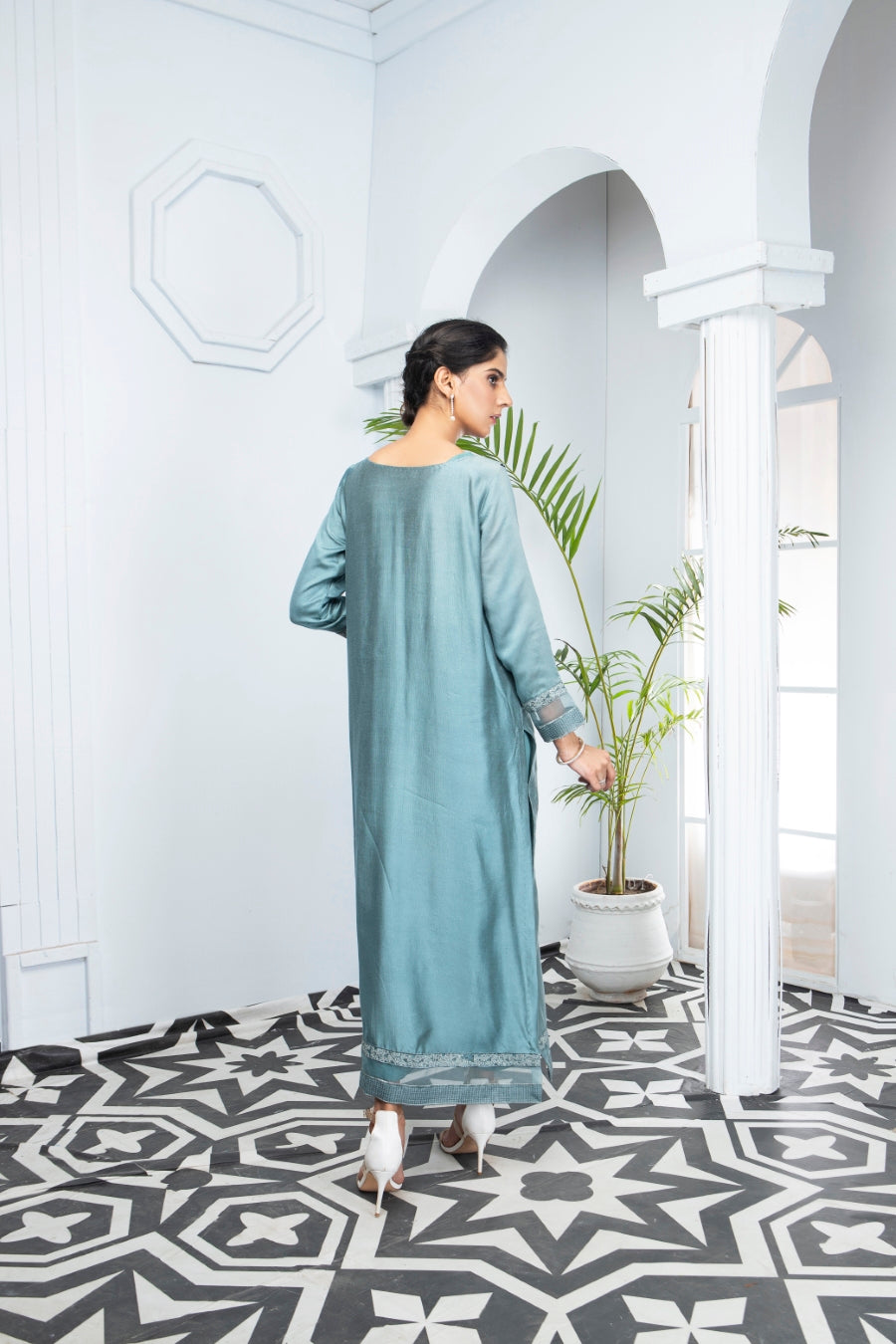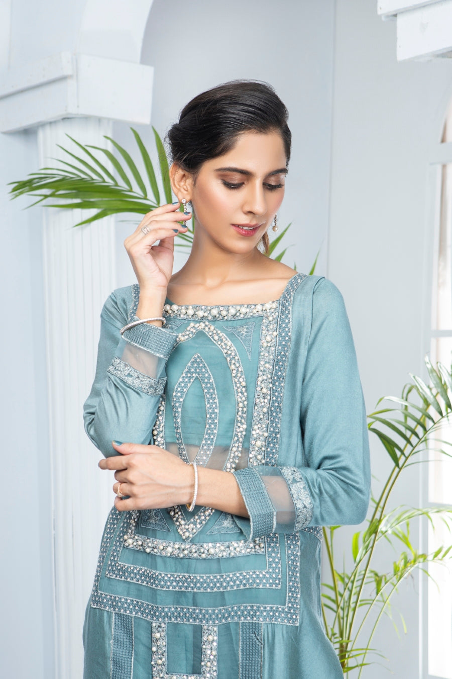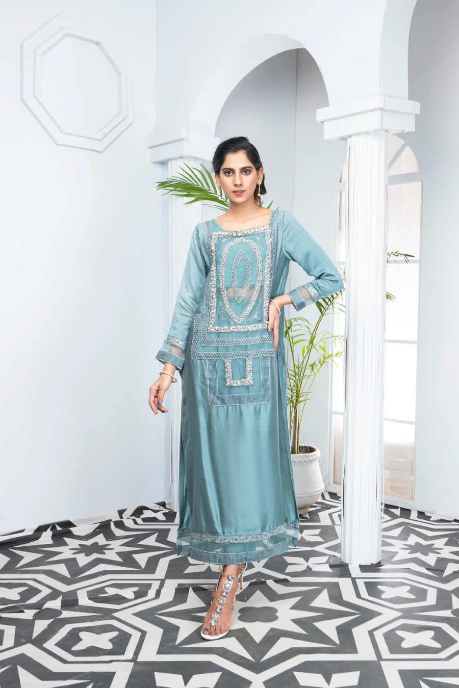 We've got the perfect head turner ensembles ready for you this season! Beautiful blue hues made from khaadi net, and organza. The front of the shirt is heavily embellished with organza, pearls and sequins. The shirt is a long shirt and the outfit is two-piece.