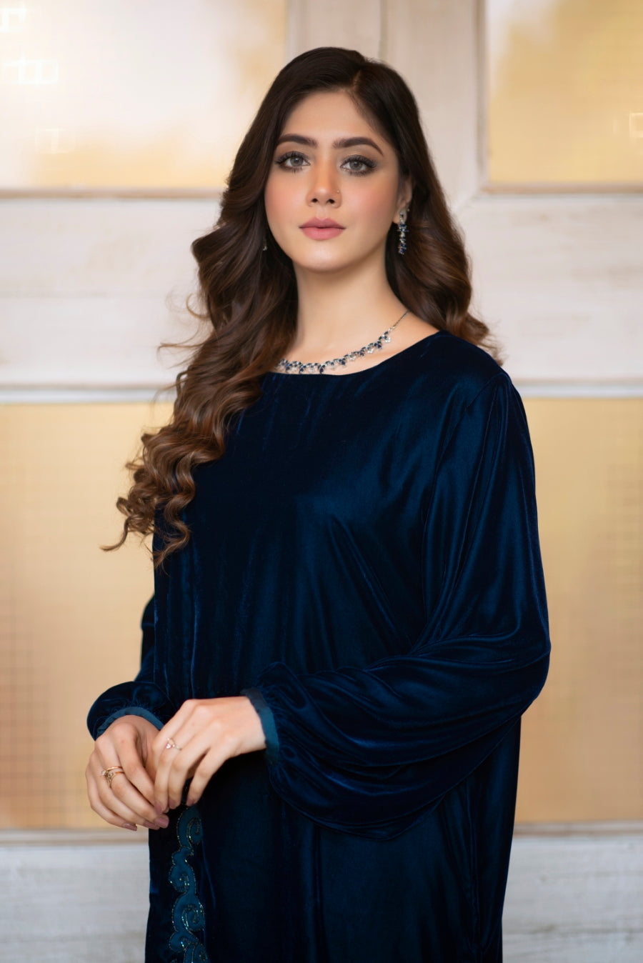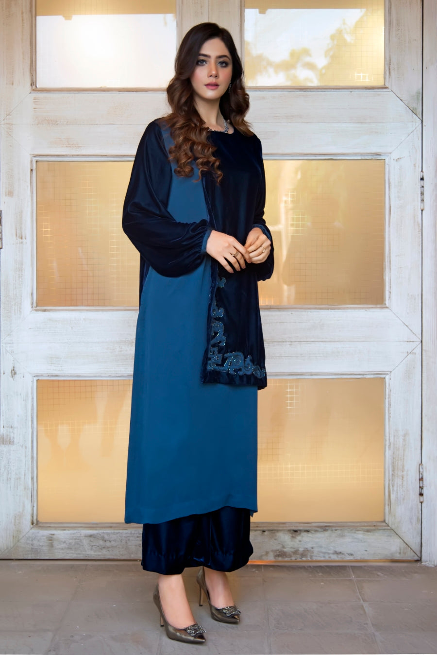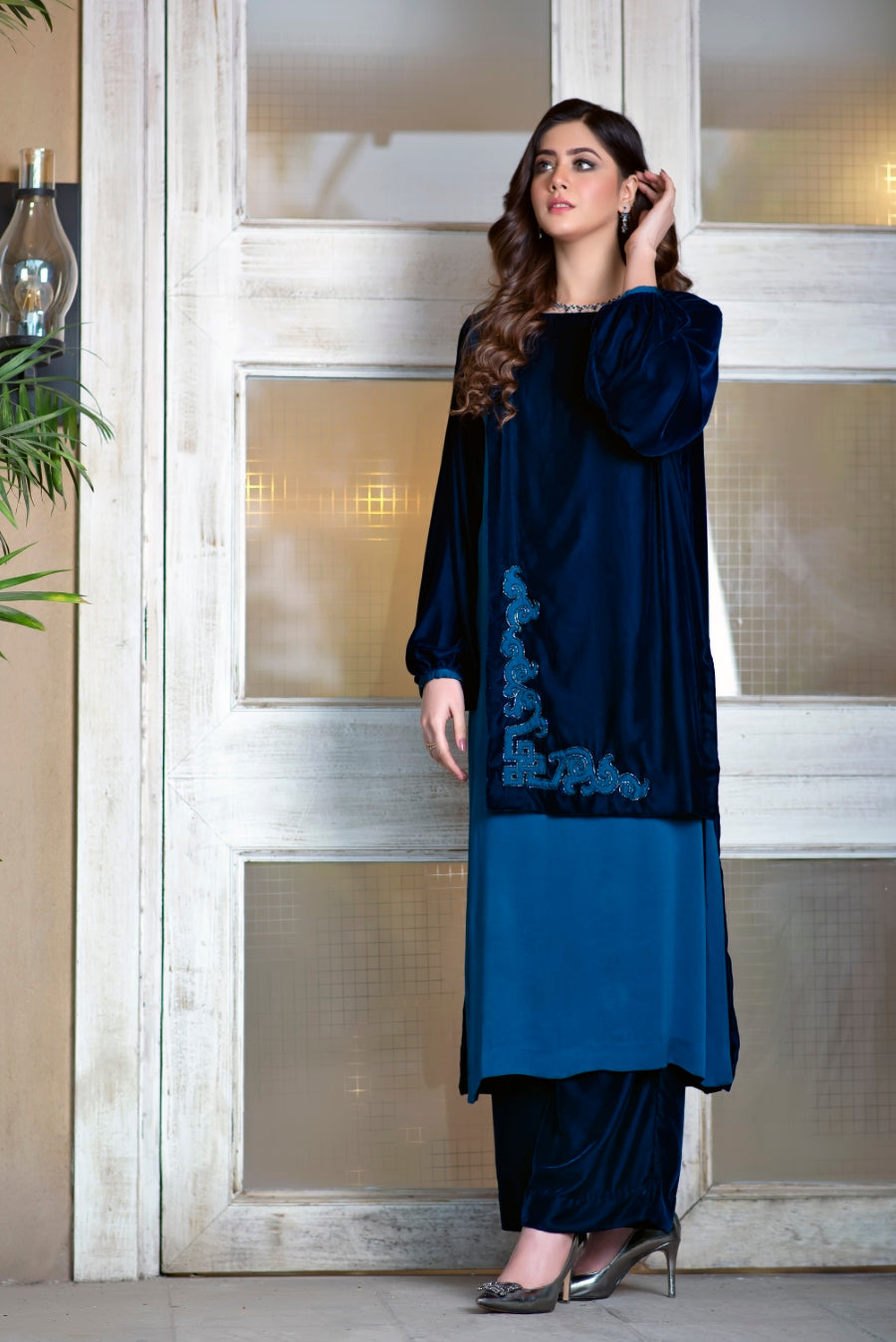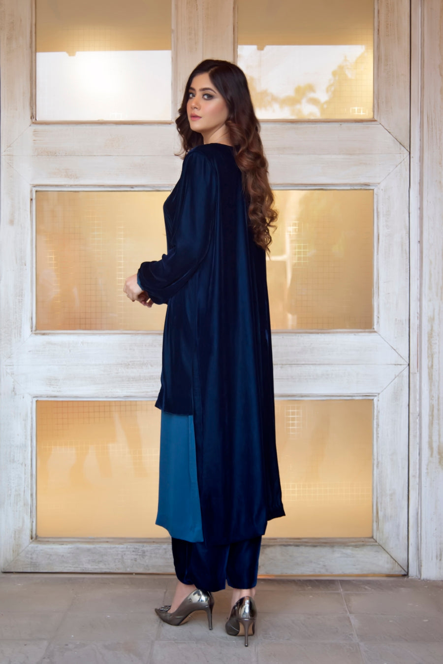 A stunning blue two-toned velvet long shirt with velvet balloon sleeves and velvet trouses to neatly tie the look together. The front of the shirt features some detailed embellishment