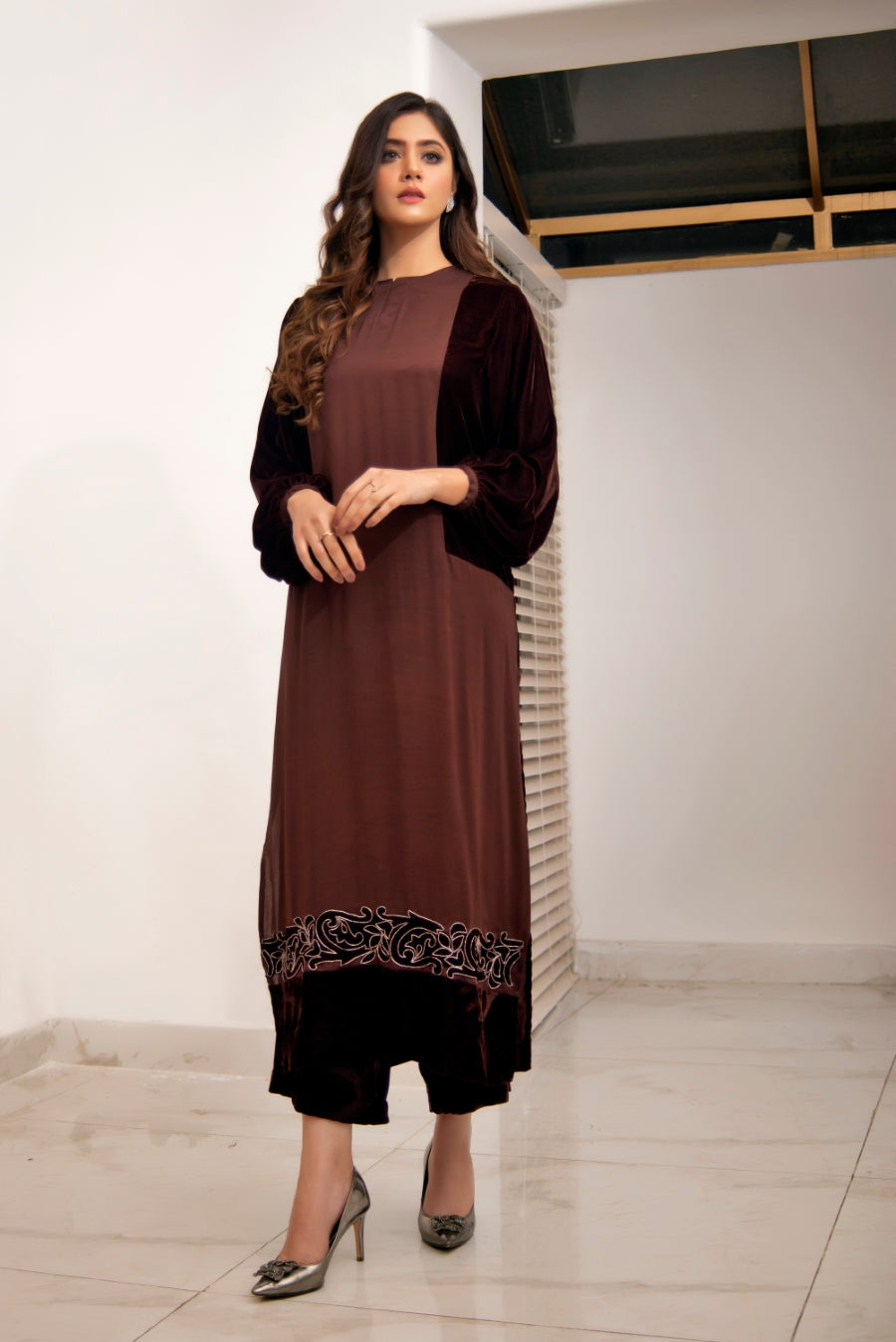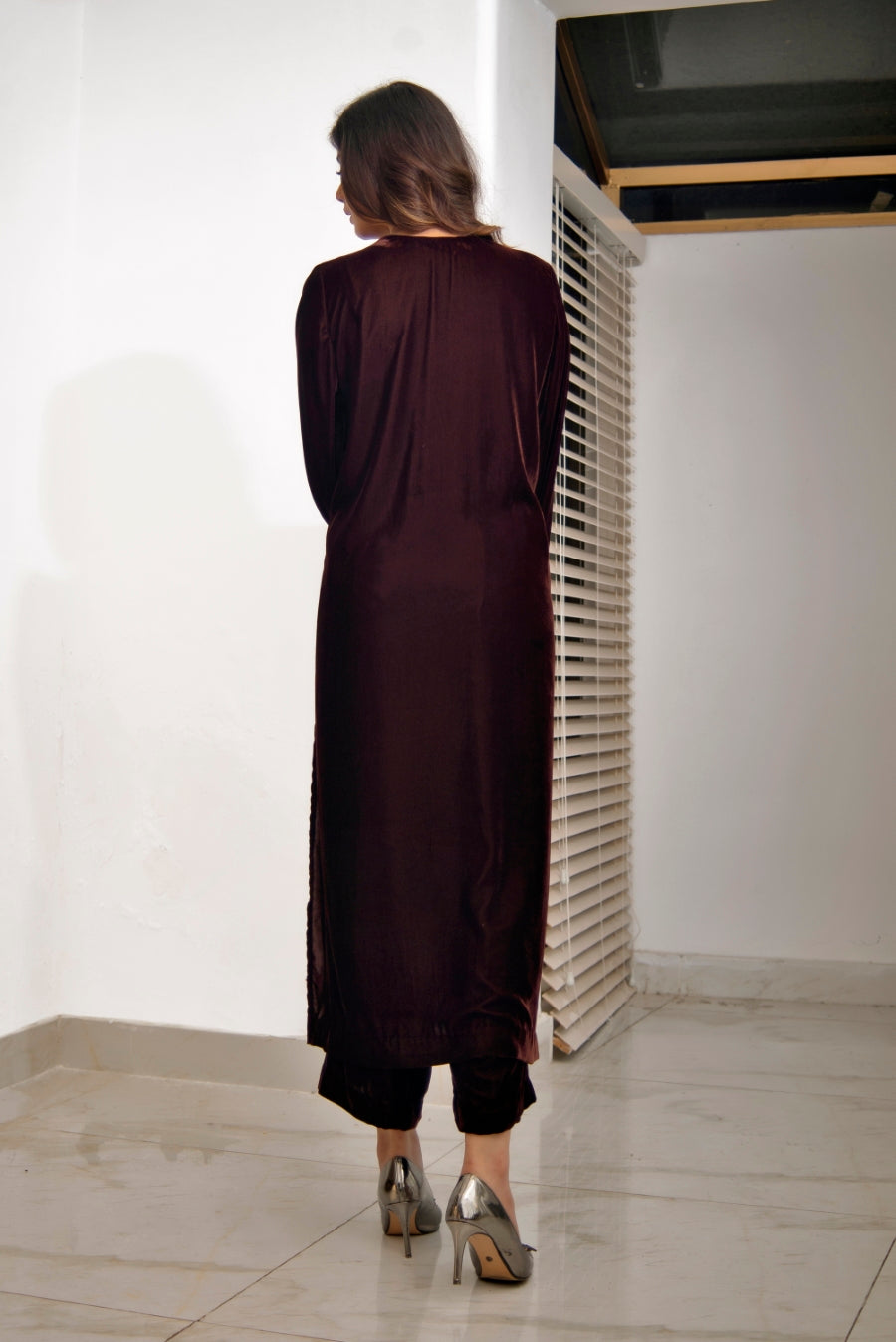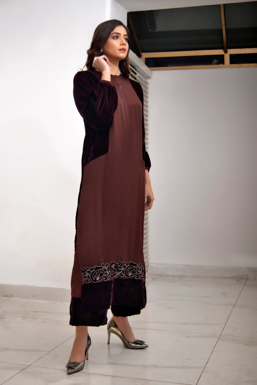 A stunning brown two-toned velvet long shirt with velvet balloon sleeves and velvet trouses to neatly tie the look together.