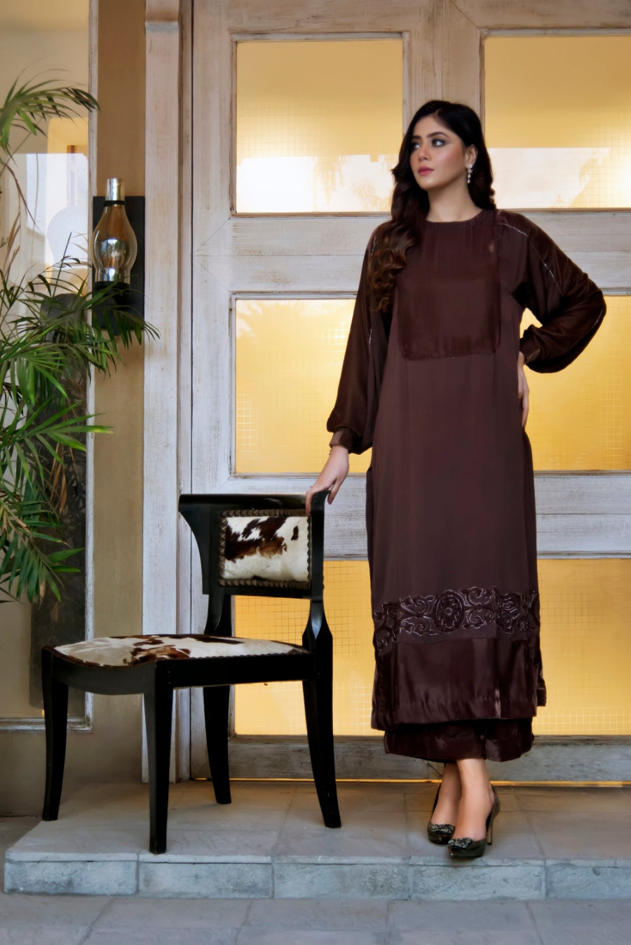 A gorgeous brown two-toned velvet shirt with balloon sleeves and velvet loose trousers to complete the look.