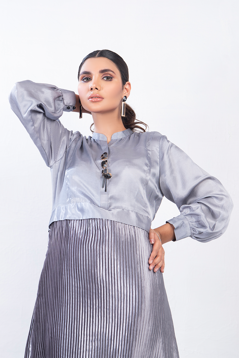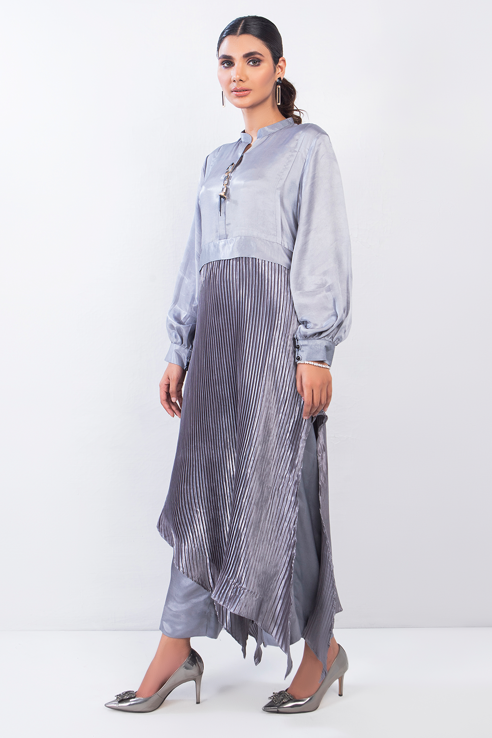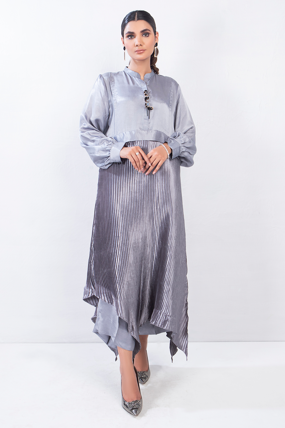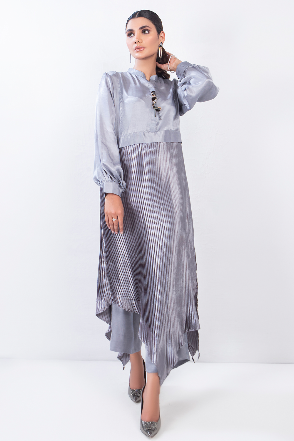 Made from number 5silk and crushed silk, this stylish grey ensemble is the perfect combination of elegance and class. Paired with loose grey trousers to neatly tie the look together.