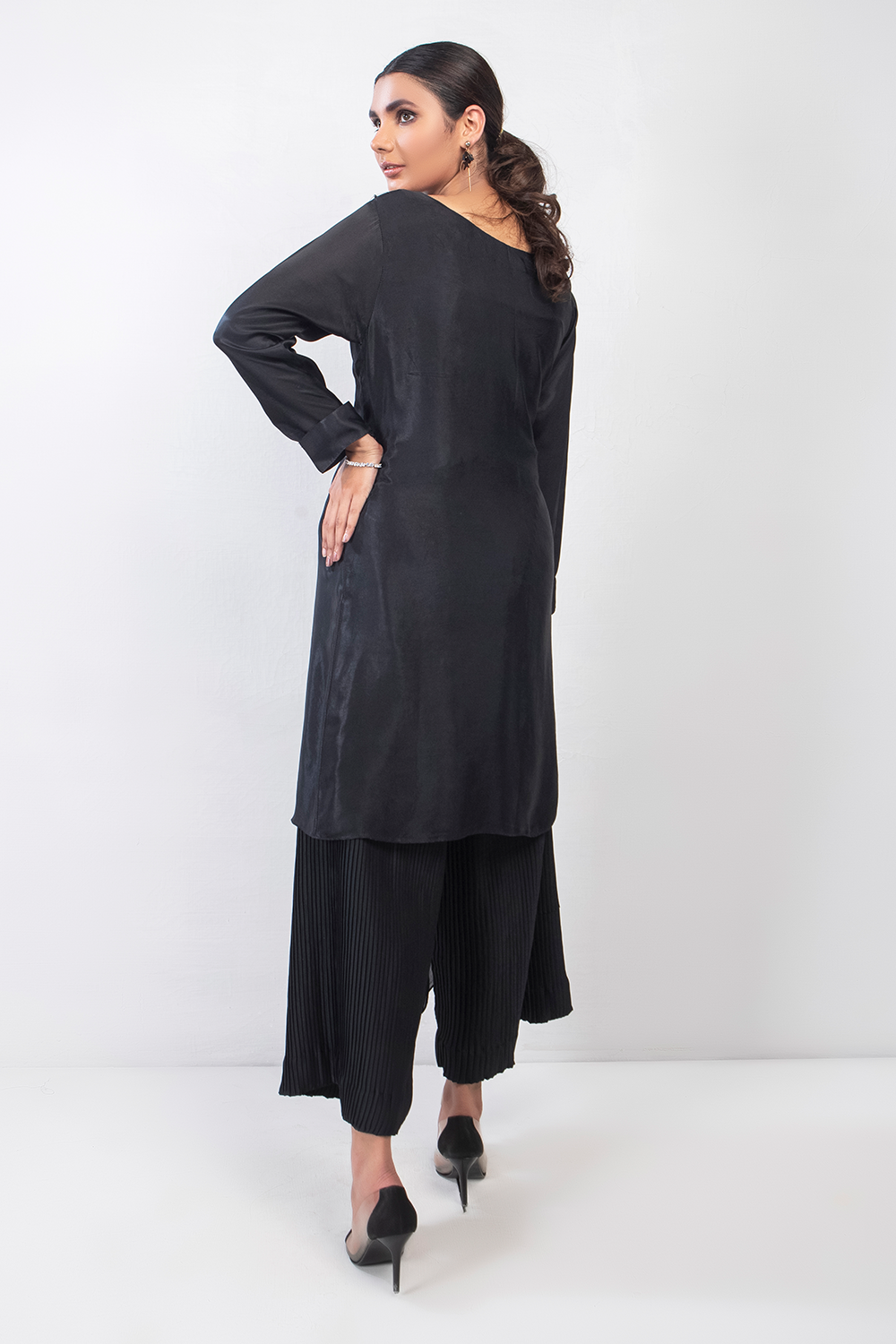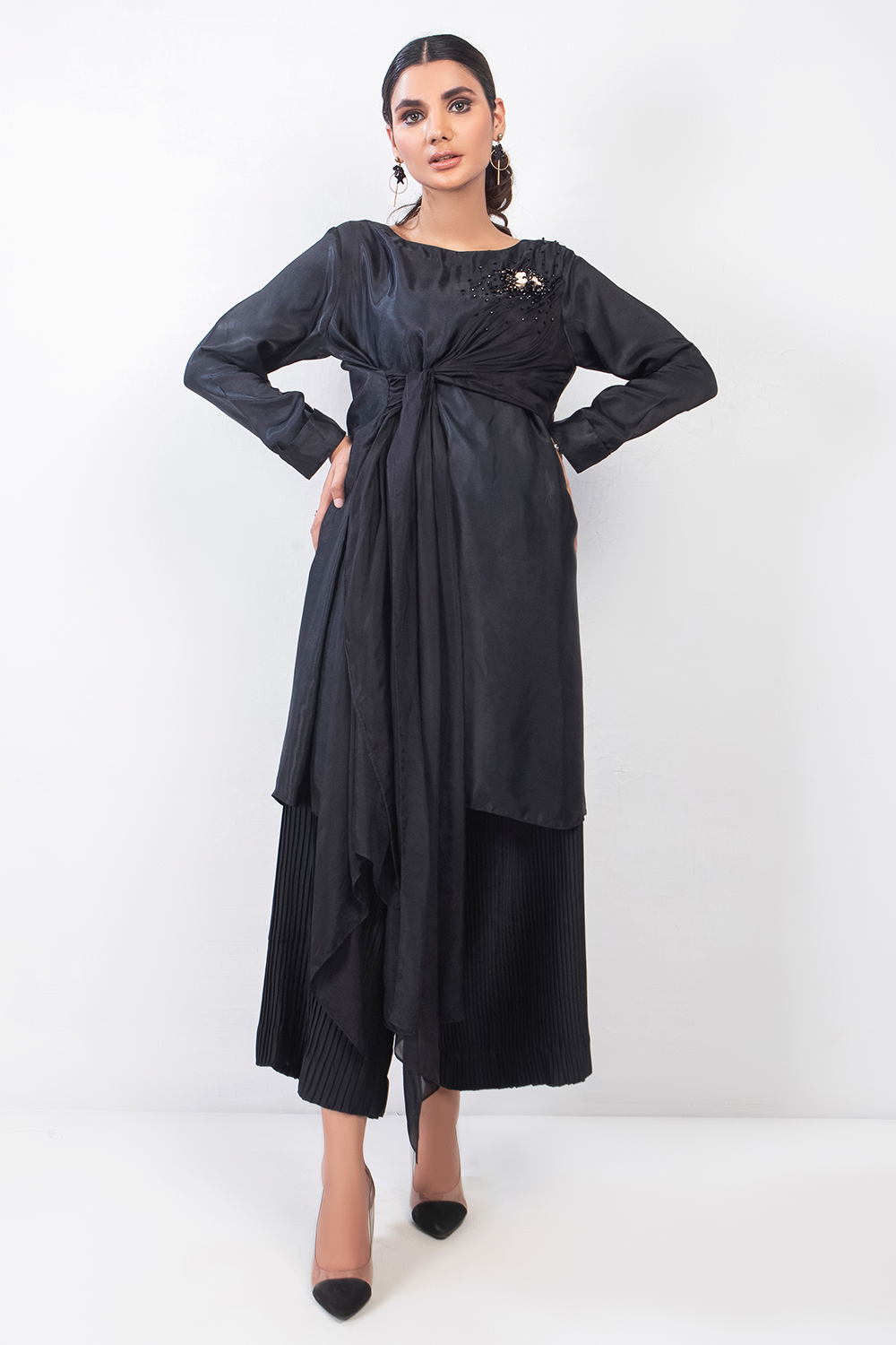 One can never have enough black outfits! This stunning statement piece is the perfect blend of west meets east. With light modern embellishment on the shoulder, paired with loose black pants.