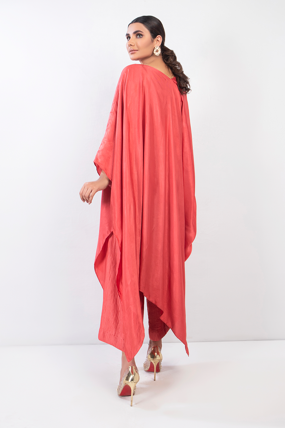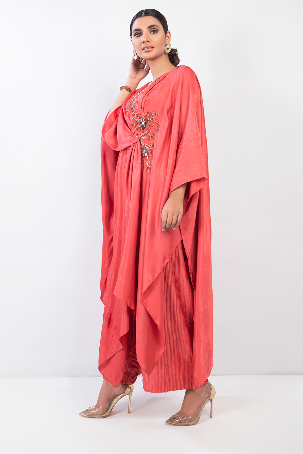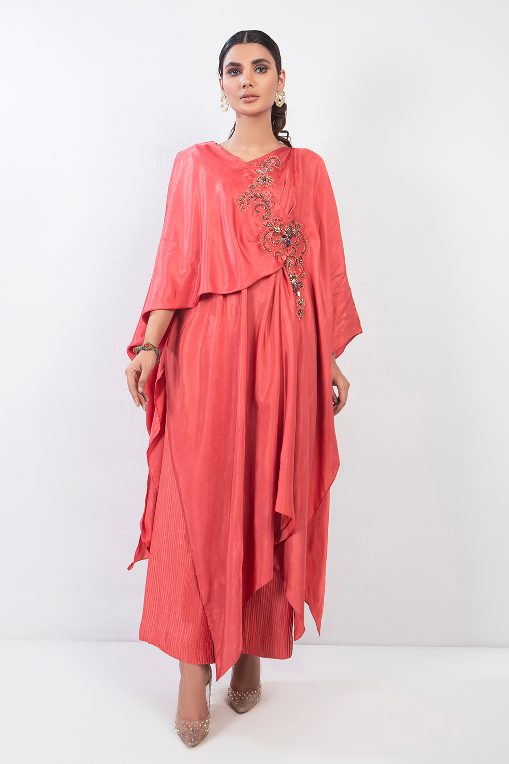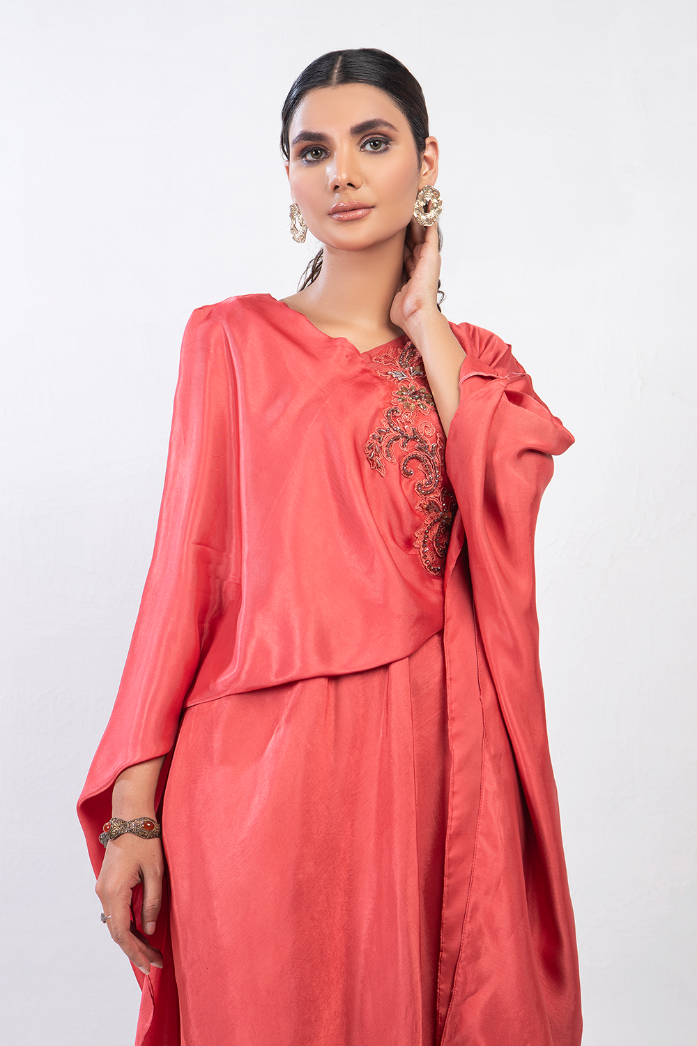 Using both silk and crushed silk, this coral pink ensemble is your dream look to have this summer. It's chic, yet casual look is it's biggest allure. Light embellishments on one side and paired with loose trousers.