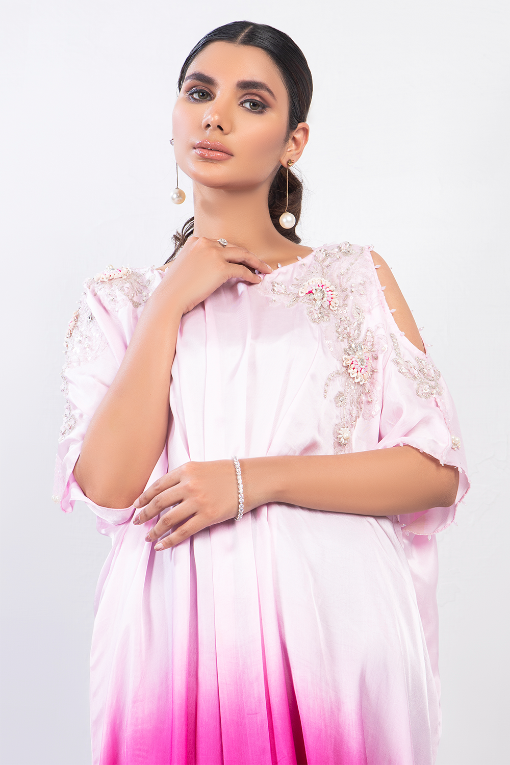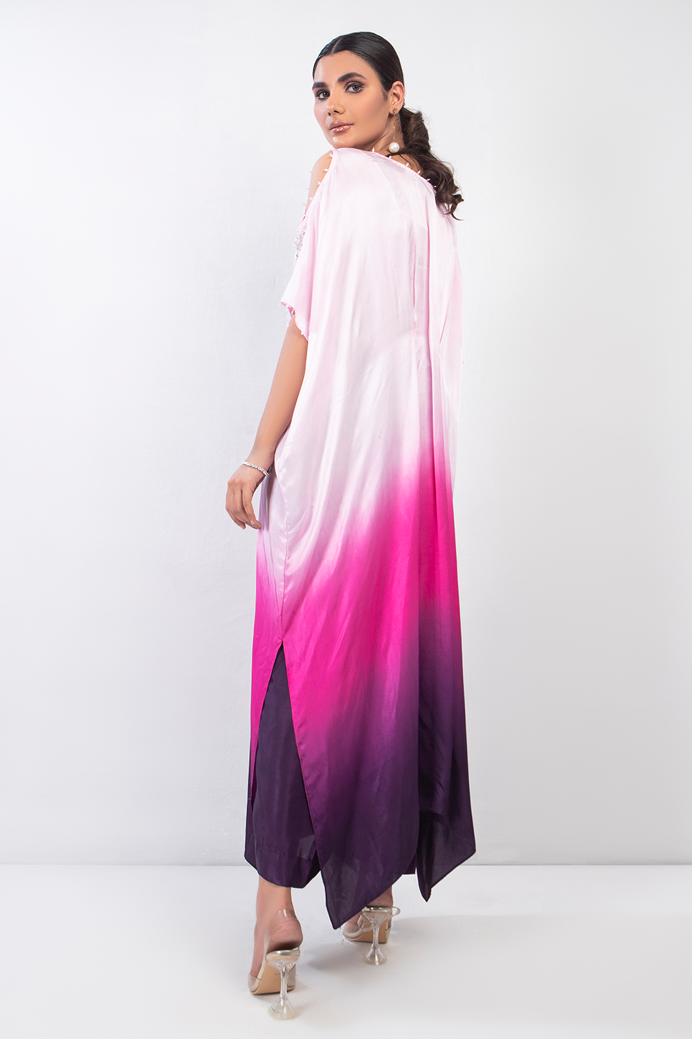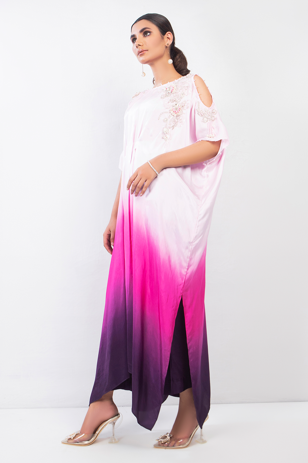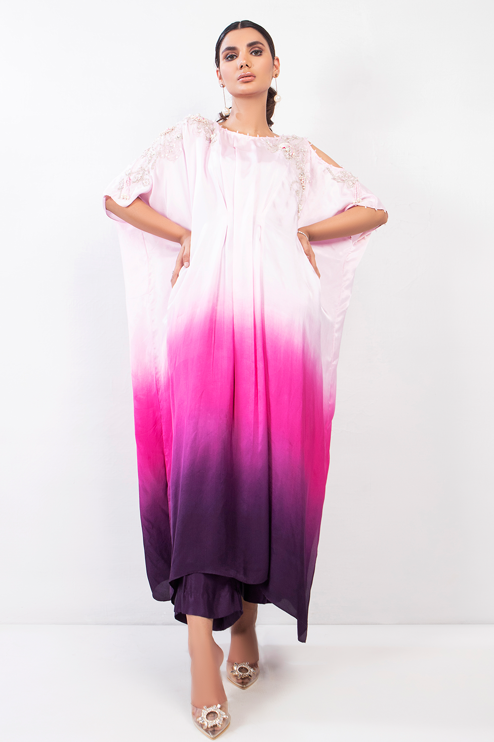 This ombre kaftan screams summer! This silk statement piece is a must have in your closet this season. It features embellishments on the sleeves and shoulders. The sleeve is styled as a cold shoulder and the look perfectly comes together with matching pants.