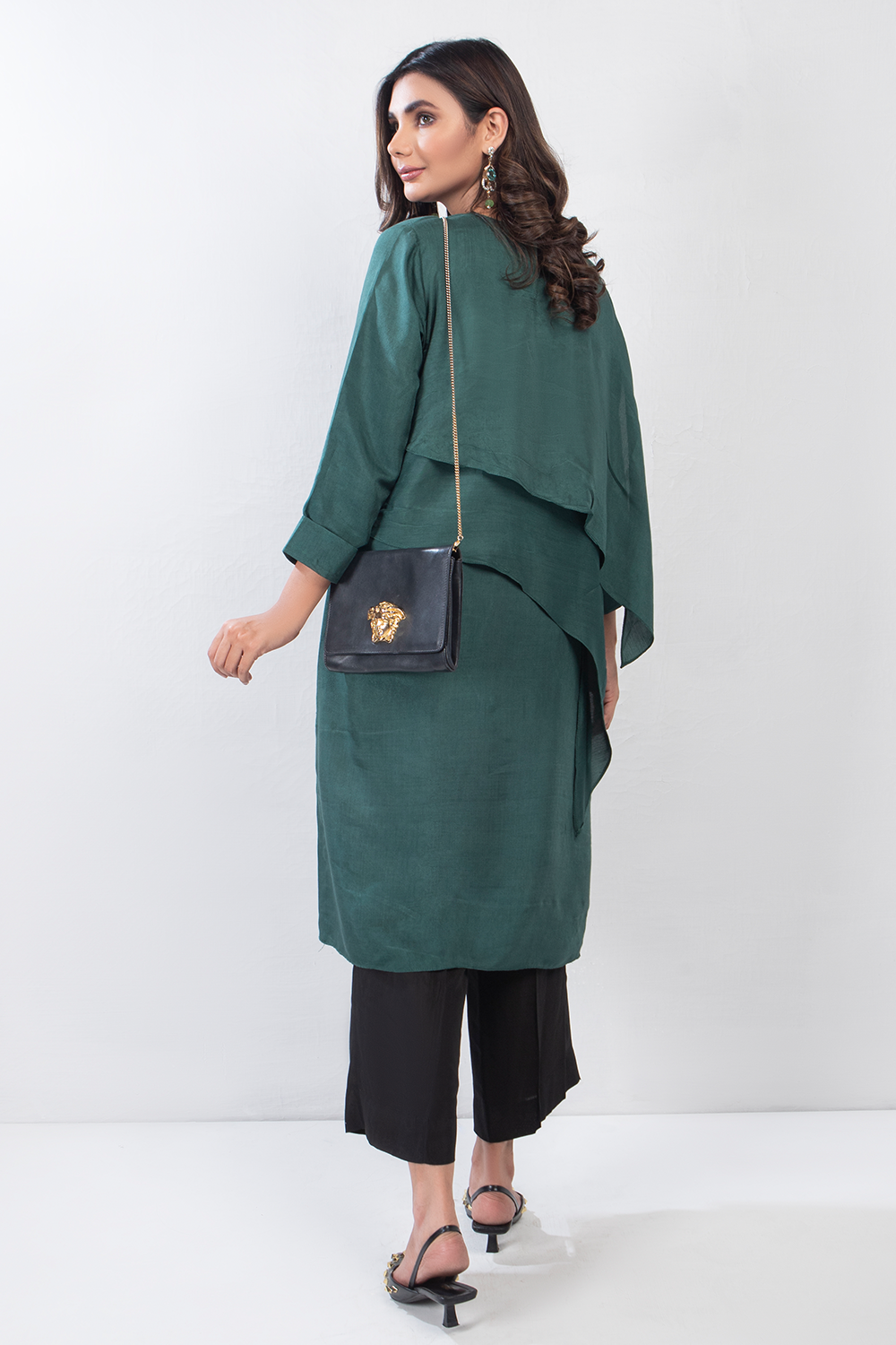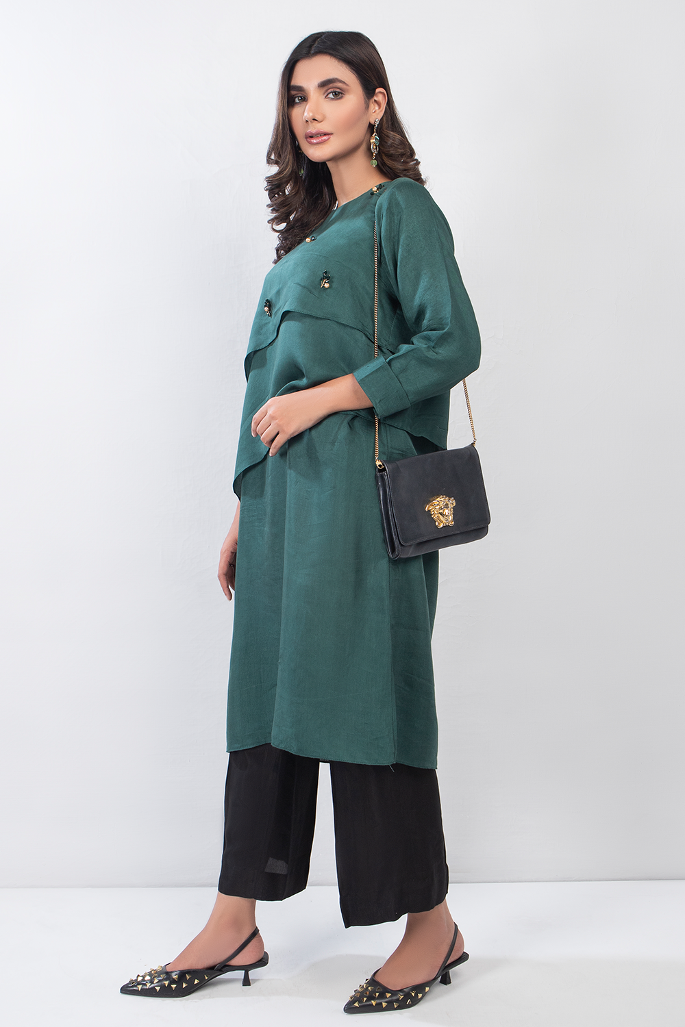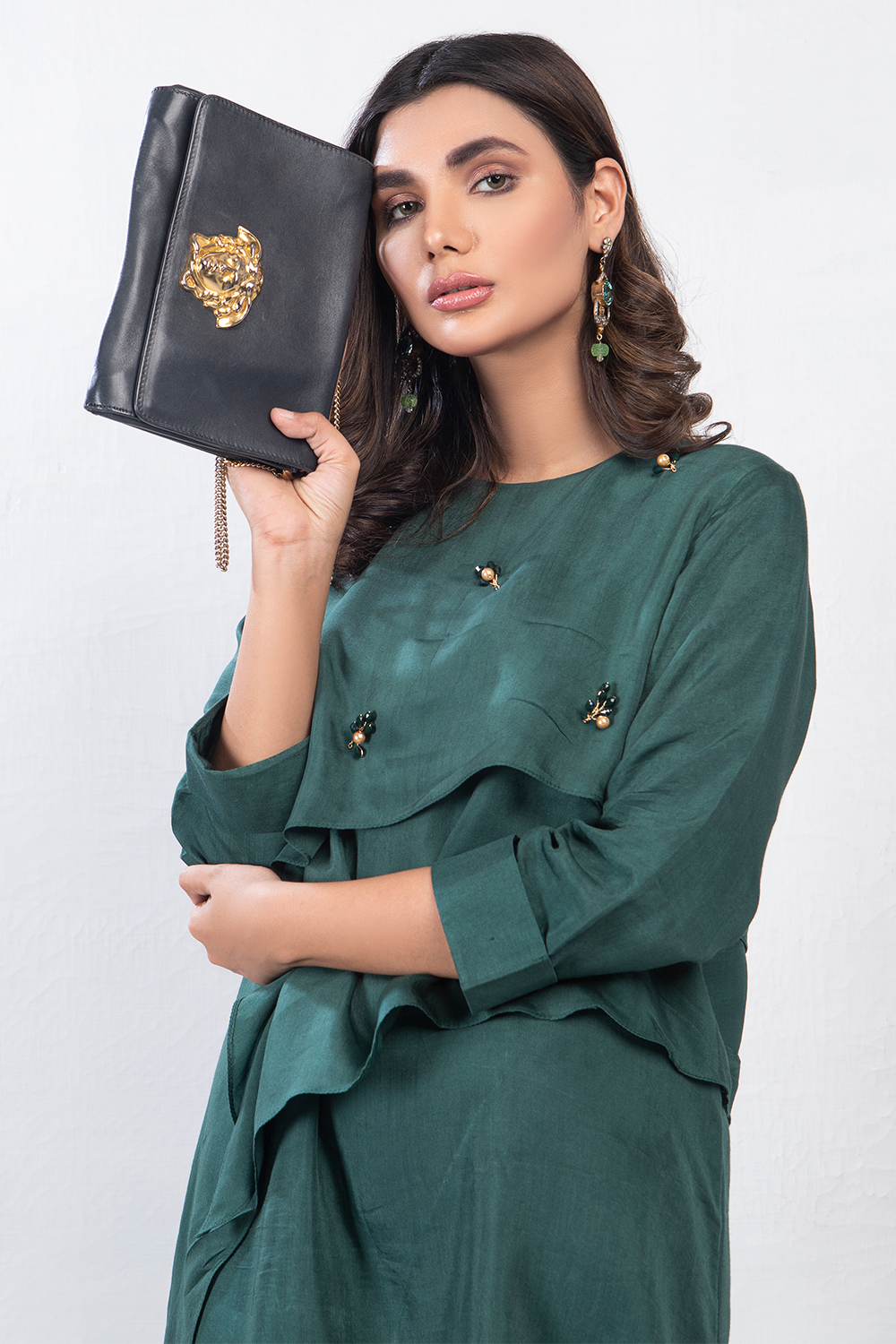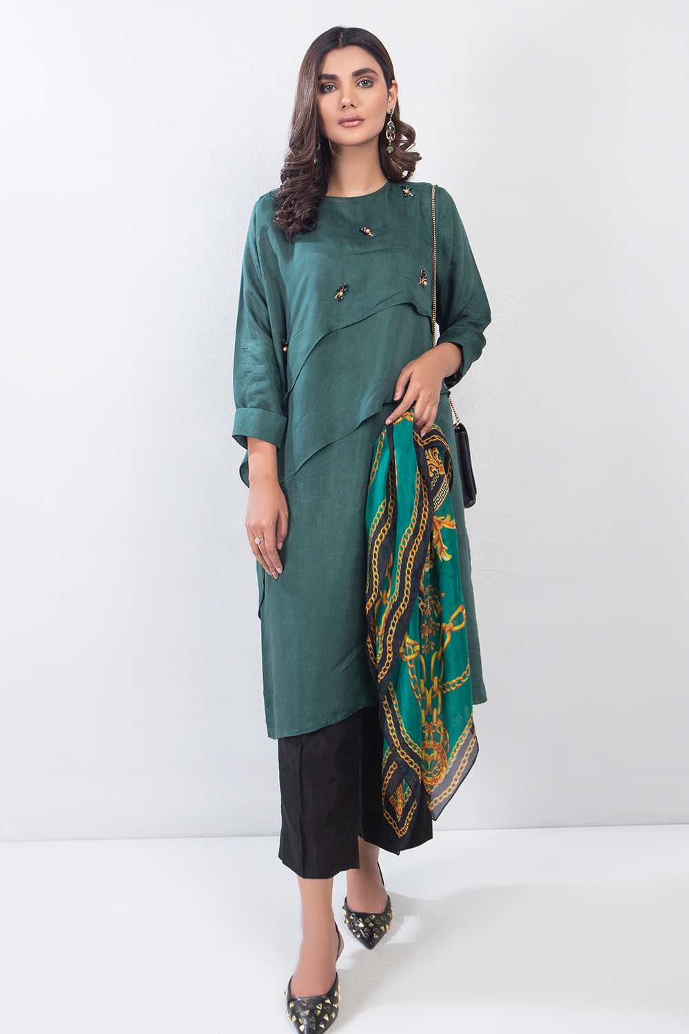 A cotton silk teal green shirt with light embellished motifs, paired with a digitally printed silk scarf.