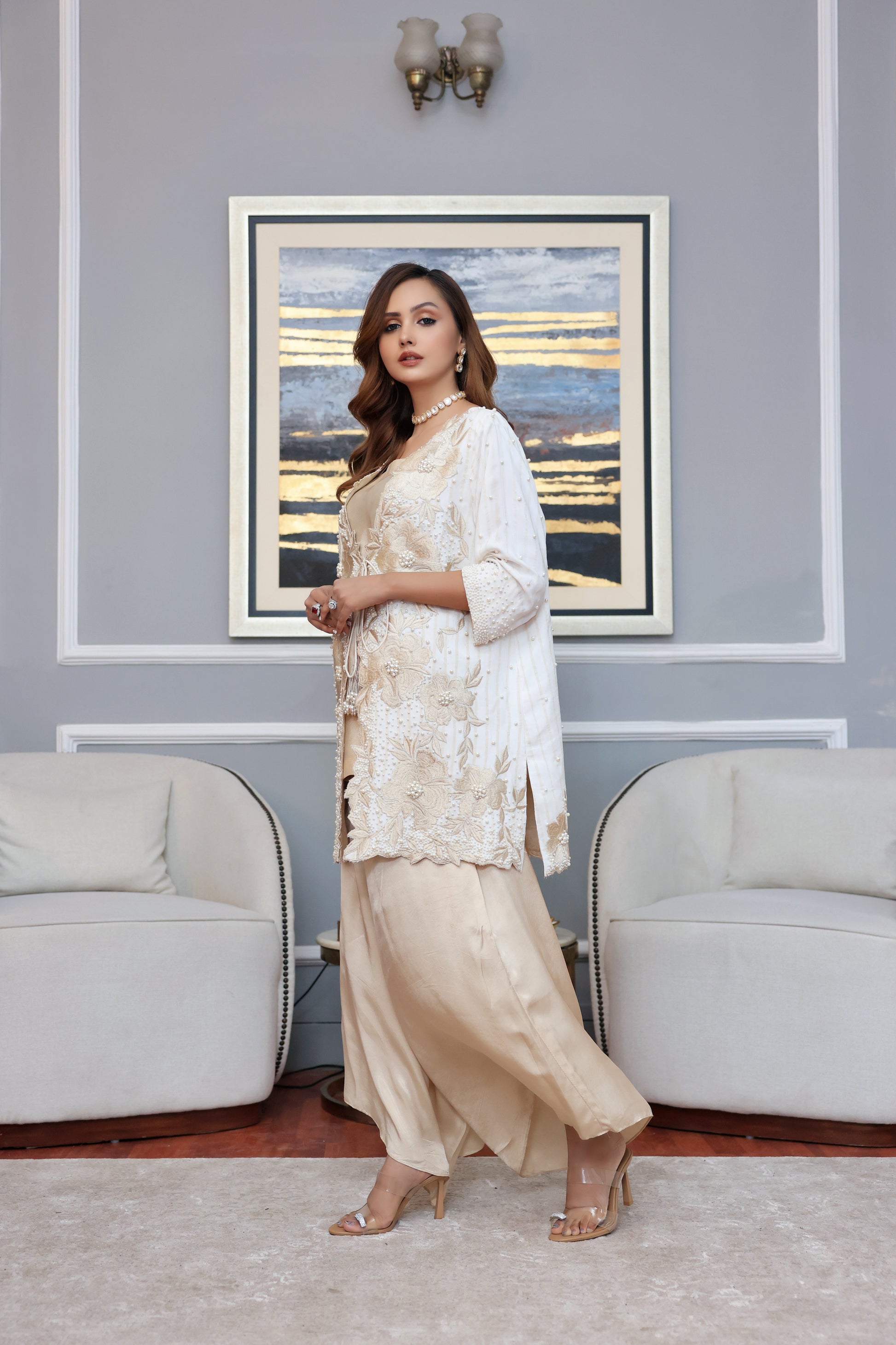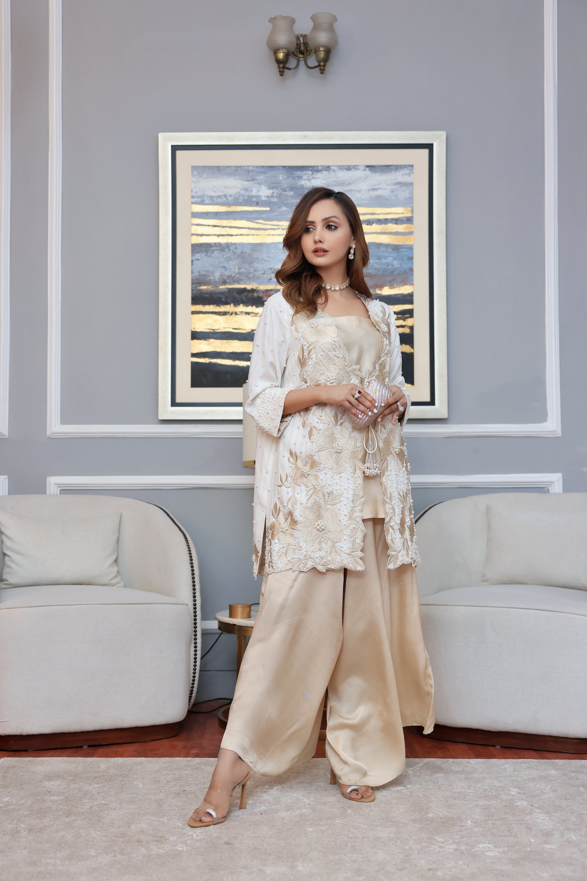 2 Piece Fabric karrandy Silk embelished with resham embroidery and hand work with pearls. Loose cut pants.