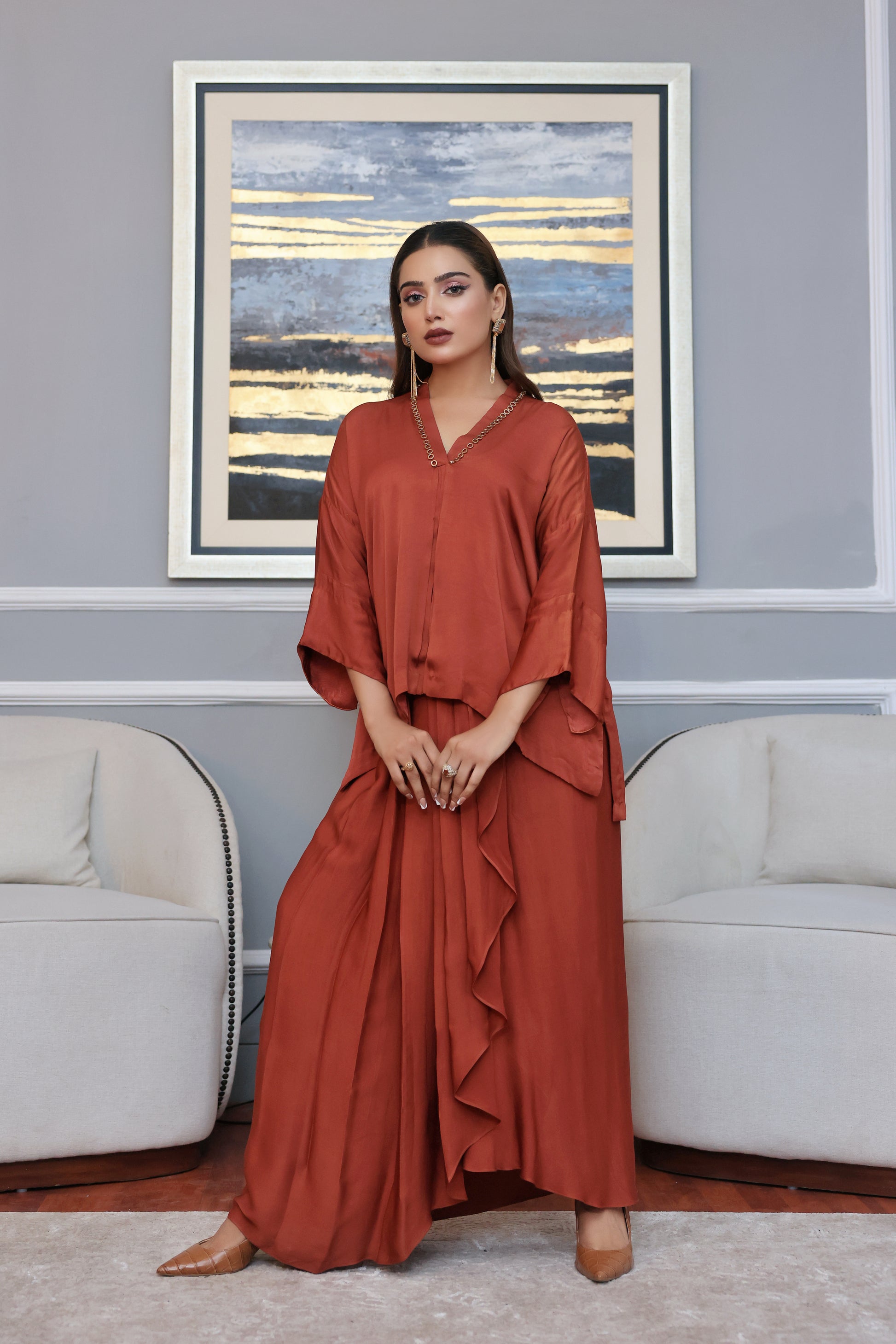 2 Piece Fabric karrandy Silk embelished with resham embroidery and hand work with pearls. Loose cut pants.