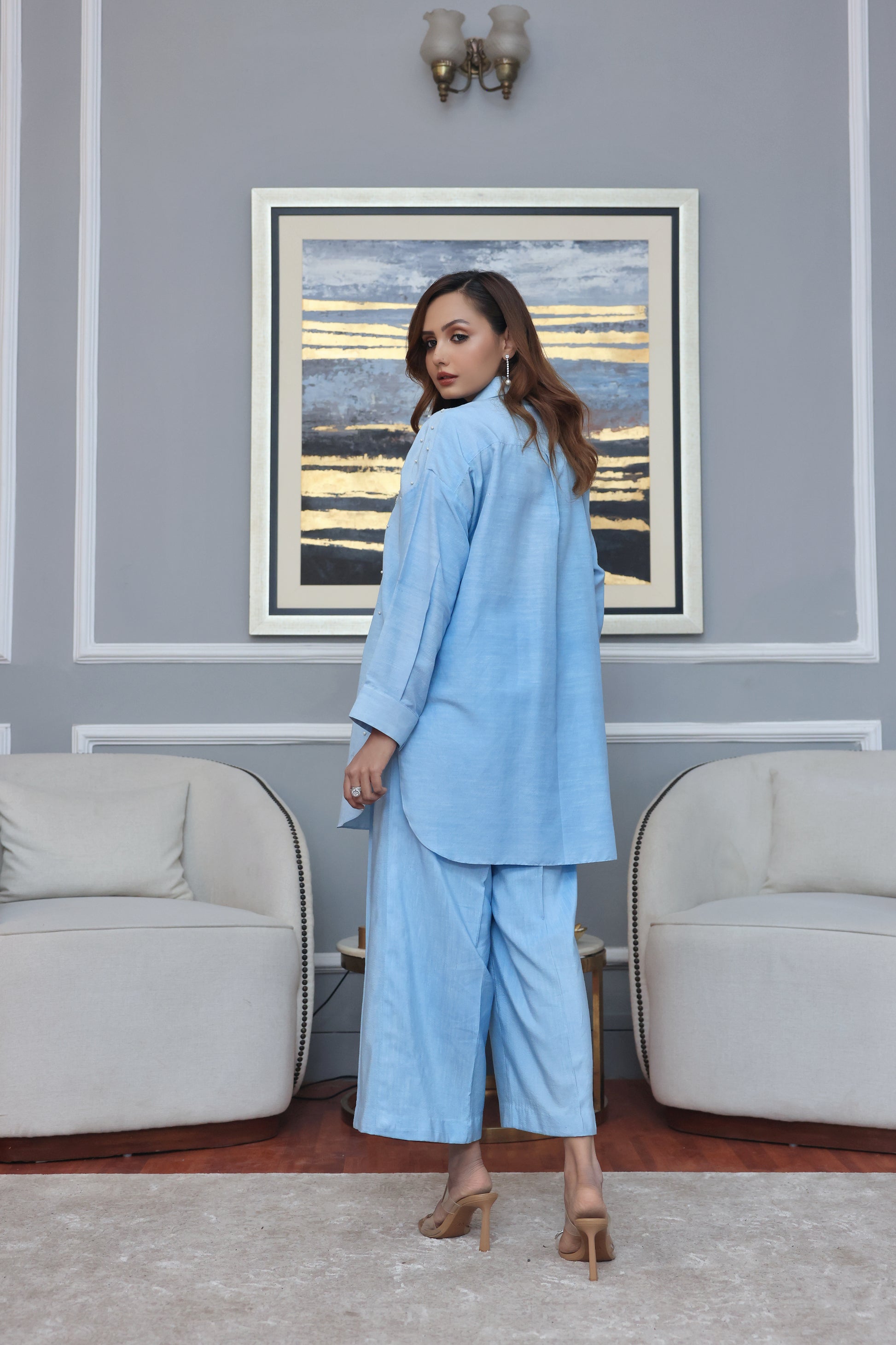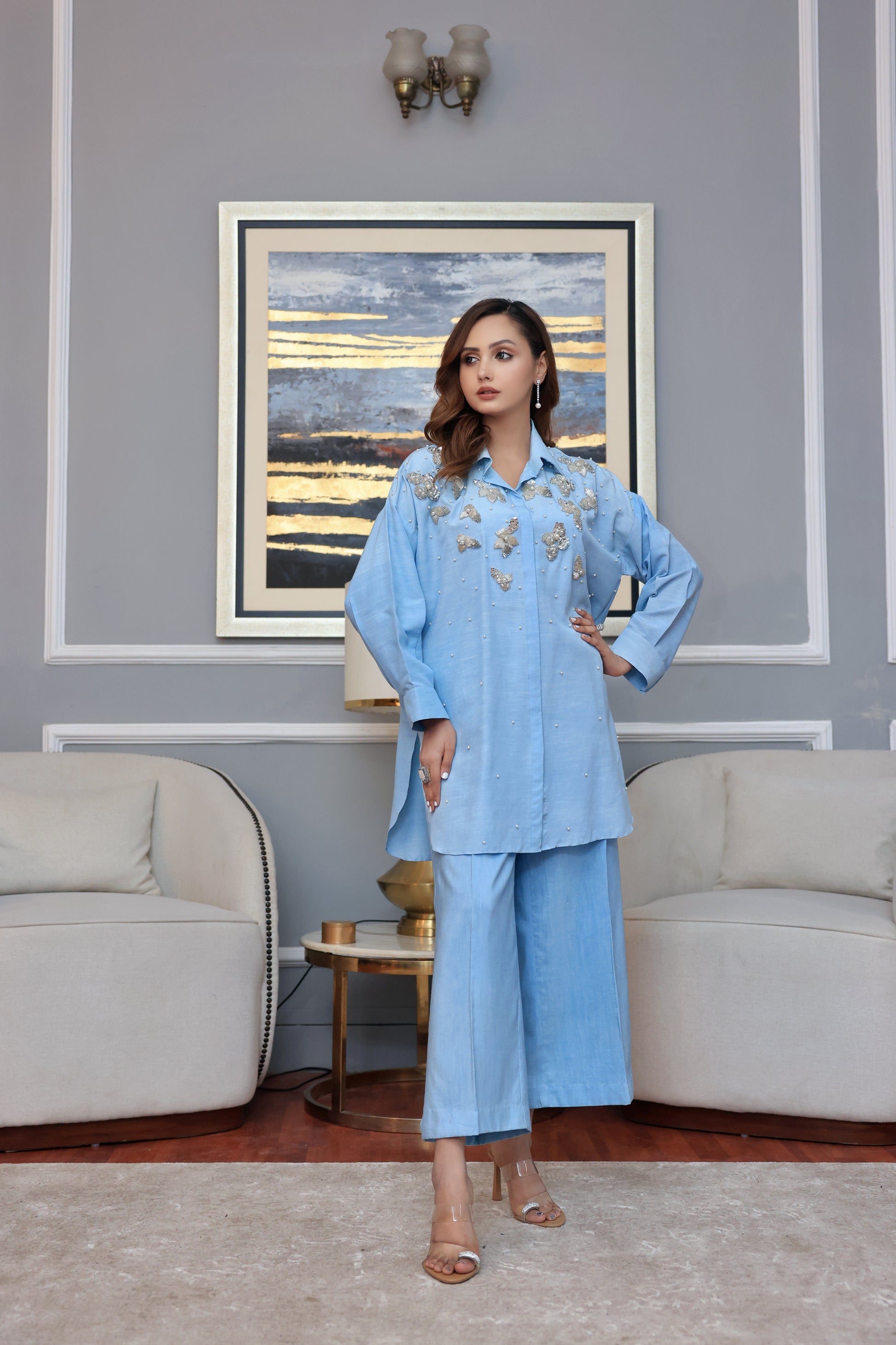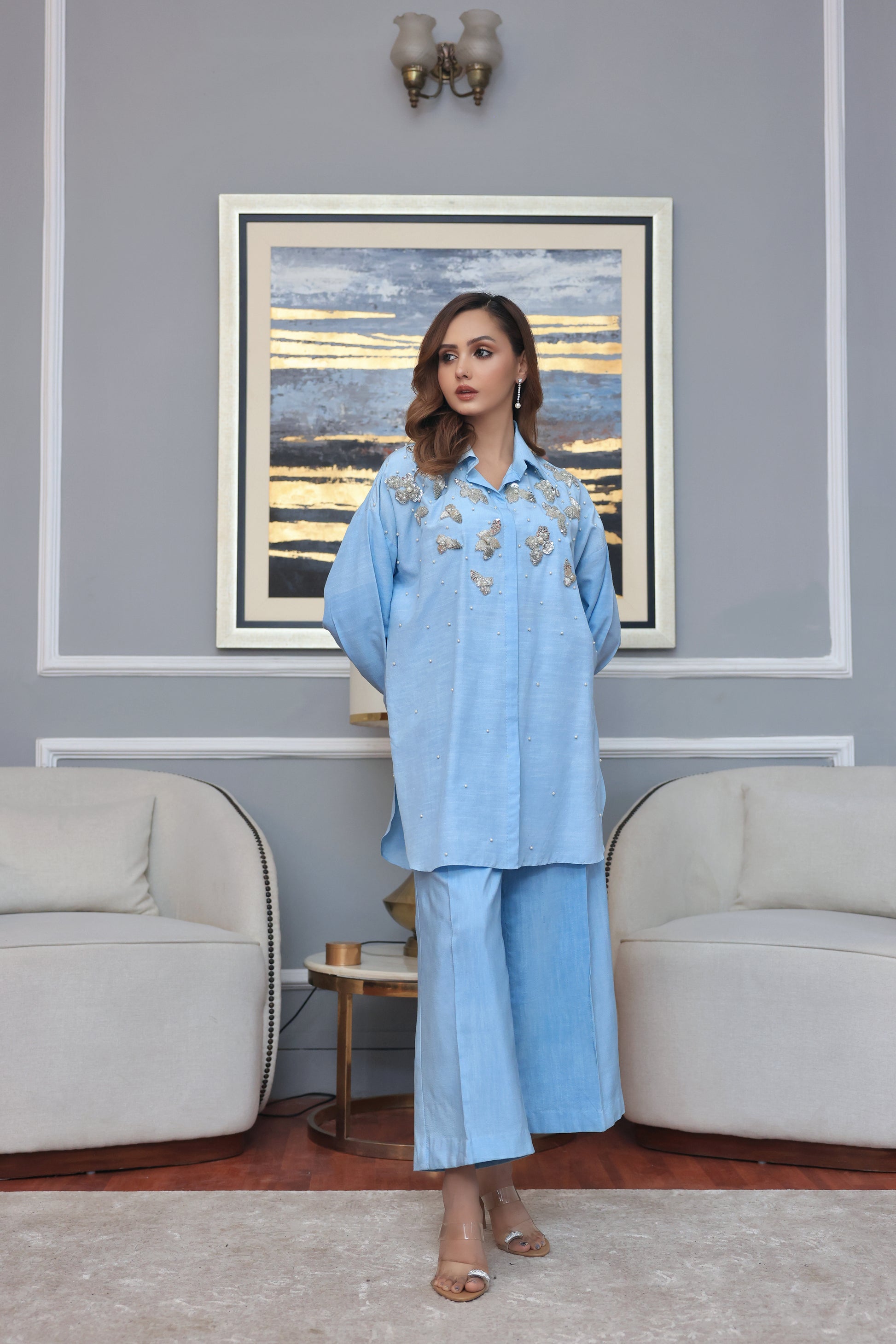 2 Piece Front open dress shirt. Fabric Korean raw silk hand embelished with stones, pearls 3D Flowers and crystals. Paired with loose cut pants.