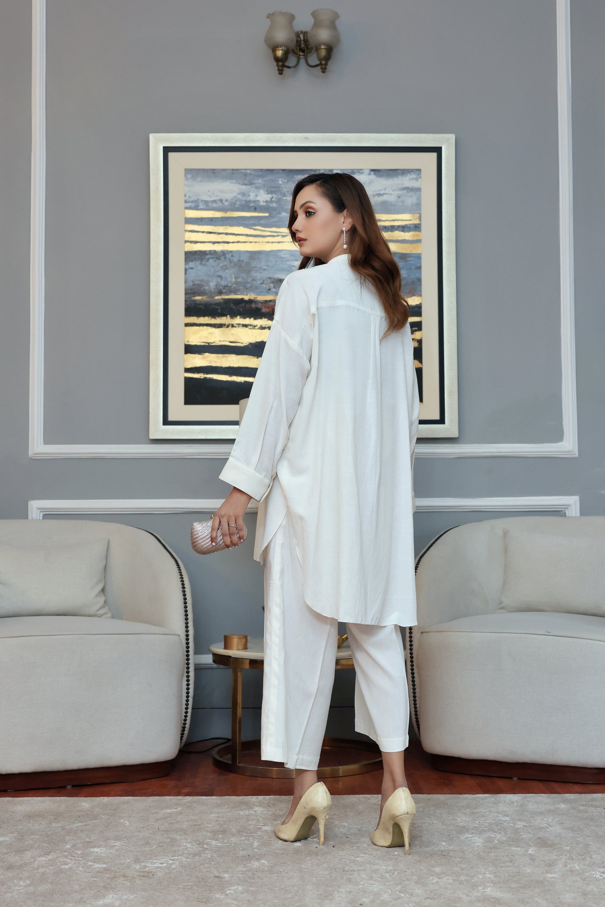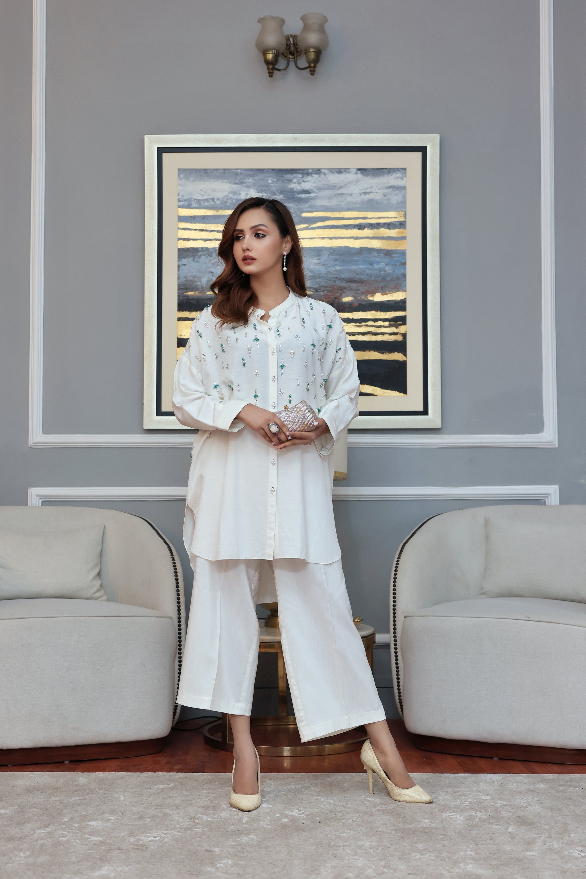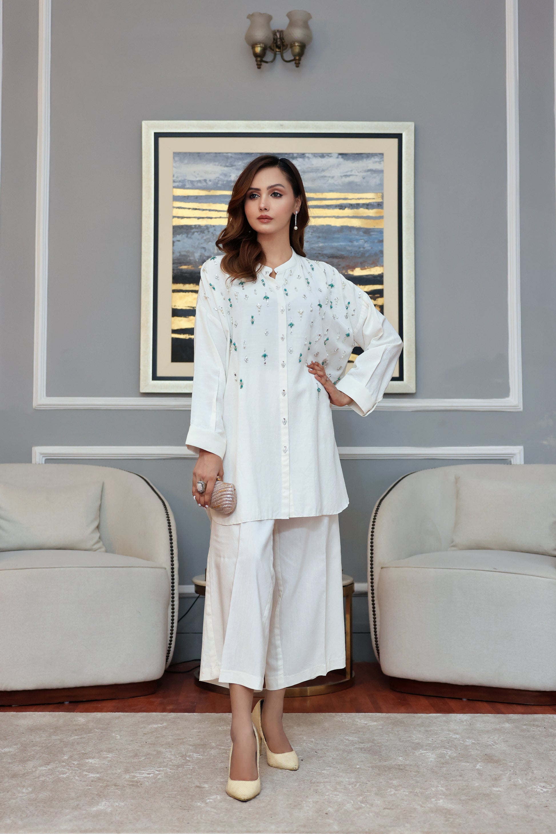 2 Piece Front open dress shirt. Fabric Korean raw silk hand embelished with stones, pearls and crystals. Paired with loose cut pants.