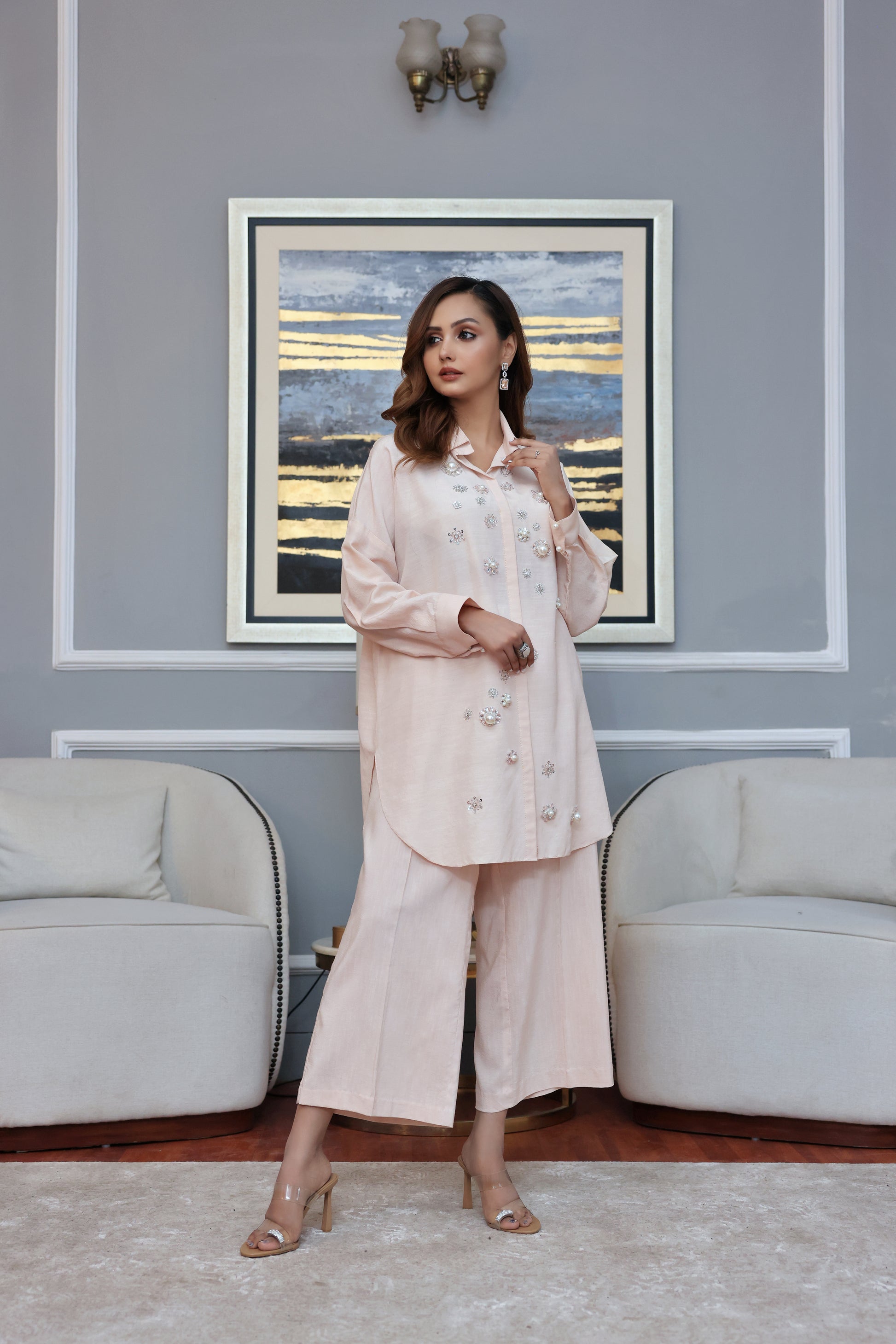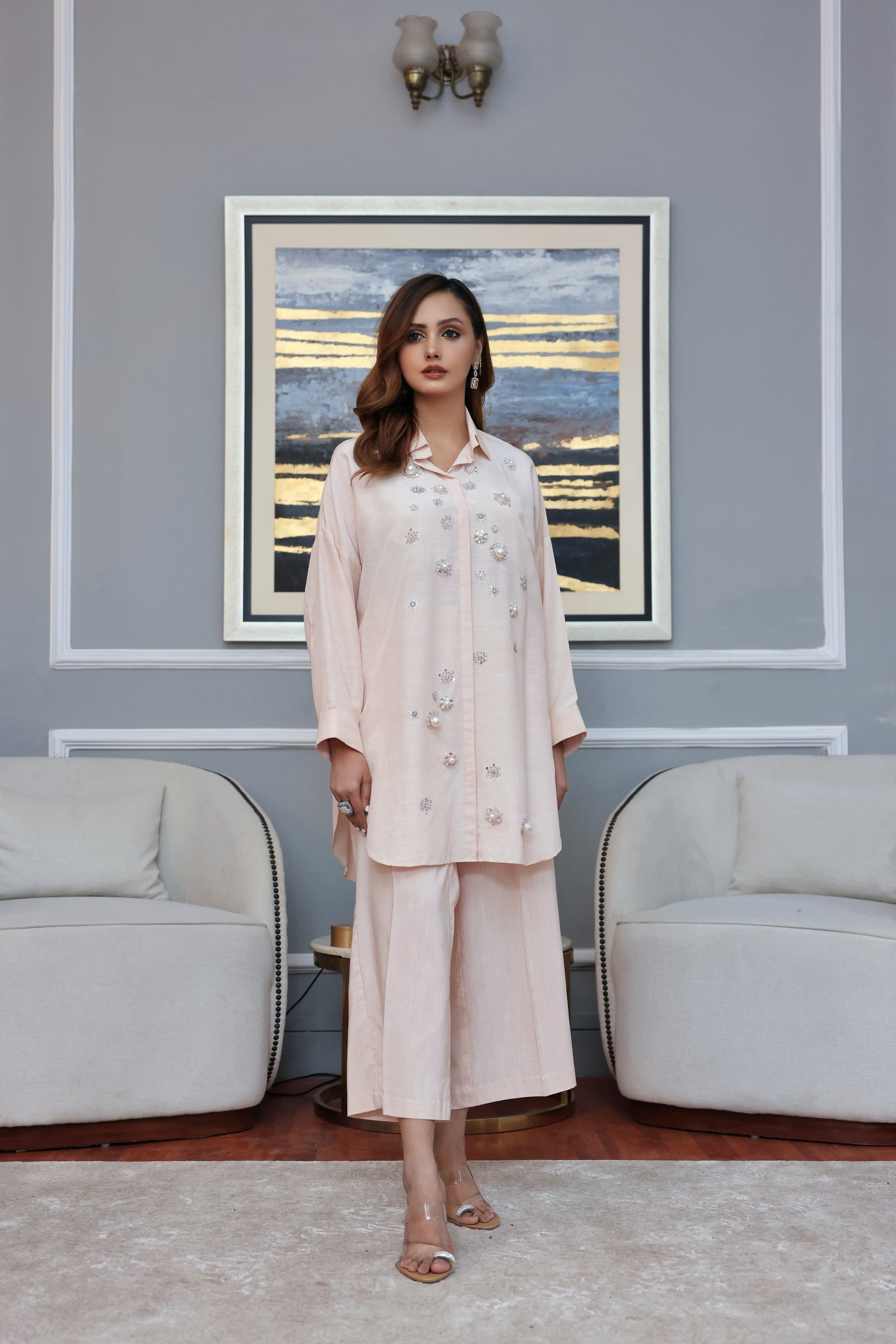 2 Piece Front open dress shirt. Fabric Korean raw silk hand embelished with stones, pearls and crystals. Paired with loose cut pants.
