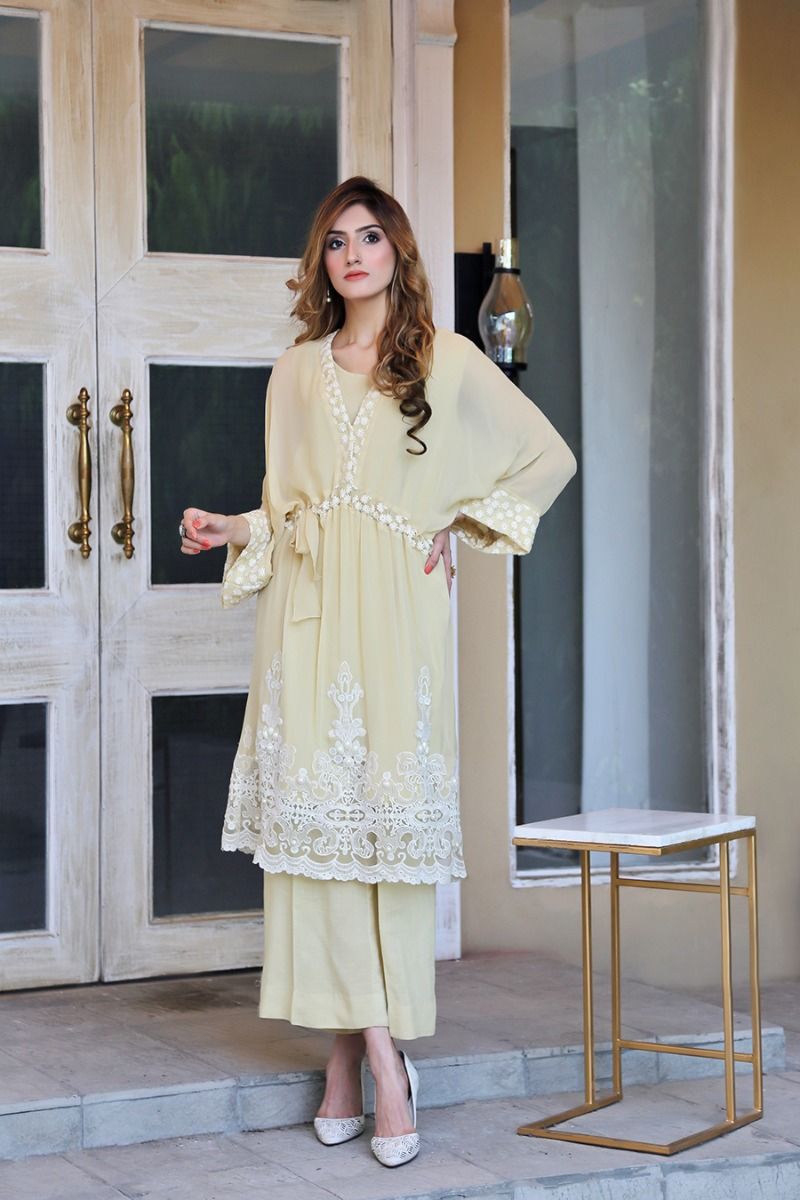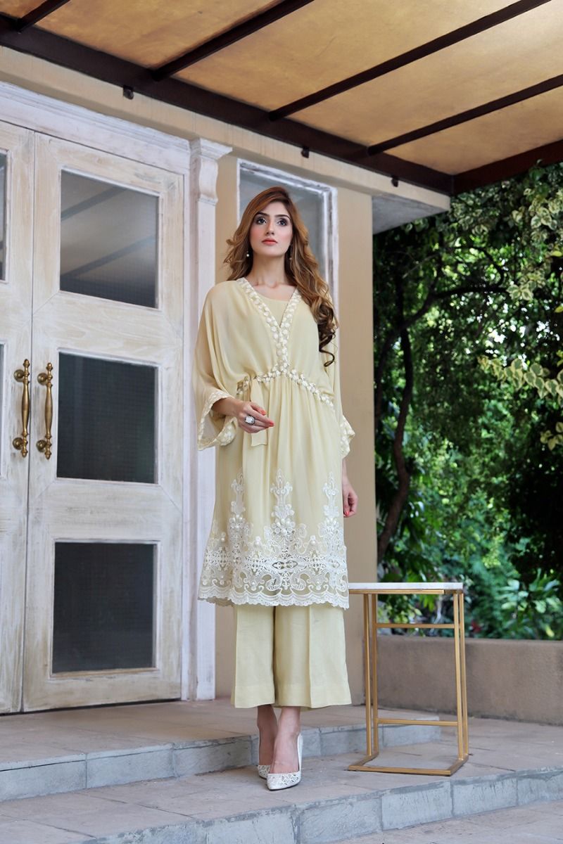 This chiffon beige enemble is adorned with white embroidery around the neckline at the ends of the shirt and sleeves. Paired with loose raw silk trousers, this outfit is your perfect formal wear this season.