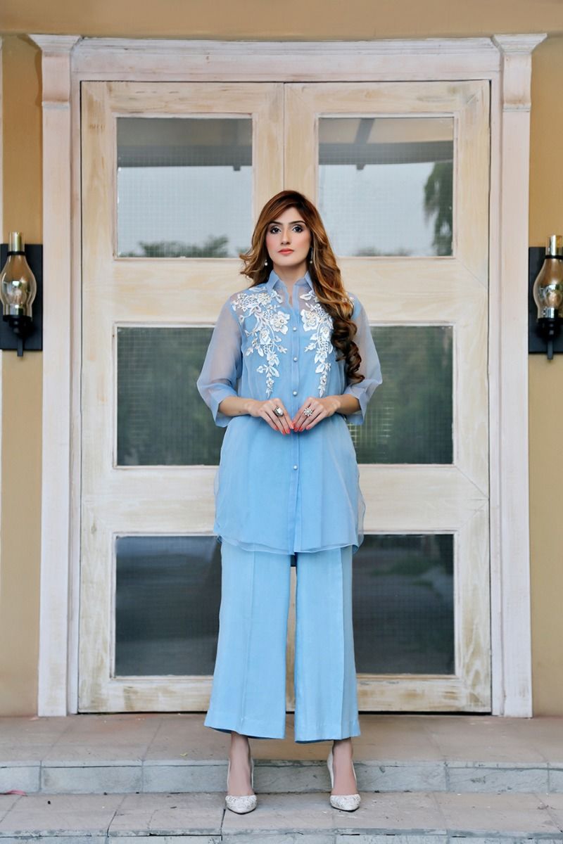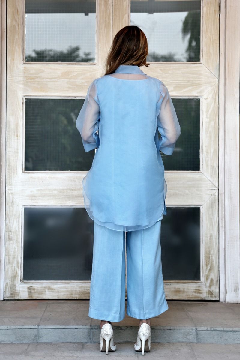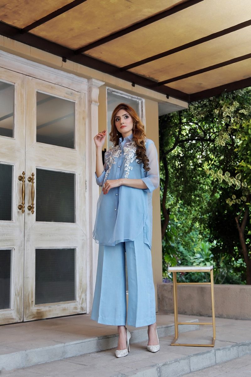 This ice blue organza ensemble is adorned with white embroidery along the neckline and paired with matching ice blue raw silk loose trousers.