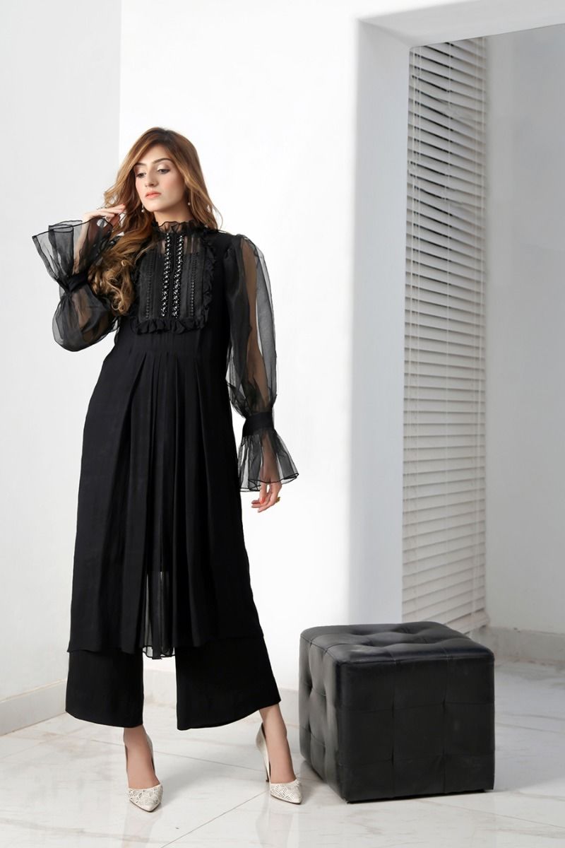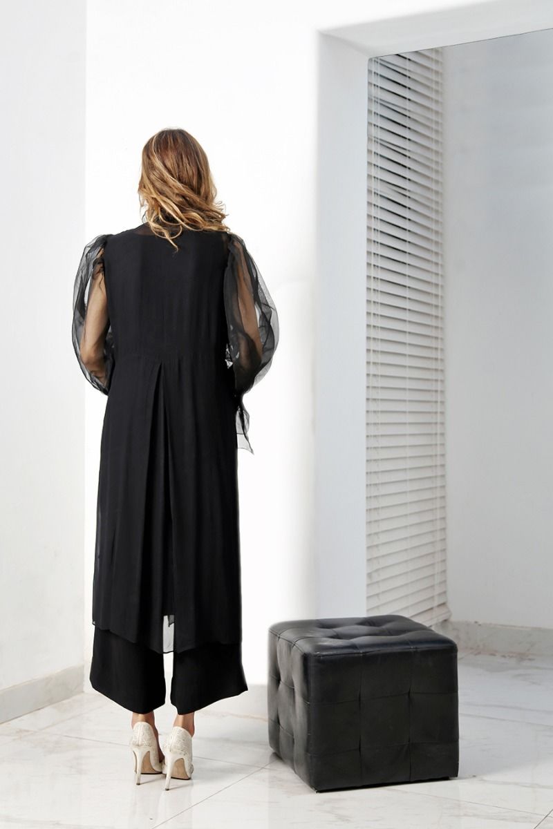 Black is eternal! This black organza ensemble is your perfect formal dinner wear this season. The fabric is light and breezy and styled to perfection for you. It is paired with loose silk trousers.
