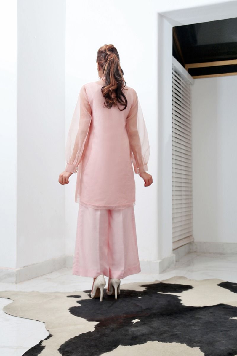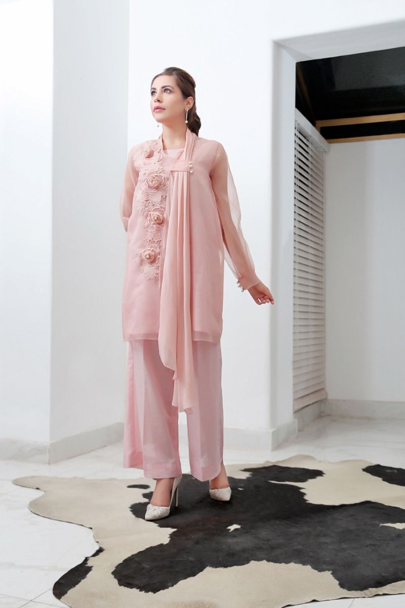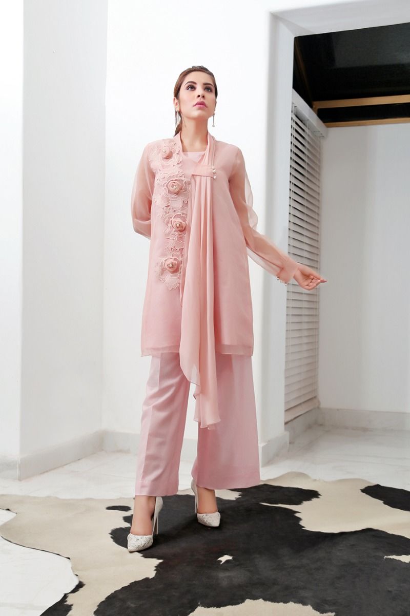 Three piece outfit; shirt, slip, trousers. Material is cotton karandi, chiffon and organza.