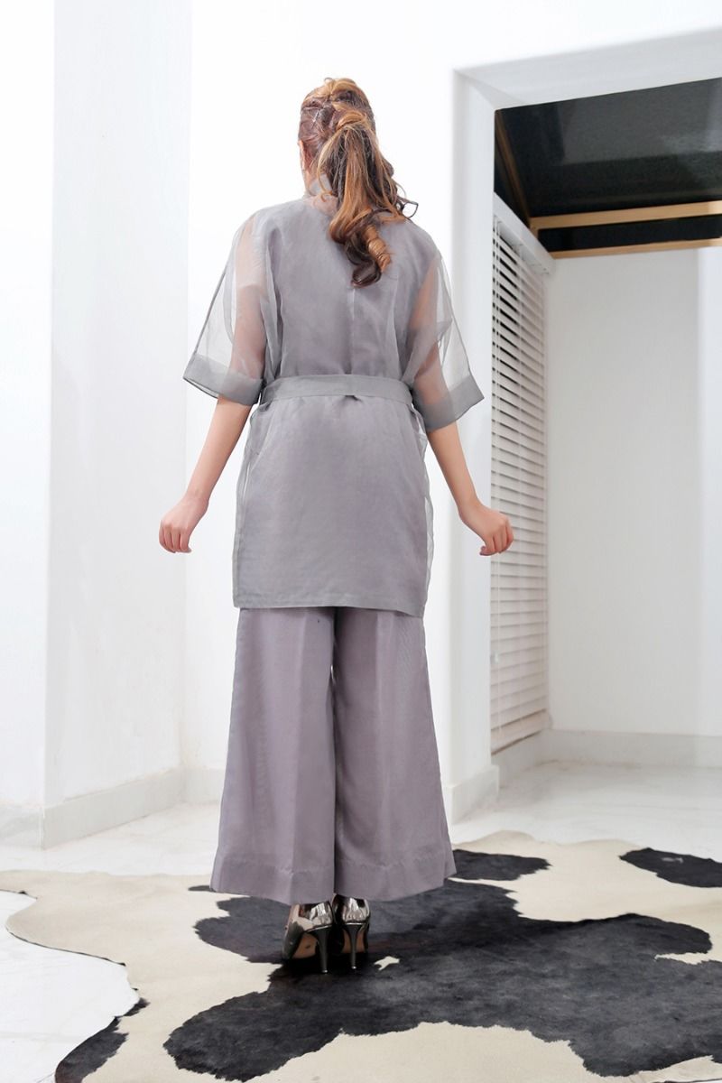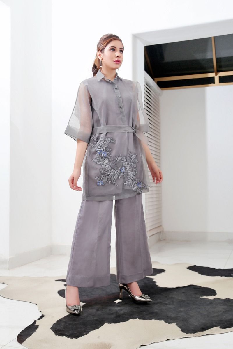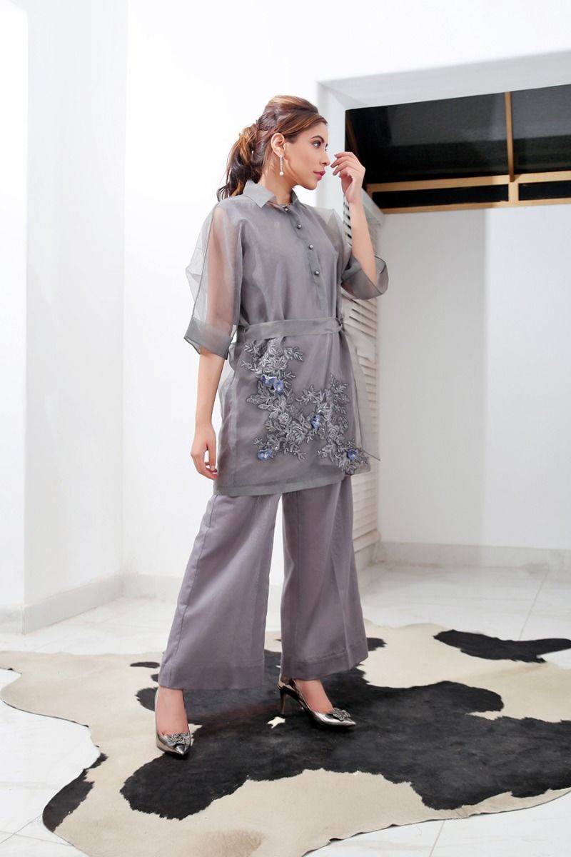 Three piece outfit; shirt, slip, trousers. Material is cotton karandi and organza.